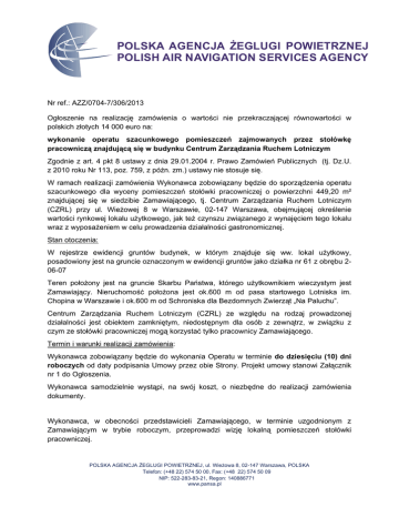 POLSKA AGENCJA ŻEGLUGI POWIETRZNEJ POLISH AIR NAVIGATION SERVICES AGENCY Nr ref.: AZZ/0704-7/306/2013 Ogłoszenie na realizację zamówienia o wartości nie przekraczającej równowartości w polskich złotych 14 000 euro na: wykonanie operatu szacunkowego pomieszczeń zajmowanych przez stołówkę pracowniczą znajdującą się w budynku Centrum Zarządzania Ruchem Lotniczym Zgodnie z art. 4 pkt 8 ustawy z dnia 29.01.2004 r. Prawo Zamówień Publicznych (tj. Dz.U. z 2010 roku Nr 113, poz. 759, z późn. zm.) ustawy nie stosuje się. W ramach realizacji zamówienia Wykonawca zobowiązany będzie do sporządzenia operatu szacunkowego dla wyceny pomieszczeń stołówki pracowniczej o powierzchni 449,20 m² znajdującej się w siedzibie Zamawiającego, tj. Centrum Zarządzania Ruchem Lotniczym (CZRL) przy ul. Wieżowej 8 w Warszawie, 02-147 Warszawa, obejmującej określenie wartości rynkowej lokalu użytkowego, jak też czynszu związanego z wynajęciem tego lokalu wraz z wyposażeniem w celu prowadzenia działalności gastronomicznej. Stan otoczenia: W rejestrze ewidencji gruntów budynek, w którym znajduje się ww. lokal użytkowy, posadowiony jest na gruncie oznaczonym w ewidencji gruntów jako działka nr 61 z obrębu 206-07 Teren położony jest na gruncie Skarbu Państwa, którego użytkownikiem wieczystym jest Zamawiający. Nieruchomość położona jest ok.600 m od pasa startowego Lotniska im. Chopina w Warszawie i ok.600 m od Schroniska dla Bezdomnych Zwierząt „Na Paluchu”. Centrum Zarządzania Ruchem Lotniczym (CZRL) ze względu na rodzaj prowadzonej działalności jest obiektem zamkniętym, niedostępnym dla osób z zewnątrz, w związku z czym ze stołówki pracowniczej mogą korzystać tylko pracownicy Zamawiającego. Termin i warunki realizacji zamówienia: Wykonawca zobowiązany będzie do wykonania Operatu w terminie do dziesięciu (10) dni roboczych od daty podpisania Umowy przez obie Strony. Projekt umowy stanowi Załącznik nr 1 do Ogłoszenia. Wykonawca samodzielnie wystąpi, na swój koszt, o niezbędne do realizacji zamówienia dokumenty. Wykonawca, w obecności przedstawicieli Zamawiającego, w terminie uzgodnionym z Zamawiającym w trybie roboczym, przeprowadzi wizję lokalną pomieszczeń stołówki pracowniczej. POLSKA AGENCJA ŻEGLUGI POWIETRZNEJ, ul. Wieżowa 8, 02-147 Warszawa, POLSKA Telefon: (+48 22) 574 50 00, Fax: (+48 22) 574 50 09 NIP: 522-283-83-21, Regon: 140886771 www.pansa.pl Wykonawca dostarczy Zamawiającemu egzemplarzach w formie papierowej. Operat w dwóch (2) jednobrzmiących Szczegółowe warunki realizacji zamówienia zostały określone w § 3 projektu Umowy stanowiącego Załącznik nr 1 do Ogłoszenia. Oferta powinna zawierać: a) wartość zamówienia netto i brutto w PLN, b) okres ważności oferty (nie krótszy niż 30 dni). Do oferty powinny być dołączone: - aktualny wyciąg z KRS lub kopia aktualnego wpisu do ewidencji działalności gospodarczej, - zaświadczenie o nadaniu numeru NIP, - kopia aktualnych uprawnień zawodowych potwierdzonych kopią świadectwa stwierdzającego nadanie uprawnień i licencji zawodowych zgodnie z Rozporządzeniem Ministra Infrastruktury z dnia 17 lutego 2005 r. w sprawie nadawania uprawnień i licencji zawodowych w dziedzinie gospodarowania nieruchomościami oraz doskonalenia kwalifikacji zawodowych przez rzeczoznawców majątkowych, pośredników w obrocie nieruchomościami i zarządców nieruchomości (Dz. U. z 2005 Nr 35, poz.314). Oferty prosimy składać do dnia 13 sierpnia 2013 r. na adres: Polska Agencja Żeglugi Powietrznej, Dział Zakupów, ul. Wieżowa 8, 02-147 Warszawa, lub pocztą elektroniczną na adres: [email protected] . Po wysłaniu oferty pocztą elektroniczną lub faksem, prosimy o niezwłoczne dosłanie/dostarczenie oryginału oferty na adres: Polska Agencja Żeglugi Powietrznej, Dział Zakupów, ul. Wieżowa 8, 02-147 Warszawa. Dodatkowe informacje: Beata Wyszomirska tel: 22/574-63-53 Magdalena Karolak tel: 22/574-51-53 Strona 2 z 23 Załącznik nr 1 do Ogłoszenia Projekt Umowy Umowa nr PAŻP/13-……./AZZ zawarta w dniu ……………................................................................. w Warszawie pomiędzy: Polską Agencją Żeglugi Powietrznej, z siedzibą w Warszawie, 02-147 Warszawa, ul. Wieżowa 8, REGON: 140886771, będącą podatnikiem VAT o numerze NIP: 522-283-83-21, uprawnioną do wystawiania i otrzymywania faktur, reprezentowaną przez: …………………………….. - ……………………………………………. zwaną dalej „Zamawiającym” lub „Stroną", a ………………………………, z siedzibą w ……………., ……………, ul. …………………., wpisaną do ……………………………………. pod numerem ………………….., REGON: …………………….., będąc….. podatnikiem podatku VAT o numerze NIP: ……………….., uprawnionym do wystawiania i otrzymywania faktur ……………………………… reprezentowanym przez : ……………………………… - ……………………………………………. zwanym dalej „Wykonawcą” lub „Stroną”. §1 PRZEDMIOT UMOWY 1. Przedmiotem Umowy jest sporządzenie przez Wykonawcę na rzecz Zamawiającego operatu szacunkowego, zwanego dalej „Operatem”, dla wyceny pomieszczeń stołówki pracowniczej o powierzchni 449,20 m² znajdującej się w siedzibie Zamawiającego, tj. Centrum Zarządzania Ruchem Lotniczym (CZRL) przy ul. Wieżowej 8 w Warszawie, 02147 Warszawa, obejmującej określenie wartości rynkowej lokalu użytkowego, jak też czynszu związanego z wynajęciem tego lokalu wraz z wyposażeniem w celu prowadzenia działalności gastronomicznej. 2. Wykaz pomieszczeń stołówki (pomieszczeń kuchennych z zapleczem o łącznej powierzchni 200,60 m² i sal konsumpcyjnych o łącznej powierzchni 248,60 m²) stanowi Załącznik nr 1 do Umowy. 3. Szkic sytuacyjny stołówki pracowniczej stanowi Załącznik nr 2 d