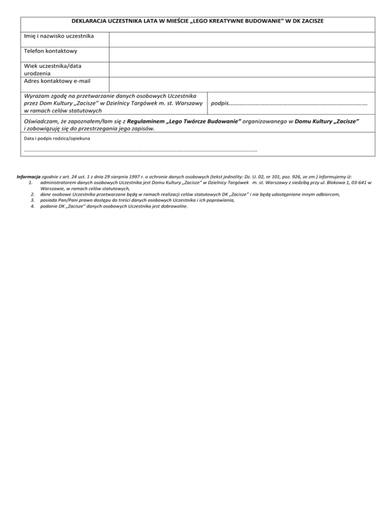 DEKLARACJA UCZESTNIKA LATA W MIEŚCIE „LEGO KREATYWNE BUDOWANIE” W DK ZACISZE Imię i nazwisko uczestnika Telefon kontaktowy Wiek uczestnika/data urodzenia Adres kontaktowy e-mail Wyrażam zgodę na przetwarzanie danych osobowych Uczestnika przez Dom Kultury „Zacisze” w Dzielnicy Targówek m. st. Warszawy w ramach celów statutowych podpis…………………………………………………………………….…………. Oświadczam, że zapoznałem/łam się z Regulaminem „Lego Twórcze Budowanie” organizowanego w Domu Kultury „Zacisze” i zobowiązuję się do przestrzegania jego zapisów. Data i podpis rodzica/opiekuna …………………………………………………………………………………………………………………………………………………………………….…… Informacja zgodnie z art. 24 ust. 1 z dnia 29 sierpnia 1997 r. o ochronie danych osobowych (tekst jednolity: Dz. U. 02, nr 101, poz. 926, ze zm.) informujemy iż: 1. administratorem danych osobowych Uczestnika jest Domu Kultury „Zacisze” w Dzielnicy Targówek m. st. Warszawy z siedzibą przy ul. Blokowa 1, 03-641 w Warszawie, w ramach celów statutowych, 2. dane osobowe Uczestnika przetwarzane będą w ramach realizacji celów statutowych DK „Zacisze” i nie będą udostępniane innym odbiorcom, 3. posiada Pan/Pani prawo dostępu do treści danych osobowych Uczestnika i ich poprawiania, 4. podanie DK „Zacisze” danych osobowych Uczestnika jest dobrowolne.