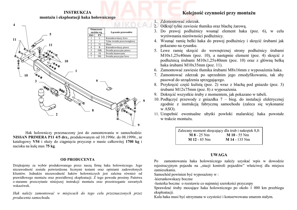 INSTRUKCJA montaŜu i eksploatacji haka holowniczego Kolejność czynności przy montaŜu 4 Oznaczenie zacisku wg ISO PN 1 L 2 + 3 31 4 R 5 58R 6 54 7 58L 5 11 11 Łączenie przewodów Kierunkowskazy lewe Tylne światła przeciwmgłowe Masa Kierunkowskazy prawe Światła pozycyjne prawe Światła hamowania Światła pozycyjne lewe 10 1 10 6 3 9 8 2 1. Zdemontować zderzak. 2. Odkręć tylne zawiesie tłumika oraz blachę Ŝarową. 3. Do prawej podłuŜnicy wsunąć element haka (poz. 6), w celu wyrównania nierówności podłuŜnicy. 4. Wsunąć ramię belki haka do prawej podłuŜnicy i skręcić śrubami jak pokazano na rysunku. 5. Lewe ramię skręcić do wewnętrznej strony podłuŜnicy śrubami M10x1,25x40mm (poz. 10), a następnie element (poz. 4) skręcić z podłuŜnicą śrubami M10x1,25x40mm (poz. 10) oraz z główną belką haka śrubami M10x35mm (poz. 11). 6. Zamontować zawiesie tłumika śrubami M8x16mm z wyposaŜenia haka. 7. Zamontować zderzak po uprzednim jego zmodyfikowaniu, tak aby pasował do urządzenia sprzęgającego. 8. Przykręcić część kulistą (poz. 2) wraz z blachą pod gniazdo (poz. 3) śrubami M12x75mm (poz. 8) z wyposaŜenia. 9. Dokręcić wszystkie śruby z momentem, jak pokazano w tabeli. 10. Podłączyć przewody z gniazdka 7 – bieg. do instalacji elektrycznej zgodnie z instrukcją fabryczną samochodu (zaleca się wykonanie w ASO). 11. Uzupełnić ewentualne ubytki powłoki malarskiej haka powstałe w trakcie montaŜu. 9 Hak holowniczy przeznaczony jest do zamontowania w samochodzie: NISSAN PRIMERA P11 4/5 drz., produkowanym od 10.1996r. do 08.1999r., nr katalogowy V54 i słuŜy do ciągnięcia przyczep o masie całkowitej 1700 kg i nacisku na kulę max 75 kg. Zalecany moment skręcający dla śrub i nakrętek 8,8: M 8 - 25 Nm M 10 - 55 Nm M 12 - 85 Nm M 14 - 135 Nm UWAGA OD PRODUCENTA Dziękujemy za wybór produkowanego przez naszą firmę haka holowniczego. Jego niezawodność została potwierdzona licznymi testami oraz opiniami zadowolonych klientów. JednakŜe niezawodność haków holowniczych jest zaleŜna równieŜ od prawidłowego montaŜu oraz prawidłowej eksploatacji. Z tego powodu prosimy Państwa o staranne przeczytanie niniejszej instrukcji montaŜu oraz przestrzeganie zawartych wskazówek. Hak naleŜy zamontować w miejscach do tego celu przeznaczonych przez producenta samochodu. Po zamontowaniu haka holowniczego naleŜy uzyskać wpis w dowodzie rejestracyjnym pojazdu na „stacji kontroli pojazdów” właściwej dla miejsca zamieszkania. Samochód powinien być wyposaŜony w : -kierunkowskazy boczne -lusterka boczne o rozstawie co najmniej szerokości przyczepy Sprawdzać śruby mocujące haka holowniczego po około 1 000 km przebiegu eksploatacji. Kula haka musi być utrzymana w czystości i konserwowana smarem stałym. PPUH AUTO-HAK S. J. WyposaŜenie haka: Produkcja Haków Holowniczych Henryk & Zbigniew Nejman 76-200 SŁUPSK ul. Słoneczna 16K tel/fax (059) 8-414-414; 8-414-413 E-mail: [email protected] www.autohak.com.pl Hak holowniczy bez wyposaŜenia elektrycznego Klasa: A50-X Nr kat. V54 Przeznaczony do zamontowania w samochodzie: Producent: NISSAN Model: PRIMERA Typ: P11 4/5drz. produkowanego od 10.1996r. do 08.1999r. KARTA GWARANCYJNA Dane techniczne: Wartość siły D : 8,60 kN maksymalna masa przyczepy: 1700 kg maksymalny nacisk na kulę: 75 kg Numer homologacji zgodnie z wytycznymi regulaminu EKG/ONZ 55.01: E20-55R-01 0923 Producent udziela gwarancji niniejszą kartą gwarancyjną na okres 24 miesięcy licząc od dnia zakupu haka holowniczego do samochodu: NISSAN PRIMERA P11 4/5 drz. produkowany od 10.1996r. do 08.1999r. Data produkcji .............................. Data zakupu............................................. Zakres gwarancji obejmuje wyłącznie wady jakościowe wynikające z winy producenta. Gwarancja nie obejmuje natomiast uszkodzeń zawinionych przez nabywcę, wynikających z niewłaściwego montaŜu, uŜytkowania lub konserwacji, uszkodzeń mechanicznych, normalnego zuŜycia podczas eksploatacji itp. Gwarancja udzielona na zakupiony towar nie wyłącza, nie ogranicza ani nie zawiesza uprawnień kupującego wynikających z niezgodności towaru z umową. Reklamacje naleŜy zgłaszać w punkcie sprzedaŜy, składając jednocześnie kartę gwarancyjną. Usunięcie "wady" następuje po stwierdzeniu przez punkt sprzedaŜy wspólnie z producentem słuszności złoŜonej reklamacji. Reklamacja powinna być załatwiona w ciągu 14 dni od dnia uznania reklamacji. Karta gwarancyjna jest niewaŜna jeŜeli nie jest wypełniona i podpisana. Data zgłoszenia reklamacji: ................................................................... INFORMACJA WSTĘPNA Hak holowniczy jest skonstruowany zgodnie z zasadami bezpieczeństwa ruchu drogowego. Hak holowniczy jest elementem wpływającym na bezpieczeństwo jazdy i moŜe zostać zainstalowany wyłącznie przez personel wyspecjalizowany. Niedopuszczalne jest dokonywanie jakichkolwiek zmian w konstrukcji haka. Powoduje to wygaśniecie dopuszczenia do stosowania. W przypadku obecności masy izolacyjnej lub osłony podwozia w miejscu przylegania haka, naleŜy ją usunąć. Nieosłonięte miejsca karoserii oraz wywiercone otwory naleŜy pomalować farbą antykorozyjną. Informacjami wiąŜącymi odnośnie wartości obciąŜeń są dane podawane przez producenta samochodu, względnie wartości maksymalnej masy przyczepy oraz maksymalnego nacisku na kulę, przy czym wartości parametrów haka holowniczego nie mogą być przekroczone. Wzór do obliczania wartości siły D: Maks. masa przyczepy [kg] x Maks. masa samochodu [kg] Maks. masa przyczepy [kg] + Maks. masa samochodu [kg] X 9,81 = 1000 D [kN]