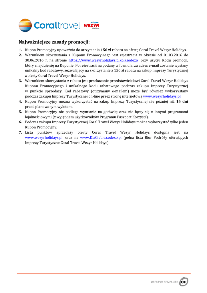 Najważniejsze zasady promocji: 1. Kupon Promocyjny upoważnia do otrzymania 150 zł rabatu na ofertę Coral Travel Wezyr Holidays. 2. Warunkiem skorzystania z Kuponu Promocyjnego jest rejestracja w okresie od 01.03.2016 do 30.06.2016 r. na stronie https://www.wezyrholidays.pl/pl/sodexo przy użyciu Kodu promocji, który znajduje się na Kuponie. Po rejestracji na podany w formularzu adres e-mail zostanie wysłany unikalny kod rabatowy, zezwalający na skorzystanie z 150 zł rabatu na zakup Imprezy Turystycznej z oferty Coral Travel Wezyr Holidays. 3. Warunkiem skorzystania z rabatu jest przekazanie przedstawicielowi Coral Travel Wezyr Holidays Kuponu Promocyjnego i unikalnego kodu rabatowego podczas zakupu Imprezy Turystycznej w punkcie sprzedaży. Kod rabatowy (otrzymany e-mailem) może być również wykorzystany podczas zakupu Imprezy Turystycznej on-line przez stronę internetową www.wezyrholidays.pl. 4. Kupon Promocyjny można wykorzystać na zakup Imprezy Turystycznej nie później niż 14 dni przed planowanym wylotem. 5. Kupon Promocyjny nie podlega wymianie na gotówkę oraz nie łączy się z innymi programami lojalnościowymi (z wyjątkiem użytkowników Programu Paszport Korzyści). 6. Podczas zakupu Imprezy Turystycznej Coral Travel Wezyr Holidays można wykorzystać tylko jeden Kupon Promocyjny. 7. Lista punktów sprzedaży oferty Coral Travel Wezyr Holidays dostępna jest na www.wezyrholidays.pl oraz na www.DlaCiebie.sodexo.pl (pełna lista Biur Podróży oferujących Imprezy Turystyczne Coral Travel Wezyr Holidays)