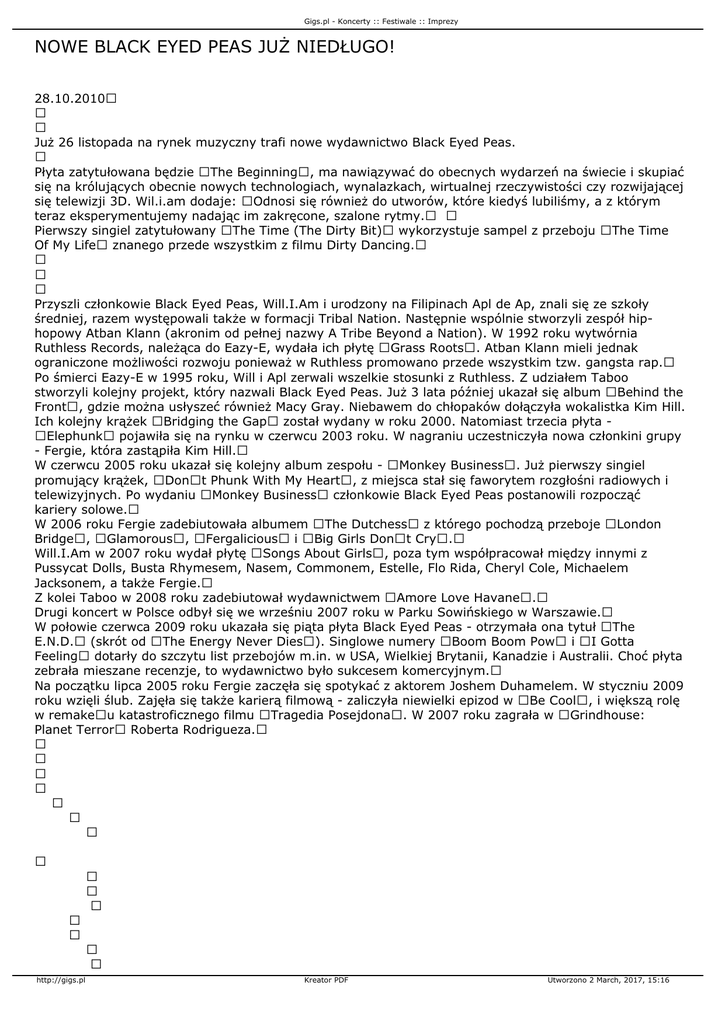 Gigs.pl - Koncerty :: Festiwale :: Imprezy NOWE BLACK EYED PEAS JUŻ NIEDŁUGO! 28.10.2010 Już 26 listopada na rynek muzyczny trafi nowe wydawnictwo Black Eyed Peas. Płyta zatytułowana będzie The Beginning, ma nawiązywać do obecnych wydarzeń na świecie i skupiać się na królujących obecnie nowych technologiach, wynalazkach, wirtualnej rzeczywistości czy rozwijającej się telewizji 3D. Wil.i.am dodaje: Odnosi się również do utworów, które kiedyś lubiliśmy, a z którym teraz eksperymentujemy nadając im zakręcone, szalone rytmy. Pierwszy singiel zatytułowany The Time (The Dirty Bit) wykorzystuje sampel z przeboju The Time Of My Life znanego przede wszystkim z filmu Dirty Dancing. Przyszli członkowie Black Eyed Peas, Will.I.Am i urodzony na Filipinach Apl de Ap, znali się ze szkoły średniej, razem występowali także w formacji Tribal Nation. Następnie wspólnie stworzyli zespół hiphopowy Atban Klann (akronim od pełnej nazwy A Tribe Beyond a Nation). W 1992 roku wytwórnia Ruthless Records, należąca do Eazy-E, wydała ich płytę Grass Roots. Atban Klann mieli jednak ograniczone możliwości rozwoju ponieważ w Ruthless promowano przede wszystkim tzw. gangsta rap. Po śmierci Eazy-E w 1995 roku, Will i Apl zerwali wszelkie stosunki z Ruthless. Z udziałem Taboo stworzyli kolejny projekt, który nazwali Black Eyed Peas. Już 3 lata później ukazał się album Behind the Front, gdzie można usłyszeć również Macy Gray. Niebawem do chłopaków dołączyła wokalistka Kim Hill. Ich kolejny krążek Bridging the Gap został wydany w roku 2000. Natomiast trzecia płyta Elephunk pojawiła się na rynku w czerwcu 2003 roku. W nagraniu uczestniczyła nowa członkini grupy - Fergie, która zastąpiła Kim Hill. W czerwcu 2005 roku ukazał się kolejny album zespołu - Monkey Business. Już pierwszy singiel promujący krążek, Dont Phunk With My Heart, z miejsca stał się faworytem rozgłośni radiowych i telewizyjnych. Po wydaniu Monkey Business członkowie Black Eyed Peas postanowili rozpocząć kariery solowe. W 2006 roku Fergie zadebiutowała albumem The Dutchess z którego pochodzą przeboje London Bridge, Glamorous, Fergalicious i Big Girls Dont Cry. Will.I.Am w 2007 roku wydał płytę Songs About Girls, poza tym współpracował między innymi z Pussycat Dolls, Busta Rhymesem, Nasem, Commonem, Estelle, Flo Rida, Cheryl Cole, Michaelem Jacksonem, a także Fergie. Z kolei Taboo w 2008 roku zadebiutował wydawnictwem Amore Love Havane. Drugi koncert w Polsce odbył się we wrześniu 2007 roku w Parku Sowińskiego w Warszawie. W połowie czerwca 2009 roku ukazała się piąta płyta Black Eyed Peas - otrzymała ona tytuł The E.N.D. (skrót od The Energy Never Dies). Singlowe numery Boom Boom Pow i I Gotta Feeling dotarły do szczytu list przebojów m.in. w USA, Wielkiej Brytanii, Kanadzie i Australii. Choć płyta zebrała mieszane recenzje, to wydawnictwo było sukcesem komercyjnym. Na początku lipca 2005 roku Fergie zaczęła się spotykać z aktorem Joshem Duhamelem. W styczniu 2009 roku wzięli ślub. Zajęła się także karierą filmową - zaliczyła niewielki epizod w Be Cool, i większą rolę w remakeu katastroficznego filmu Tragedia Posejdona. W 2007 roku zagrała w Grindhouse: Planet Terror Roberta Rodrigueza. http://gigs.pl Kreator PDF Utworzono 2 March, 2017, 15:16 Gigs.pl - Koncerty :: Festiwale :: Imprezy http://gigs.pl Kreator PDF Utworzono 2 March, 2017, 15:16