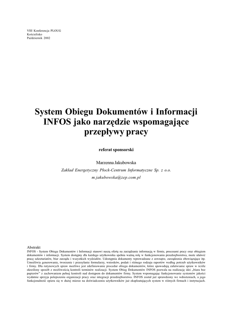 VIII Konferencja PLOUG Koœcielisko PaŸdziernik 2002 System Obiegu Dokumentów i Informacji INFOS jako narzêdzie wspomagaj¹ce przep³ywy pracy referat sponsorski Marzenna Jakubowska Zak³ad Energetyczny P³ock-Centrum Informatyczne Sp. z o.o. [email protected] Abstrakt INFOS - System Obiegu Dokumentów i Informacji stanowi nasz¹ ofertê na zarz¹dzanie informacj¹ w firmie, procesami pracy oraz obiegiem dokumentów i informacji. System dostêpny dla ka¿dego u¿ytkownika spe³nia wa¿n¹ rolê w funkcjonowaniu przedsiêbiorstwa, mo¿e u³atwiæ pracê sekretariatów, biur zarz¹du i wszystkich wydzia³ów. Udostêpnia dokumenty wprowadzane z zewn¹trz, zarz¹dzenia obowi¹zuj¹ce itp. Umo¿liwia generowanie, tworzenie i przesy³anie formularzy, wniosków, podañ i ró¿nego rodzaju raportów wed³ug potrzeb u¿ytkowników i firmy. Dla rutynowych spraw mo¿liwe jest zdefiniowanie procedur obiegu dokumentów, które spowoduj¹ za³atwianie spraw w œciœle okreœlony sposób z mo¿liwoœci¹ kontroli terminów realizacji. System Obieg Dokumentów INFOS pozwala na realizacjê idei „biura bez papierów” z zachowaniem pe³nej kontroli nad dostêpem do dokumentów firmy. System wspomagaj¹c funkcjonowanie systemów jakoœci wydatnie sprzyja polepszeniu organizacji pracy oraz integracji przedsiêbiorstwa. INFOS zosta³ ju¿ sprawdzony we wdro¿eniach, a jego funkcjonalnoœæ opiera siê w du¿ej mierze na doœwiadczeniu u¿ytkowników ju¿ eksploatuj¹cych system w ró¿nych firmach i instytucjach. System Obiegu Dokumentów i Informacji INFOS jako narzędzie wspomagające przepływy pracy 1. 361 ZEP-INFO Sp. z o.o. – informacja o firmie ZEP-INFO Sp. z o.o. jest dostawcą kompleksowych rozwiązań informatycznych dla przedsiębiorstw. Oferta firmy obejmuje zarówno Zintegrowany System Informatyczny w skład, którego wchodzi ponad 20 modułów, jak i kompleksowe dostawy sprzętu, doradztwo, konsultacje i szkolenia. ZEP-INFO Sp. z o.o., to firma z ugruntowaną pozycją na rynku, posiadająca doskonałe zaplecze kadrowe i techniczne, oraz doświadczenie i wiedzę. ZEP-INFO Sp. z o.o. otrzymała w grudniu 2001 roku wydany przez TÜW CERT certyfikat dla systemu zarządzania jakością według normy ISO 9001:1994/EN ISO 9001:1994 w zakresie „Kompleksowej obsługi informatycznej, tj. projektowania, produkcji, wdrażania, serwisu oprogramowania, sieci, sprzętu komputerowego i elektronicznego oraz rozwiązań biznesowych” 2. INFOS – jako recepta na polepszenie organizacji pracy oraz integracji firmy W ostatnich latach wraz z pojawieniem się technologii reorganizacji procesów biznesowych następuje ewolucja systemów „workflow management” w kierunku zarządzania przepływem prac w całym przedsiębiorstwie. Zmiana ta również ewoluuje od systemu dla pojedynczej komórki organizacyjnej do systemu dla całej instytucji, o rozbudowanej strukturze organizacyjnej często rozproszonej terytorialnie. INFOS – System Obiegu Dokumentów i Informacji zarządza informacją w firmie, procesami pracy oraz obiegiem dokumentów i informacji. Należy do klasy systemów „workflow management”, ma na celu zorganizowanie i uporządkowanie zagadnień związanych z: • Tworzeniem dokumentów • Rejestracją dokumentów zewnętrznych • Obiegiem dokumentów w firmie • Archiwizowaniem i wyszukiwaniem dokumentów • Udostępnianiem dokumentów i informacji • Nadzorem nad realizacją procesów biznesowych. System Obiegu Dokumentów i Informacji INFOS firmy ZEP-INFO Sp. z o.o. organizuje zarządzanie dokumentami i informacjami w firmie, wspomaga funkcjonowanie systemów jakości i jest odpowiedzią na potrzeby polepszenia organizacji pracy oraz integracji firmy. INFOS został stworzony w celu usprawnienia procedur przekazywania oraz udostępniania informacji w przedsiębiorstwie. Zadaniem systemu jest zminimalizowanie czasu obiegu dokumentów papierowych a w rezultacie realizacja „wizji biura bez papierów”. Kolejne z założeń systemu to łatwa i wygodna praca z aktualnymi dokumentami, szybka i rzetelna wymiana informacji pomiędzy pracownikami oraz dostępność informacji. Wykorzystanie możliwości, jakie niesie ze sobą wdrożenie systemu INFOS ułatwia zarządzanie przedsiębiorstwem, podejmowanie szybkich i trafnych decyzji oraz rzetelną wymianę informacji. Wspomagając funkcjonowanie systemów jakości wydatnie sprzyja polepszeniu organizacji pracy oraz integracji przedsiębiorstwa. 362 3. Marzenna Jakubowska Zarządzanie informacją w przedsiębiorstwie realizowane za pomocą systemu INFOS INFOS składa się z dwóch części mocno ze sobą zintegrowanych: pierwsza część INFOS-a obejmuje elektroniczną wymianę dokumentów i informacji między użytkownikami systemu, druga zaś zajmuje się przepływem pracy (ang. Workflow). Wymusza sztywne zasady przepływu dokumentów wg wcześniej zdefiniowanych procedur. Nie ma tu miejsca na dowolność. Z tego powodu doskonale nadaje się do obsługi procesów rutynowych, powtarzalnych takich jak: obsługa reklamacji, obsługa zamówień itp. Natomiast do spraw nie rutynowych wykorzystywany jest system obiegu dokumentów bez nałożonych sztywnych procedur obiegu. Dokumenty przechowywane są w centralnej bazie dokumentów, a dostęp do nich wynika z nadanych użytkownikowi uprawnień. W wyniku takiego zapisu łatwiejsze staje się zapanowanie nad dokumentami poprzez ich centralną archiwizację. W systemie istnieje możliwość odtwarzania historii stanów dokumentów. Opcja ta pozwala prześledzić w porządku chronologicznym wędrówkę dokumentu po przedsiębiorstwie jak i również jego historię zmian. 4. Standaryzacja obsługi procesów biznesowych w firmie Standaryzacja obsługi procesów biznesowych odbywa się poprzez sformalizowany ich opis, usprawnienie i kontrolę realizacji. Opis procesu odbywa się na etapie parametryzacji procedur w systemie INFOS. Procedurę dzieli się na ściśle określone etapy jej realizacji, określ