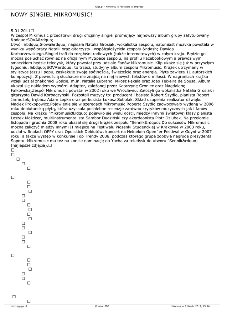 Gigs.pl - Koncerty :: Festiwale :: Imprezy NOWY SINGIEL MIKROMUSIC! 5.01.2011 W zespół Mikrmusic przedstawił drugi oficjalny singiel promujący najnowszy album grupy zatytułowany „SOVA”. Utwór „Słowa” napisała Natalia Grosiak, wokalistka zespołu, natomiast muzyka powstała w wyniku współpracy Natalii oraz gitarzysty i współzałożyciela zespołu – Dawida Korbaczewskiego.Singiel trafi do rozgłośni radiowych (także internetowych) w całym kraju. Będzie go można posłuchać również na oficjalnym MySpace zespołu, na profilu Facebookowym a prawdziwym smaczkiem będzie teledysk, który powstał przy udziale Fanów Mikromusic. Klip ukaże się już w przyszłym tygodniu. „SOVA” to trzeci, studyjny album zespołu Mikromusic. Krążek utrzymany w stylistyce jazzu i popu, zaskakuje swoją spójnością, świeżością oraz energią. Płyta zawiera 11 autorskich kompozycji. Z pewnością słuchacze nie znajdą na niej łzawych tekstów o miłości. W nagraniach krążka wzięli udział znakomici Goście, m.in. Natalia Lubrano, Miłosz Pękala oraz Joao Teixeira de Sousa. Album ukazał się nakładem wytwórni Adapter, założonej przez Katarzynę Groniec oraz Magdalenę Falkowską.Zespół Mikromusic powstał w 2002 roku we Wrocławiu. Założyli go wokalistka Natalia Grosiak i gitarzysta Dawid Korbaczyński. Pozostali muzycy to: producent i basista Robert Szydło, pianista Robert Jarmużek, trębacz Adam Lepka oraz perkusista Łukasz Sobolak. Skład uzupełnia realizator dźwięku Maciek Prokopowicz.Pojawienie się w szeregach Mikromusic Roberta Szydło zaowocowało wydaną w 2006 roku debiutancką płytą, która uzyskała pochlebne recenzje zarówno krytyków muzycznych jak i fanów zespołu. Na krążku "Mikromusic” pojawiło się wielu gości, między innymi światowej klasy pianista Leszek Możdżer, multiinstrumentalista Sambor Dudziński czy akordeonista Piotr Dziubek. Na przełomie listopada i grudnia 2008 roku ukazał się drugi krążek zespołu "Sennik”.Do sukcesów Mikromusic można zaliczyć między innymi II miejsce na Festiwalu Piosenki Studenckiej w Krakowie w 2003 roku, udział w finałach OPPY oraz Opolskich Debiutów, koncert na Heineken Open`er Festiwal w Gdyni w 2007 roku, a także występ w konkursie Top Trendy 2008, podczas którego grupa zdobyła nagrodę prezydenta Sopotu. Mikromusic ma też na koncie nominację do Yacha za teledysk do utworu "Sennik” (najlepsze zdjęcia). http://gigs.pl Kreator PDF Utworzono 2 March, 2017, 15:16 Gigs.pl - Koncerty :: Festiwale :: Imprezy http://gigs.pl Kreator PDF Utworzono 2 March, 2017, 15:16 Gigs.pl - Koncerty :: Festiwale :: Imprezy http://gigs.pl Kreator PDF Utworzono 2 March, 2017, 15:16 Gigs.pl - Koncerty :: Festiwale :: Imprezy http://gigs.pl Kreator PDF Utworzono 2 March, 2017, 15:16 Gigs.pl - Koncerty :: Festiwale :: Imprezy http://gigs.pl Kreator PDF Utworzono 2 March, 2017, 15:16