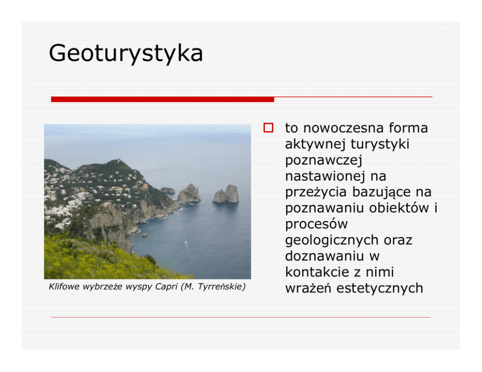 Geoturystyka Klifowe wybrzeże wyspy Capri (M. Tyrreńskie) to nowoczesna forma aktywnej turystyki poznawczej nastawionej na przeżycia bazujące na poznawaniu obiektów i procesów geologicznych oraz doznawaniu w kontakcie z nimi wrażeń estetycznych Geoturystyka Wygasły stratowulkan na wyspie Salina europejskie doświadczenia w tej dziedzinie wskazują, że wiedza o procesach przyrodniczych pomaga stworzyć fascynującą ofertę rekreacyjną, która przyciąga tłumy turystów i przynosi pokaźne efekty ekonomiczne. Do kogo adresujemy tę ofertę? Do miłośników nauk o Ziemi, animatorów turystyki, ekologów, hobbystów i tych którzy będą pracować w organizacjach samorządowych, gospodarczych i własnych firmach kreując różne przedsięwzięcia turystyczne Studenci geografii na Orlej Perci w Tatrach Czego chcemy Was nauczyć? Czynny wulkan Stromboli (Wyspy Liparyjskie) patrzenia na przyrodę nieożywioną, tak żeby ją zrozumieć i móc przekazać tę wiedzę innym pokażemy najciekawsze geoturystyczne obiekty na świecie, wyjaśniając ich genezę wskażemy na możliwości kreowania nowych obiektów geoturystycznych z wprowadzeniem ich do już istniejących tras turystycznych Czego chcemy Was nauczyć? Przybliżymy Wam wiedzę o organizacji imprez geoturystycznych A ponadto pokażemy: Wąwóz krasowy w Dolomitach jak ocenić potencjał geoturystyczny różnych regionów jak przygotować dokumentację obiektów i ścieżek przyrody nieożywionej jak przygotować informatory, przewodniki i mapy geoturystyczne Poznawanie obiektów geoturystycznych Szczególną wagę przywiązujemy do praktyki terenowej Niektóre z ćwiczeń kameralnych będą wspomagane zajęciami w terenie Czynny gejzer k. Spiskiego Zamku (Słowacja) Poznaj program specjalności geoturystyka Lodowiec Unterer Griendelwaldgletscher w Alpach Berneńskich (Szwajcaria) Specjalność będzie prowadzona na dwóch kierunkch: geografia i turystyka z rekreacją Zarówno na studiach I stopnia (licencjackich) jak i II stopnia (magisterskich) Geoturystyka na kierunku geografia (studia stacjonarne I stopnia) Podstawy geoturystyki 15 (w) - zal. 3 sem. Atrakcje geoturystyczne świata 30 (w) - egz. 3 sem. Kamień w architekturze i sztuce 15 (w) 15 (ćw) zal. 3 sem. Informacja i promocja w geoturystyce 15 (w) 15 (ćw) zal. 4 sem. Obsługa ruchu turystycznego 15 (w) 15 (ćw) zal. 4 sem. Atrakcje geoturystyczne Polski 15 (w) 30 (ćw) egz. 5 sem. Speleologia i turystyka jaskiniowa 15 (w) - zal. 5 sem. Kolekcjonerstwo minerałów skał i skamieniałości 15 (w) - zal. 5 sem. Geoochrona 15 (w) - egz. 6 sem. - 30 (ćw) zal. 6 sem. 15 (w) - zal. 6 sem. - 30 (ćw) zal. 6 sem. Internet jako narzędzie w geoturystyce Prawne i ekonomiczne podstawy geoturystyki Ćwiczenia terenowe z geoturystyki Geoturystyka na kierunku geografia (studia niestacjonarne I stopnia) Podstawy geoturystyki 8 (w) - zal. 2 rok Atrakcje geoturystyczne świata 15 (w) - egz. 2 rok Kamień w architekturze i sztuce 7 (w) 7 (ćw) zal. 3 rok Informacja i promocja w geoturystyce 7 (w) 7 (ćw) zal. 2 rok Obsługa ruchu turystycznego 8 (w) 7 (ćw) zal. 2 rok Atrakcje geoturystyczne Polski 7 (w) 15 (ćw) egz. 2 rok Speleologia i turystyka jaskiniowa 8 (w) - zal. 3 rok Kolekcjonerstwo minerałów skał i skamieniałości 8 (w) - zal. 3 rok Geoochrona 8 (w) - egz. 3 rok - 15 (ćw) zal. 3 rok 8 (w) - zal. 3 rok - 15 (ćw) zal. 3 rok Internet jako narzędzie w geoturystyce Prawne i ekonomiczne podstawy geoturystyki Ćwiczenia terenowe z geoturystyki Geoturystyka na kierunku turystyka i rekreacja (studia stacjonarne I stopnia) Przedmioty Wykł. Ćwicz. semestr Atrakcje geoturystyczne świata 30 (w) 15 (ćw) egz. 3 sem. Kolekcjonerstwo minerałów skał i skamieniałości* 30 (w) 30 (ćw) zal. 3 sem. Atrakcje geoturystyczne Polski * 30 (w) 15 (ćw) zal. 4 sem. Krajobrazy roślinne 15 (w) - zal. 4 sem. Kamień w architekturze i sztuce * 15 (w) 15 (ćw) egz. 4 sem. Speleologia i turystyka jaskiniowa 15 (w) - zal. 5 sem. Informacja i promocja w geoturystyce 5 (w) 25 (ćw) zal. 5 sem. Turystyka w obszarach górniczych 15 (w) - egz. 5 sem. Geoturystyka w obiektach chronionych 15 (w) - zal. 6 sem. Internet jako narzędzie w geoturystyce - 30 (ćw) zal. 6 sem. *dla przedmiotów oznaczonych gwiazdką przewidziane są zajęcia terenowe Geoturystyka na kierunku turystyka i rekreacja (studia niestacjonarne I stopnia) Przedmioty Wykł. Ćwicz. rok Atrakcje geoturystyczne świata 15 (w) 7 (ćw) egz. 2 rok Kolekcjonerstwo minerałów skał i skamieniałości 15 (w) 15 (ćw) zal. 3 rok Atrakcje geoturystyczne Polski 15 (w) 7 (ćw) zal. 2 rok Krajobrazy roślinne 8 (w) - zal. 2 rok Kamień w architekturze i sztuce 7 (w) 7 (ćw) egz. 2 rok Speleologia i turystyka jaskiniowa 8 (w) - zal. 3 rok Informacja i promocja w geoturystyce 3 (w) 12 (ćw) zal. 3 rok Turystyka w obszarach górniczych 8 (w) - egz. 3 rok Geoturystyka w obiektach chronionych 8 (w) - zal. 3 rok Internet jako narzędzie w geoturystyce - 15 (ćw) zal. 3 rok Jeżeli masz pytania, chętnie na nie odpowiemy Zapraszamy do kontaktu osobistego lub mailowego: Dr hab. Krzysztof Bąk, prof. UP; pok. 534; [email protected] Dr Tomasz Bryndal; pok. 534; [email protected] Dr hab. inż. Grzegorz Haczewski, prof. UP; pok. 521; [email protected] Dr hab. Józef Kukulak, prof. UP; pok. 522; [email protected] Dr hab. inż. Radosław Tarkowski, prof. UP; pok. 522; [email protected] Jak na tle jeziora polodowcowego Yarlong Tso w Tybecie Jeśli kochasz przyrodę, wybierz geoturystykę jako specjalność Twoich studiów A może to jest to miejsce dokąd będziesz organizował imprezy geoturystyczne? Mt. Everest widziany z Doliny Rongbuk w Tybecie (fot. z wys. 5200 m npm) Prezentację przygotował: Krzysztof Bąk; [email protected]