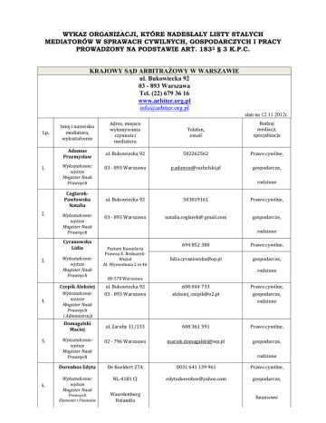 WYKAZ ORGANIZACJI, KTÓRE NADESŁAŁY LISTY STAŁYCH MEDIATORÓW W SPRAWACH CYWILNYCH, GOSPODARCZYCH I PRACY PROWADZONY NA PODSTAWIE ART. 1832 § 3 K.P.C. KRAJOWY SĄD ARBITRAŻOWY W WARSZAWIE ul. Bukowiecka 92 03 - 893 Warszawa Tel. (22) 679 36 16 www.arbiter.org.pl [email protected] stan na 12.11.2012r. Lp. 1. Imię i nazwisko mediatora, wykształcenie Adres, miejsce wykonywania czynności mediatora Telefon, email Rodzaj mediacji, specjalizacja Adamus Przemysław ul. Bukowiecka 92 502262562 Prawo cywilne, 03 - 893 Warszawa [email protected] gospodarcze, Wykształcenie: wyższe Magister Nauk Prawnych CeglarekPawłowska Natalia 2. Wykształcenie: wyższe Magister Nauk Prawnych Cyranowska Lidia 3. Wykształcenie: wyższe Magister Nauk Prawnych Czepik Aleksiej 4. 6. ul. Bukowiecka 92 503019161 Prawo cywilne, 03 - 893 Warszawa natalia.ceglarek@ gmail.com gospodarcze, rodzinne Pactum Kancelaria Prawna E. BednarekWojtal Al. Wyzwolenia 2 m 46 694 852 388 Prawo cywilne, [email protected] gospodarcze, rodzinne 00-570 Warszawa ul. Bukowiecka 92 03 - 893 Warszawa 608 044 733 [email protected] Prawo cywilne, gospodarcze, rodzinne ul. Zaruby 11/133 608 361 591 Prawo cywilne, Wykształcenie: wyższe Magister Nauk Prawnych 02 - 796 Warszawa [email protected] gospodarcze, Dorenbos Edyta De Koeldert 27A 0031 641 139 961 Prawo cywilne, Wykształcenie: wyższe Magister Nauk NL-4181 CJ [email protected] gospodarcze, Wykształcenie: wyższe Magister Nauk Prawnych i Administracji Domagalski Maciej 5. rodzinne Prawnych Ekonomii i Finansów rodzinne Waardenburg Holandia finansowe Gałęzowski Tomasz 7. 8. Dom Kultury LSM ul. K.Wallenroda 4a Hatłas Szymon ul. Bukowiecka 92 608 159 867 Prawo cywilne, Wykształcenie: wyższe Magister Europeistyki 03 - 893 Warszawa [email protected] gospodarcze, 22 628 78 95 Prawo cywilne, [email protected] gospodarcze, Wykształcenie: wyższe Magister Nauk Prawnych Jagodzińska Bajkowska Anna 10. Wykształcenie: wyższe Magister Nauk Prawnych Kamieńska Joanna 11. ul. Płochocińska 107P 03-044 Warszawa rodzinne ul. Płochocińska 107P Wykształcenie: wyższe Magister Executive MBA Lenarczyk Michał Wykształcenie: wyższe Magister Nauk Prawnych Lenart Tomasz 15. 880 175 238 Wykształcenie: wyższe Magister Nauk Prawnych Prawo cywilne, gospodarcze, 03 -044 Warszawa [email protected] rodzinne Kancelaria Radców 606 885 885 Prawo cywilne, Pactum Kancelaria Prawna E. BednarekWojtal Al. Wyzwolenia 2 m 46 00-570 Warszawa Kucharska Szydelska Małgorzata gospodarcze, rodzinne Prawnych S.C. 12. 14. [email protected] 20 - 607 Lublin Wykształcenie: wyższe ul. E. Orzeszkowej Magister Nauk 32/502 Prawnych 15 - 084 Białystok Kęciak Krzysztof 13. Prawo cywilne, Wykształcenie: wyższe Magister Socjologii Jagodziński Paweł 9. 519 198 417 Kancelaria Radcy Prawnego ul. Polna 48 lok.19 00-644 Warszawa Kancelaria Prawnicza Lenar & Lawyers ul. Piękna 3/8 00 - 539 Warszawa Kancelaria Radcy Prawnego ul. Supniewskiego 9/1 31-527 Kraków gospodarcze, [email protected] rodzinne 22 628 78 95 Prawo cywilne, gospodarcze, [email protected] rodzinne 603 794 218 Prawo cywilne, gospodarcze, malgorzata.szydelska @poczta.neostrada.pl rodzinne 508 164 678 Prawo cywilne, [email protected] gospodarcze, rodzinne 604 062 174 Prawo cywilne, [email protected] gospodarcze, rodzinne Magdziarczyk Małgorzata 16. Wykształcenie: wyższe Doktor Nauk Prawnych Nowak Walentyna 17. Wykształcenie: wyższe Magister Nauk Prawnych Ostrowski Wojciech 18. Wykształcenie: wyższe Magister Nauk Prawnych Pniewska Franciszka 19. 20. Wykształcenie: wyższe Magister Nauk Prawnych Rachelski Stanisław Wykształcenie: wyższe Magister Nauk Prawnych Radzik Magdalena 21. 22. Prawnego 605 730 408 [email protected] 601 302 222 [email protected] Prawo cywilne, gospodarcze, rodzinne 00 - 377 Warszawa Kancelaria Prawnicza gospodarcze, rodzinne ul. Kard. B. Kominka 2A/l 45 - 032 Opole ul. Czerwonego Krzyża 6/30 Prawo cywilne, (22) 438 94 03 Prawo cywilne, gospodarcze, Rachelski i Wspólnicy [email protected] ul. Żurawia 22 00 - 515 Warszawa rodzinne Kancelaria Radcy 502 340 344 Prawo cywilne, Prawnego (94) 346 2499 gospodarcze, ul. Piłsudskiego 2/6 [email protected] rodzinne Kancelaria Prawnicza (22) 438 94 03 Prawo cywilne, Rachelski i Wspólnicy [email protected] gospodarcze, 75 - 509 Koszalin rodzinne ul. Żurawia 22 00 - 515 Warszawa ul. Bukowiecka 92 505 455 802 Prawo cywilne, Wykształcenie: wyższe Magister Nauk Prawnych 03 - 893 Warszawa [email protected] gospodarcze, Rola Piotr ul. Bukowiecka 92 513 658 171 Prawo cywilne, Wykształcenie: wyższe Magister Nauk Prawnych 03 - 893 Warszawa [email protected] gospodarcze, Rozpędowska Dobrosława 23. Kancelaria Radcy Wykształcenie: wyższe Magister Ekonomii rodzinne rodzinne Kancelaria Radcy Prawnego ul. Polna 48 lok.19 00-644 Warszawa 603 379 694 Prawo cywilne, [email protected] gospodarcze, rodzinne ul. Bukowiecka 92 601 262 527 Prawo cywilne, 03 - 893 Warszawa [email protected] gospodarcze, rodzinne ul. Bukowiecka 92 500 231 503 Prawo cywilne, Wykształcenie: wyższe Magister Socjologii 03 - 893 Warszawa [email protected] gospodarcze, Urbański Tomasz ul. Damroki 15D/8 Wykształcenie: wyższe Magister Nauk Prawnych 81- 572 Gdynia Sujkowska Maja 24. 25. 26. 27. Wykształcenie: wyższe Magister Nauk Prawnych Szczepański Jan 29. 30. [email protected] Prawo cywilne, gospodarcze, rodzinne Kancelaria Doradztwa (62) 503 1070 Prawo cywilne, Wykształcenie: wyższe Magister Nauk Prawnych Podatkowego [email protected] gospodarcze, ul. Fabryczna 1 62 - 800 Kalisz rodzinne ul. Bukowiecka 92 506 984 234 Prawo cywilne, 03 - 893 Warszawa [email protected] gospodarcze, Wykształcenie: wyższe Magister Zasikowska Agnieszka Wykształcenie: wyższe Magister Ekonomii Ziemski Krystian Wykształcenie: wyższe Doktor Habilitowany Nauk Prawnych Zych Katarzyna 31. 691 369 143 Wojcieski Maciej Wojtukiewicz Bożena 28. rodzinne Wykształcenie: wyższe Magister Nauk Prawnych rodzinne ul. Bukowiecka 92 605 6