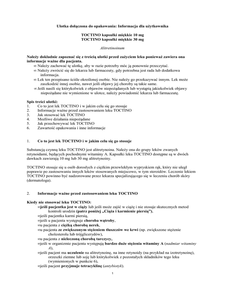 Ulotka dołączona do opakowania: Informacja dla użytkownika TOCTINO kapsułki miękkie 10 mg TOCTINO kapsułki miękkie 30 mg Alitretinoinum Należy dokładnie zapoznać się z treścią ulotki przed zażyciem leku ponieważ zawiera ona informacje ważne dla pacjenta. • Należy zachować tę ulotkę, aby w razie potrzeby móc ją ponownie przeczytać. • Należy zwrócić się do lekarza lub farmaceuty, gdy potrzebna jest rada lub dodatkowa informacja. • Lek ten przepisano ściśle określonej osobie. Nie należy go przekazywać innym. Lek może zaszkodzić innej osobie, nawet jeśli objawy jej choroby są takie same. • Jeśli nasili się którykolwiek z objawów niepożądanych lub wystąpią jakiekolwiek objawy niepożądane nie wymienione w ulotce, należy powiadomić lekarza lub farmaceutę. Spis treści ulotki: 1. Co to jest lek TOCTINO i w jakim celu się go stosuje 2. Informacje ważne przed zastosowaniem leku TOCTINO 3. Jak stosować lek TOCTINO 4. Możliwe działania niepożądane 5. Jak przechowywać lek TOCTINO 6. Zawartość opakowania i inne informacje 1. Co to jest lek TOCTINO i w jakim celu się go stosuje Substancją czynną leku TOCTINO jest alitretynoina. Należy ona do grupy leków zwanych retynoidami, będących pochodnymi witaminy A. Kapsułki leku TOCTINO dostępne są w dwóch dawkach zawierają 10 mg lub 30 mg alitretynoiny. TOCTINO stosuje się u osób dorosłych z ciężkim przewlekłym wypryskiem rąk, który nie uległ poprawie po zastosowaniu innych leków stosowanych miejscowo, w tym steroidów. Leczenie lekiem TOCTINO powinno być nadzorowane przez lekarza specjalizującego się w leczeniu chorób skóry (dermatologa). 2. Informacje ważne przed zastosowaniem leku TOCTINO Kiedy nie stosować leku TOCTINO: • jeśli pacjentka jest w ciąży lub jeśli może zajść w ciążę i nie stosuje skutecznych metod kontroli urodzin (patrz poniżej „Ciąża i karmienie piersią”), • jeśli pacjentka karmi piersią, • jeśli u pacjenta występuje choroba wątroby, • u pacjenta z ciężką chorobą nerek, • u pacjenta ze zwiększonym stężeniem tłuszczów we krwi (np. zwiększone stężenie cholesterolu lub trójglicerydów), • u pacjenta z nieleczoną chorobą tarczycy, • jeśli w organizmie pacjenta występują bardzo duże stężenia witaminy A (nadmiar witaminy A), • jeśli pacjent ma uczulenie na alitretynoinę, na inne retynoidy (na przykład na izotretynoinę), orzeszki ziemne lub soję lub którykolwiek z pozostałych składników tego leku (wymienionych w punkcie 6), • jeśli pacjent przyjmuje tetracyklinę (antybiotyk). 1 Jeśli którekolwiek z powyższych ostrzeżeń ma zastosowanie w danym przypadku, należy ponownie skontaktować się z lekarzem. W takim przypadku nie wolno stosować leku TOCTINO. Ostrzeżenia i środki ostrożności Przed przyjęciem leku TOCTINO należy omówić to z lekarzem • Jeśli u pacjenta kiedykolwiek występowały problemy związane ze zdrowiem psychicznym, w tym depresja, zachowania samobójcze lub psychoza lub jeśli pacjent przyjmuje leki w celu leczenia takich chorób. • Jeśli u pacjenta jest zwiększone stężenie tłuszczów we krwi, konieczne mogą być częstsze badania krwi. TOCTINO zwykle zwiększa stężenie tłuszczów we krwi, takich jak cholesterol lub trójglicerydy. Jeśli utrzymuje się duże stężenie tłuszczów we krwi, lekarz może zmniejszyć dawkę lub zaprzestać stosowania leku TOCTINO u pacjenta. • Jeśli pacjent ma duże stężenie cukru we krwi (cukrzycę), może być konieczne częstsze kontrolowanie stężenia cukru we krwi, a lekarz może rozpocząć leczenie od podawania pacjentowi mniejszej dawki leku TOCTINO. • Jeśli pacjent cierpi na chorobę tarczycy. Lek TOCTINO może zmniejszyć stężenia hormonów tarczycy. Jeśli stężenie hormonów tarczycy jest małe, lekarz może przepisać leki uzupełniające ich niedobór. Kiedy zachować szczególną ostrożność, stosując ten lek: • Jeśli wystąpią jakiekolwiek problemy ze wzrokiem, należy natychmiast skontaktować się z lekarzem. Być może trzeba będzie przerwać stosowanie leku TOCTINO i skontrolować wzrok. • Jeśli u pacjenta utrzymuje się ból głowy, nudności lub wymioty (mdłości) lub niewyraźne widzenie, mogą to być objawy tzw. łagodnego nadciśnienia wewnątrzczaszkowego. W takim przypadku należy natychmiast przerwać przyjmowanie kapsułek i jak najszybciej skontaktować się z lekarzem. • Jeśli u pacjenta wystąpiła krwawa biegunka, należy natychmiast przerwać przyjmowanie kapsułek i jak najszybciej skontaktować się z lekarzem. • Należy ograniczyć ekspozycję na światło słoneczne i unikać korzystania z solarium. Skóra pacjenta może stać się bardziej wrażliwa na światło słoneczne. Przed wyjściem na słońce należy nałożyć preparat ochronny z wysokim współczynnikiem ochrony przed światłem (SPF 15 lub wyższy). Jeśli w trakcie leczenia pacjent będzie miał suchą skórę i usta powinien zastosować nawilżający krem lub maść oraz pomadkę ochronną. • Należy ograniczyć intensywne ćwiczenia fizyczne: alitretynoina może powodować ból mięśni i stawów. • Jeśli u pacjenta wystąpi suchość oczu, pomocne może być zastosowanie maści do oczu lub kropli do oczu zastępujących łzy. Jeśli pacjent nosi soczewki kontaktowe, podczas leczenia alitretynoiną konieczne może być zastąpienie ich okularami. Suchość oczu i problemy ze wzrokiem zazwyczaj ustępują po zaprzestaniu leczenia. • TOCTINO może zwiększyć aktywność enzymów wątrobowych. Lekarz zleci badania krwi w trakcie leczenia, aby oznaczyć aktywność enzymów wątrobowych. Jeśli jej wartości są duże, lekarz zaleci zmniejszenie dawki leku lub zaprzestanie stosowania TOCTINO. Dzieci i młodzież Lek TOCTINO nie jest wskazany do stosowania u ludzi w wieku poniżej 18 lat. Nie jest znana skuteczność tego leku w tej grupie wiekowej. Inne leki i TOCTINO Podczas