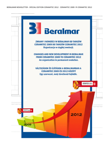 BERALMAR NEWSLETTER ‐ SPECIAL EDITION CERAMITEC 2012 CERAMITEC 2009 Æ CERAMITEC 2012 BERALMAR NEWSLETTER - SPECIAL EDITION CERAMITEC 2012 CERAMITEC 2009 CERAMITEC 2012 NOWOŚCI W FIRMIE CORPORATE NEWS VÁLLALATI ÚJÍTÁSOK NOWY DZIAŁ AUTOMATYKI NEW AUTOMATION DEPARTMENT ÚJ RÉSZLEG: AUTOMATIZMUSOK Najbardziej spektakularną nowością w ostatnich 3 latach jest bez wątpienia stworzenie własnego Działu Automatyki. Firma BERALMAR przekształca się w dostawcę, zdolnego dostarczyć całą technologię dla zakładu ceramiki budowlanej od formowania do pakowania. The most spectacular new development of the last 3 years is without doubt the commitment to our own Department of Automation. BERALMAR has become a complete supplier capable of providing all the technology needed for a structural ceramics factory, from moulding to packaging. Az elmúlt három év leglátványosabb fejlődését egyértelműen az jelentette, hogy a cég létrehozta saját részlegét az automatizmusok fejleszése számára. A BERALMAR olyan beszállítóvá vált, mely minden, a strukturális kerámiagyártó szektor által támasztott igény kielégítésére alkalmas a “prés utáni” állapottól a csomagolásig. NOWA STRONA WEB NEW WEBSITE ÚJ WEBOLDAL We wrześniu 2010 firma BERALMAR opublikowała swoją nową stronę web w 10 językach. BERALMAR launched its new website in 2010, published in 10 languages. 2010 szeptemberében indította el a BERALMAR megújult honlapját, mely már 10 nyelven vált olvashatóvá. TARGI KIÁLLÍTÁSOK Ostatnie 3 lata były bardzo aktywne dla firmy BERALMAR jeśli chodzi o udział w targach; firma była wystawcą 16 razy z własnym stoiskiem na targach w Niemczech, Włoszech, na Ukrainie, w Indiach, Brazylii, Algierii, Boliwii, etc. Az elmúlt három év bizonyult eddig a legtevékenyebbnek a kiállításokon való részvétel szempontjából. A BERALMAR 16 alkalommal képviseltette magát saját standdal olyan országokban, mint Németország, Olaszország, Ukrajna, India, Brazília, Algéria, Bolívia stb. TRADE FAIRS The last 3 years have been the most active for BERALMAR in terms of attending trade fairs, with 16 appearances with our own stand at fairs in Germany, Italy, Ukraine, India, Brazil, Algeria, Bolivia, etc. BERALMAR NEWSLETTER - SPECIAL EDITION CERAMITEC 2012 CERAMITEC 2009 CERAMITEC 2012 NOWOŚCI W FIRMIE CORPORATE NEWS VÁLLALATI ÚJÍTÁSOK KONFERENCJE CONFERENCES KONFERENCIÁK Firma BERALMAR przedstawiła ponad 30 prezentacji podczas konferencji i sympozjów w ponad 10 krajach. BERALMAR has given over 30 presentations at conferences and symposiums in over 10 countries. A BERALMAR több mint 30 prezentációt készített és tartott meg konferenciák és szimpóziumok alkalmából több mint 10 országban. SZKOLENIA KÉPZÉS Inwestycje w szkolenia bardzo wzrosły w ciągu ostatnich trzech lat. A képzésekbe tőrténő befektetés látványos növekedést produkált az utóbbi három évben. TRAINING Investment in training has seen a dramatic increase in the last three years. ZAŁOGA STAFF ÁLLOMÁNY Liczebność załogi firmy BERALMAR wzrosła o 22% w ciągu 3 ostatnich lat, co jest trendem odwrotnym niż ten, który panuje w sektorze. Jest to owocem potrzeby, sukcesów handlowych i wiary w dobrą przyszłość. The number of staff at BERALMAR has increased by 22% over the past 3 years, bucking the industry trend and arising from necessity, successful sales and confidence in the future. A BERALMAR személyzete 22%-os növekedést mutatott az elmúlt három év során, mely ellenkezni látszik a szektorban jelentkező gyakorlattal. E pozitív fejlemények a szükségből, az üzleti sikerekből és a jövőbe vetett hitből táplálkoznak WYRÓŻNIENIA ACKNOWLEDGEMENTS ELISMERÉSEK Zrzeszenie wielosektorowe AMEC nagrodziło firmę BERALMAR za działalność eksportową podczas uroczystości w Barcelonie. AMEC, the multisectoral association, acknoweldged BERALMAR’s export activity in a ceremony in Barcelona. A multiszektorális AMEC szervezet ünepélyes keretek között ismerte el a BERALMAR export-tevékenységét Barcelonában. Prestiżowa agencja E-informa (Dun & Bradstreet) wyróżniała firmę BERALMAR, rok rocznie, za dobrą sytuację finansową. The prestigious E-reporting agency (Dun & Bradstreet) has acknowledged BERALMAR’s financial health, year after year. A nagy tekintélynek örvendő Einforma ügynöksége (Dun & Bradstreet) évről évre ismeri el a BERALMAR-t, mint financiálisan kiváló helyzetű vállalatot. BERALMAR NEWSLETTER - SPECIAL EDITION CERAMITEC 2012 CERAMITEC 2009 CERAMITEC 2012 REALIZACJE ACCOMPLISHMENTS FEJLESZTÉSEK NOWE PROJEKTY INŻYNIERSKIE NEW ENGINEERING PROJECTS ÚJ MÉRNÖKI PROJEKTEK Od targów Ceramitec 2009 do dziś, firma BERALMAR została wybrana do realizacji 10 pieców i 8 suszarni w Hiszpanii, Rosji, na Węgrzech, w Maroku, Algierii, Boliwii i Wenezueli, do produkcji od 200 do 900 ton/dobę różnych wyrobów ceramicznych. Wiele z tych projektów zawiera dostawę urządzeń do automatyki transportu zaprojektowanych i wyprodukowanych przez firmę BERALMAR. Since the conclusion of Ceramitec 2009 until today, BERALMAR has been chosen to supply 10 drying kilns and 8 dryers in Spain, Russia, Hungary, Morocco, Algeria, Bolivia and Venezuela, for a production ranging from 200 to the 900 tonnes/day of different ceramic formats. Many of these projects already include the supply of automation systems designed and manufactured by BERALMAR. A CERAMITEC 2009-től napjainkig 10 kemence és 8 szárító létesítésére kérték fel a BERALMART Spanyolországban, Oroszországban, Magyarországon, Marokkóban, Algériában, Bolíviában és Venezuelában. A projektek során napi 200-900 tonnás teljesítményt kellett optimalizálni a különböző típusú kerámiákból. Az installált berendezések közül sok már a BERALMAR által tervezett és gyártott automatizmusokat is tartalmazza. Niektórzy klienci Some c