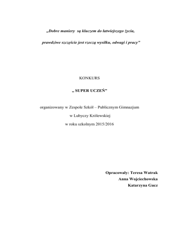 „Dobre maniery są kluczem do łatwiejszego życia, prawdziwe szczęście jest rzeczą wysiłku, odwagi i pracy” KONKURS „ SUPER UCZEŃ” organizowany w Zespole Szkół – Publicznym Gimnazjum w Lubyczy Królewskiej w roku szkolnym 2015/2016 Opracowały: Teresa Watrak Anna Wojciechowska Katarzyna Gucz 1. CELE KONKURSU: Doraźnym celem konkursu jest wyróżnienie tych, którzy posiadają dobre maniery oraz potrafią świadomie zapracować na sukcesy, takie jak: - zadowalające wyniki w nauce, - powodzenia w konkursach i zawodach, - wysoka frekwencja . Główną ideą konkursu jest kreowanie właściwych wzorców zachowania, które otworzą uczniom drogę do prawdziwego szczęścia i łatwiejszego życia. Cele szczegółowe to: - Uczniowie świadomie zdobywają wiedzę i umiejętności, chętnie osiągają dobre wyniki w nauce oraz rozwijają swoje zdolności przy wsparciu nauczycieli - Pozytywne wzorce są propagowane i wdrażane - Następuje podniesienie poziomu kultury osobistej - Gimnazjaliści sprawnie i chętnie posługują się grzecznościowymi oraz umiejętnie komunikują się z innymi - Kształtuje się odpowiednie zachowania w zależności od sytuacji - Uczniowie dobierają strój stosownie do okoliczności - Wzrasta odpowiedzialność za bezpieczeństwo swoje oraz innych - Uczniowie znają zasady udzielania pierwszej pomocy, znają numery zwrotami telefonów alarmowych - Uczniowie przewidują skutki niebezpiecznych zachowań - Wzmacnia się poczucie odpowiedzialności za mienie własne oraz publiczne 2. ADRESACI: Uczniowie klas I- III Gimnazjum Zespołu Szkół w Lubyczy Królewskiej 3. TERMINY: I część- do marca 2016 r. Pod koniec każdego miesiąca wychowawca klasy w oparciu o „Kodeks Super Ucznia”, analizuje zeszyt uwag, w porozumieniu z nauczycielami uczącymi oraz zespołem klasowym wybiera 5-ciu Super Uczniów z klasy. II część – kwiecień/maj 2016 r. Na podstawie wyników z poszczególnych miesięcy zostanie wyłoniony jeden super uczeń z każdej klasy. Wybrane osoby wezmą udział w kolejnym etapie konkursu – będzie on polegał na zebraniu się komisji, która wybierze Super Ucznia naszej szkoły. W przypadku wyłonienia dwóch uczniów z takimi samymi osiągnięciami, zostanie przeprowadzona rozmowa z uczniami, podczas której dokonają oni autoprezentacji. Regulamin konkursu „ SUPER UCZEŃ” 1. Pod koniec każdego miesiąca wychowawca każdej klasy gimnazjalnej w oparciu o „Kodeks Super ucznia”, analizę zeszytu uwag, w porozumieniu z nauczycielami uczącymi oraz zespołem klasowym wybiera 5 Super uczniów z klasy. 2. Członek samorządu klasowego sporządza protokół z głosowania, który podpisuje przewodniczący klasy i wychowawca. W protokole muszą znaleźć się dane uczniów. Przewodniczący przekazuje protokół opiekunom konkursu. 3. Lista klasowych laureatów zostanie zaprezentowana na gazetce SU. 4. Na podstawie wyników z poszczególnych miesięcy zostanie wyłoniony jeden uczeń z każdej klasy. Wybrane osoby wezmą udział w kolejnym etapie konkursu. W skład komisji konkursowej wejdą przedstawiciele: - dyrekcji szkoły, - zespołu wychowawczego, - samorządu uczniowskiego, - pracowników niepedagogicznych. W oparciu o pracę komisji zostanie wybrany Super Uczeń naszej szkoły. 5. Dyrektor nagrodzi zwycięzcę dyplomem oraz nagrodą na uroczystości zakończenia roku szkolnego. 6. Rodzice zwycięzcy otrzymają list gratulacyjny od dyrektora szkoły. SZKOLNY KODEKS SUPER UCZNIA I. MÓJ STOSUNEK DO OBOWIĄZKÓW SZKOLNYCH - - II. Zawsze jestem przygotowany do lekcji. Jestem aktywny i świadomie uczestniczę w zajęciach. Osiągam dobre wyniki w nauce. Służę pomocą w nauce koleżankom i kolegom. Chętnie uczestniczę w zajęciach dodatkowych, konkursach, zawodach sportowych, uroczystościach szkolnych i klasowych. Staram się nie opuszczać lekcji, a wszystkie nieobecności mam usprawiedliwione w odpowiednim czasie. KULTURA SŁOWA - Kulturalnie witam się i żegnam - Używam zwrotów i form grzecznościowych - Dostosowuję swój język do adresata - inaczej mówię do kolegi, inaczej do osoby dorosłej - Nie przerywam mówiącemu - Daję szansę wypowiedzi innym - Nie „wykrzykuję” swojego zdania - Szanuję zdanie innych - Nie używam wulgarnych słów - Dostosowuję siłę głosu do sytuacji II. KULTURA BYCIA - Witam się z nauczycielami i pracownikami szkoły oraz ze swoimi koleżankami i kolegami - Pamiętam, że do klasopracowni pierwszy wchodzi nauczyciel - Jeśli spóźnię się na lekcję, witam się, przepraszam i wyjaśniam powód spóźnienia - Podczas lekcji chętnie zdobywam nową wiedzę i umiejętności - Kulturalnie opuszczam pomieszczenia szkolne. Pierwszeństwo mają dorośli i dziewczynki - Jeśli kogoś potrącę, podaję mu rękę i przepraszam - Zwracając się do osób dorosłych oraz koleżanek i kolegów, używam zwrotów grzecznościowych - Nie używam na lekcjach telefonu komórkowego, ograniczam korzystanie z mediów na terenie szkoły - Nie kradnę, nie wyłudzam pieniędzy III. PRZESTRZEGAM ZASAD BEZPIECZEŃSTWA 1. Czuwam nad bezpieczeństwem swoim i innych. 2. Wiem, jak udzielać pierwszej pomocy. 3. Okrycie wierzchnie zostawiam w szatni. 4. Nie stoję naprzeciwko drzwi. 5. Nie stoję i nie siadam na schodach, na parapetach oraz na podłogach. 6. Przestrzegam regulaminu pomieszczeń gimnastycznej, biblioteki, świetlicy). 7. Nie hałasuję. 8. Nie śmiecę w szkole, na boisku, na ulicy. 9. Sprzątam swoje miejsce pracy. 10. Szanuję mienie szkolne, własność swoją i cudzą. 11. Nie niszczę ławek i krzeseł. 12. Nie niszczę dekoracji na korytarzu i w klasie. 13. Dbam o porządek w toalecie. 14. Dbam o sprzęt szkolny, z którego korzystam. (klasopracowni, sali 15. W drodze do szkoły i ze szkoły nie zapominam o dobrych manierach. 16. Przeciwstawiam się przejawom brutalności i wulgarności. 17. Na przystankach autobusowych i w autobusie zachowuję się odpowiedzialnie. 18. Podczas