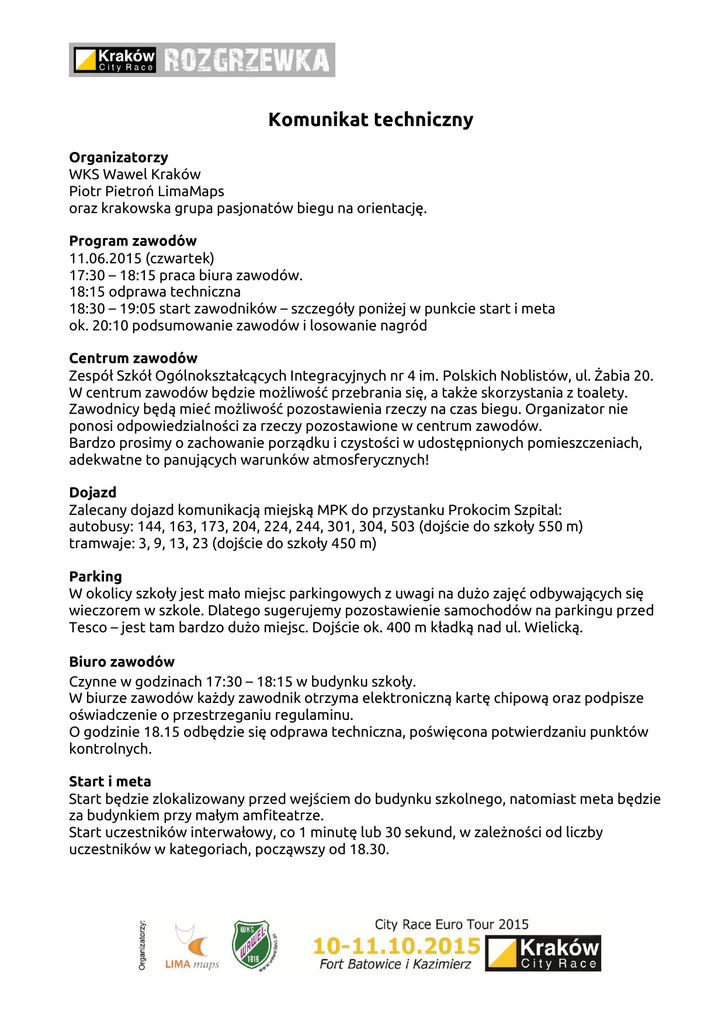 Komunikat techniczny Organizatorzy WKS Wawel Kraków Piotr Pietroń LimaMaps oraz krakowska grupa pasjonatów biegu na orientację. Program zawodów 11.06.2015 (czwartek) 17:30 – 18:15 praca biura zawodów. 18:15 odprawa techniczna 18:30 – 19:05 start zawodników – szczegóły poniżej w punkcie start i meta ok. 20:10 podsumowanie zawodów i losowanie nagród Centrum zawodów Zespół Szkół Ogólnokształcących Integracyjnych nr 4 im. Polskich Noblistów, ul. Żabia 20. W centrum zawodów będzie możliwość przebrania się, a także skorzystania z toalety. Zawodnicy będą mieć możliwość pozostawienia rzeczy na czas biegu. Organizator nie ponosi odpowiedzialności za rzeczy pozostawione w centrum zawodów. Bardzo prosimy o zachowanie porządku i czystości w udostępnionych pomieszczeniach, adekwatne to panujących warunków atmosferycznych! Dojazd Zalecany dojazd komunikacją miejską MPK do przystanku Prokocim Szpital: autobusy: 144, 163, 173, 204, 224, 244, 301, 304, 503 (dojście do szkoły 550 m) tramwaje: 3, 9, 13, 23 (dojście do szkoły 450 m) Parking W okolicy szkoły jest mało miejsc parkingowych z uwagi na dużo zajęć odbywających się wieczorem w szkole. Dlatego sugerujemy pozostawienie samochodów na parkingu przed Tesco – jest tam bardzo dużo miejsc. Dojście ok. 400 m kładką nad ul. Wielicką. Biuro zawodów Czynne w godzinach 17:30 – 18:15 w budynku szkoły. W biurze zawodów każdy zawodnik otrzyma elektroniczną kartę chipową oraz podpisze oświadczenie o przestrzeganiu regulaminu. O godzinie 18.15 odbędzie się odprawa techniczna, poświęcona potwierdzaniu punktów kontrolnych. Start i meta Start będzie zlokalizowany przed wejściem do budynku szkolnego, natomiast meta będzie za budynkiem przy małym amfiteatrze. Start uczestników interwałowy, co 1 minutę lub 30 sekund, w zależności od liczby uczestników w kategoriach, począwszy od 18.30. Forma przeprowadzenia zawodów Uczestnicy otrzymają mapę w skali 1:4000, na której zaznaczono „klasyczną” trasę BnO z narzuconą kolejnością zaliczania punktów kontrolnych (PK). Potwierdzanie punktów kontrolnych Potwierdzanie obecności na PK, odbywać się będzie przy pomocy elektronicznego systemu SPORTIdent. Stacje SportIdent’a przymocowane będą do stałych elementów (poręcze, drzewa i inne metalowe konstrukcje). Elementem punktu jest także lampion z kodem. Sposób potwierdzania punktów kontrolnych zostanie wytłumaczony podczas odprawy technicznej. Limit czasu Na wszystkich trasach limit czasowy to 60 min. Teren zawodów Zawody odbędą się w dzielnicy Prokocim. Trasa będzie prowadziła przez blokowiska, osiedla domków jednorodzinnych i dwa parki: Park Jerzmanowskich oraz Park Lilli Wenedy. Przez teren zawodów przepływa rzeka – jest ona oznaczona jako rzeka nie do przejścia. Zabronione jest zatem pokonywanie jej w inny sposób niż mostami! Zawody odbywają się w terenie osiedlowym o małym ruchu samochodowym, co nie zwalnia jednak z przestrzegania przepisów ruchu drogowego. Uczestnicy poruszają się po terenie zawodów na własną odpowiedzialność!!! Mapa PROKOCIM, skala 1:4000, warstwice co 2 metry. Autorzy: Andrzej Brandt, Piotr Krystek i Piotr Pietroń, czerwiec 2015 r. Opisy punktów kontrolnych na mapie. Parametry tras Trasa A TERMINATOR 3,0 km, 12 PK, przewyższenie 30 m Trasa B CZELADNIK 4,0 km, 15 PK, przewyższenie 35 m Trasa C MISTRZ 4,7 km, 20 PK, przewyższenie 45 m Klasyfikacja O kolejności w klasyfikacji końcowej będzie decydowała liczba zaliczonych punktów kontrolnych, a następnie czas pokonania trasy. Nagrody Wszyscy zawodnicy, którzy zostaną na zakończeniu zawodów, wezmą udział w losowaniu nagród. Nagroda główna to bon podarunkowy na kwotę 100 zł do sklepu Decathlon. Świadczenia W ramach opłaty startowej organizator zapewnia zawodnikom: - mapę z zaznaczoną trasą biegu - drobny poczęstunek - pomiar czasu i weryfikacje poprawności pokonania trasy - dostęp do toalet i pomieszczeń szkolnych jako miejsca do przebrania się. Uwagi - Wniesienie opłaty za bieg jest równoznaczne z akceptacją regulaminu zawodów oraz zobowiązaniem się do jego przestrzegania. - Organizator nie ponosi odpowiedzialności materialnej za rzeczy zaginione w trakcie trwania zawodów. - Zawodnicy startują na własną odpowiedzialność z pełną świadomością możliwych niebezpieczeństw i ryzyka z tym związanego. W przypadku wypadku, utraty zdrowia lub mienia, osoby te nie będą rościły żadnych zobowiązań wobec organizatorów, współorganizatorów udostępniających swoje obiekty na czas i okoliczność zawodów. - Zawodnicy zobowiązani są do przestrzegania przepisów Kodeksu Drogowego. - Na zawodach nie będzie zapewniona opieka lekarska. - W sprawach spornych ostateczna decyzja należy do sędziego głównego. - Organizator zastrzega sobie prawo do ostatecznej interpretacji niniejszego regulaminu.