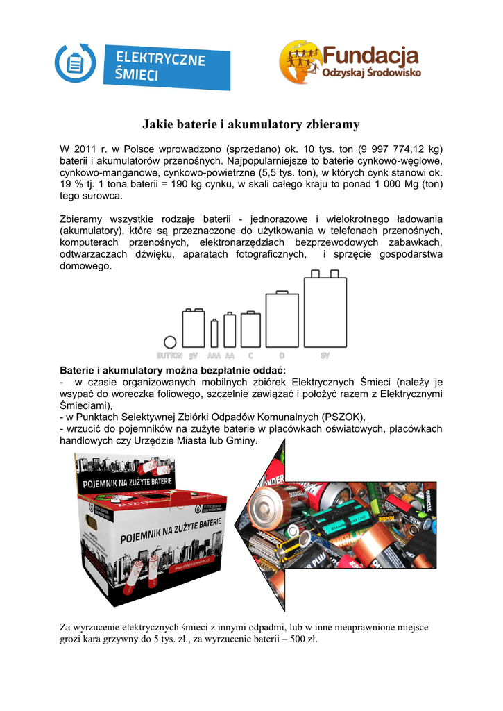 Jakie baterie i akumulatory zbieramy W 2011 r. w Polsce wprowadzono (sprzedano) ok. 10 tys. ton (9 997 774,12 kg) baterii i akumulatorów przenośnych. Najpopularniejsze to baterie cynkowo-węglowe, cynkowo-manganowe, cynkowo-powietrzne (5,5 tys. ton), w których cynk stanowi ok. 19 % tj. 1 tona baterii = 190 kg cynku, w skali całego kraju to ponad 1 000 Mg (ton) tego surowca. Zbieramy wszystkie rodzaje baterii - jednorazowe i wielokrotnego ładowania (akumulatory), które są przeznaczone do użytkowania w telefonach przenośnych, komputerach przenośnych, elektronarzędziach bezprzewodowych zabawkach, odtwarzaczach dźwięku, aparatach fotograficznych, i sprzęcie gospodarstwa domowego. Baterie i akumulatory można bezpłatnie oddać: - w czasie organizowanych mobilnych zbiórek Elektrycznych Śmieci (należy je wsypać do woreczka foliowego, szczelnie zawiązać i położyć razem z Elektrycznymi Śmieciami), - w Punktach Selektywnej Zbiórki Odpadów Komunalnych (PSZOK), - wrzucić do pojemników na zużyte baterie w placówkach oświatowych, placówkach handlowych czy Urzędzie Miasta lub Gminy. Za wyrzucenie elektrycznych śmieci z innymi odpadmi, lub w inne nieuprawnione miejsce grozi kara grzywny do 5 tys. zł., za wyrzucenie baterii – 500 zł.