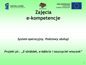 Zajęcia e-kompetencje System operacyjny. Podstawy obsługi Projekt pt:. „E-dzi@dek, e-b@bcia i nauczyciel wnuczek” 1 Plan dzisiejszych zajęć: 1. 2. 3. 4. 5. Obsługa klawiatury i myszy: o „mapa” klawiatury, czyli rozmieszczenie klawiszy o Funkcje grup klawiszy o wpisywanie DUŻYCH LITER o wpisywanie polskich znaków o poruszanie się po wpisanym tekście o usuwanie wcześniej wpisanego tekstu niektóre, najczęściej używane skróty klawiaturowe np. Kopiuj, wklej zapisz, znajdź itp. Systemy operacyjne. Krótkie omówienie różnic, praktyczne zapoznanie z Windows i Linuxem o Windows o Linux o OS X (Apple) Podstawowe pojęcia: kursor, ikonka, okno, folder, plik, kliknięcie, pasek menu, pasek tytułu, pulpit, aplikacja, Aplikacje i ich rodzaje w przykładach: o o o o o Edytor tekstów Arkusz kalkulacyjny Program do prezentacji multimedialnych Edytor obrazów Edytor muzyki o o o o o Przeglądarka internetowa Przeglądarka obrazów Odtwarzacz muzycznych Komunikator Program pocztowy 2 Obsługa klawiatury i myszy Klawiatura służy do pisania tekstu i wydawania poleceń poprzez naciśnięcie odpowiednich klawiszy. Typowa klawiatura komputerowa ma od kilkudziesięciu do stu czterech klawiszy. Na każdym klawiszu znajduje się symbol lub napis o określonym znaczeniu. Pełnią one różne funkcje i ich pogrupowanie ma ułatwiać użytkownikowi szybkie i sprawne korzystanie. Klawiatury różnych komputerów są podobne do siebie. Wszystkie zawierają klawisze alfanumeryczne, odpowiadające literom, cyfrom i znakom przestankowym. Każdy komputer posiada też klawisze pomocnicze takie jak Shift i Enter. Różnice mogą występować z pozostałymi klawiszami. Układ klawiszy alfanumerycznych jest standardowy. Różnice pojawiają się między sprzętem stosowanym w odmiennych krajach. Na takich klawiaturach nie ma polskich liter. W Polsce domyślnym ustawieniem języka jest język polski, a układ klawiatury jest zdeterminowany przez typ klawiatury wykrytej przez Windows, czyli zwykle klawiatury ze 101 klawiszami. Można wybrać jeden z międzynarodowych układów klawiatur. Dla Polski są dwa takie układy: standardowy i programisty Pod względem pełnionej funkcji klawisze komputerów IBM PC dzieli się na grupy: 3 Obsługa klawiatury i myszy Klawisze alfanumeryczne oznaczone na CZERWONO klawisze alfanumeryczne- obejmujące litery od A do Ż, cyfry od 0 do 9, znaki przestankowe, akcenty, nawiasy, symbole matematyczne i znaki specjalne Klawisze funkcyjne oznaczone na ZIELONO klawisze funkcyjne- oznaczone od F1 do F10 lub od F1 do F12 Klawisze sterujące oznaczone na NIEBIESKO klawisze sterujące ruchem kursora- w tym klawisze przesuwające kursor o jedną pozycję, oraz klawisze przesuwające kursor o wiele pozycji: Home, End, Page Up, Page Down, a także klawisz tabulatora Tab Klawisze wprowadzania zmian oznaczone na ŻÓŁTO klawisze do wprowadzania zmian w tekście: Delete, Insert, umieszczone w jednej grupie z klawiszami do przesuwania kursora o wiele pozycji i dodatkowo w klawiaturze alfanumerycznej, i Backspace 4 Obsługa klawiatury i myszy Klawisze wprowadzania poleceń oznaczone na klawisze do wprowadzania poleceń: Enter FIOLETOWO Klawiatura numeryczna oznaczone na POMARAŃCZOWO klawiatura numeryczna: zawiera dodatkowe klawisze cyfr, podstawowych symboli matematycznych, klawisz Enter i ewentualnie klawisze pomocnicze Klawisze zmieniające działanie innych klawiszy oznaczone na BRĄZOWO klawisze zmieniające działanie innych klawiszy: Shift, Ctrl i Alt, oraz Caps Lock i Num Lock Klawisze pomocnicze oznaczone na CZARNO klawisze pomocnicze: Escape a także kilka innych, m.in. Print Screen i Pause. 5 Obsługa klawiatury i myszy Polskie znaki diakrytyczne (ą, ć, ę, ł, ń, ó, ś, ż, ź) uzyskuje się najczęściej poprzez równoczesne wciśnięcie PRAWEGO KLAWISZA "Alt" i litery podobnej do znaku (np. "ę" uzyskuje się kombinacją klawiszy Alt i e). Wyjątkiem jest litera "ź", którą uzyskuje się poprzez wciśnięcie równocześnie klawiszy Alt oraz x (gdyż kombinacja Alt i z daje w wyniku ż) 6 Obsługa klawiatury i myszy LEWY PRZYCISK MYSZY PRAWY PRZYCISK MYSZY KÓŁKO, ROLKA MYSZY jest twarde plastikowe lub gumowe na myszy komputerowej, prostopadłe do powierzchni myszy. Zwykle jest usytuowane pomiędzy lewym i prawym przyciskiem. Umożliwia przewijanie dokumentu, strony internetowej. Może pełnić rolę dodatkowego przycisku, a także poprzez wychylenie w prawo lub w lewo pozwala na przewijanie w poziomie Kliknięcie myszą (ang. click, poloniz. klik) – naciśnięcie, czyli wciśnięcie i zwolnienie przycisku myszy (jako urządzenia sterującego pracą komputera). W większości systemów operacyjnych jednokrotne naciśnięcie • lewego przycisku (skr. LPM od Lewy Przycisk Myszy) oznacza przeniesienie kursora lub zaznaczenie obiektu, • prawego przycisku (skr. PPM od Prawy Przycisk Myszy) otwiera menu kontekstowe, czyli listę opcji dostępnych dla wskazanego obiektu. Dwukrotne naciśnięcie przycisku (dwuklik) oznacza wybranie obiektu (zwykle równoważne wciśnięciu klawisza Enter). Wykonuje się je w krótkim odstępie czasu wynoszącym zazwyczaj około pół sekundy. W domyśle dwuklik wykonuje się za pomocą lewego przycisku, gdyż dwukrotnemu kliknięciu prawym przyciskiem nie jest przypisywana oddzielna funkcja. W wielu współczesnych systemach operacyjnych istnieje możliwość skonfigurowania przerwy między kliknięciami myszą w dwukliku. 7 Obsługa klawiatury i myszy 8 niektóre, najczęściej używane skróty klawiaturowe Żeby skorzystać z określonego skrótu klawiszowego należy: 1. Nacisnąć pierwszy z wymienionych klawiszy np. Ctrl 2. Nie przerywając naciśnięcia pierwszego klawisza wcisnąć następny np. C Alt+Ctrl+Delete - Menedżer zadań lub "miękki reset" Alt+F4 - Zamknij program Ctrl+C - Kopiuj Ctrl+V - Wklej Ctrl+X - Wytnij Ctrl+A - Zaznacz wszystko Ctrl+Z - Cofnij Ctrl+Y - Ponów Ctrl+N - Nowy plik Ctrl+O - Otwórz plik Ctrl+