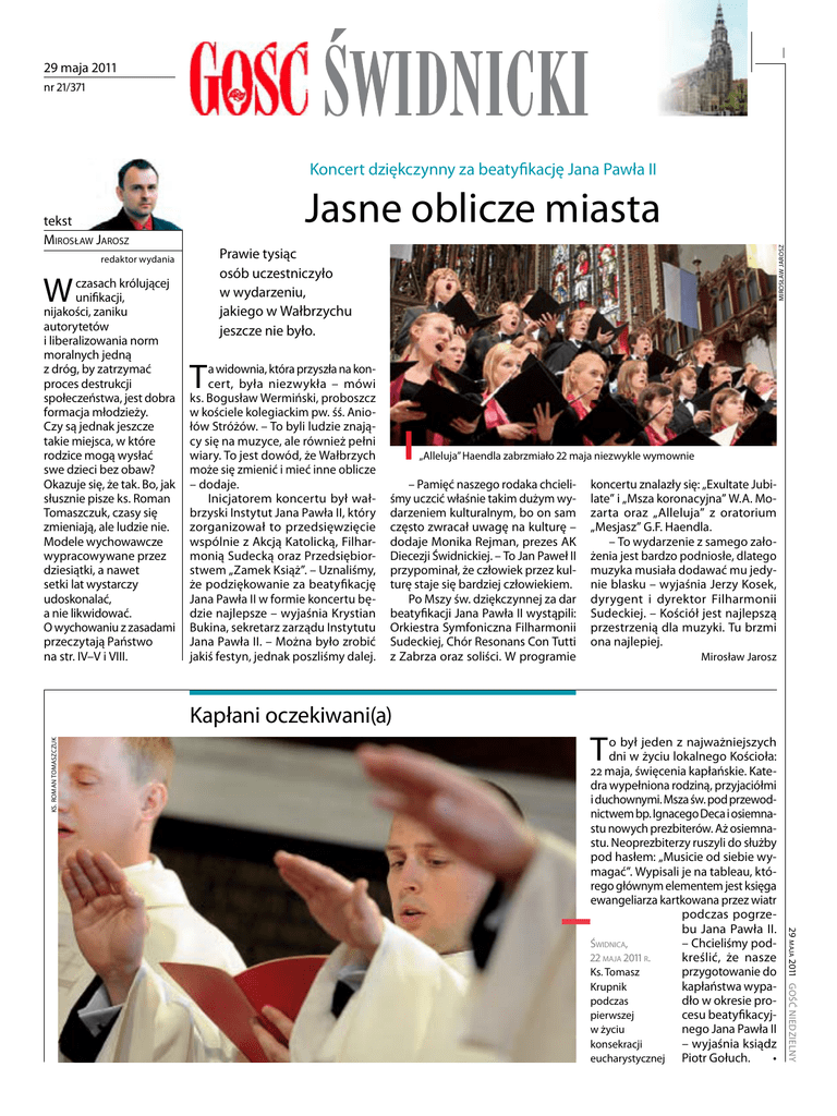 I 29 maja 2011 nr 21/371 Koncert dziękczynny za beatyfikację Jana Pawła II Prawie tysiąc osób uczestniczyło w wydarzeniu, jakiego w Wałbrzychu jeszcze nie było. redaktor wydania W czasach królującej unifikacji, nijakości, zaniku autorytetów i liberalizowania norm moralnych jedną z dróg, by zatrzymać proces destrukcji społeczeństwa, jest dobra formacja młodzieży. Czy są jednak jeszcze takie miejsca, w które rodzice mogą wysłać swe dzieci bez obaw? Okazuje się, że tak. Bo, jak słusznie pisze ks. Roman Tomaszczuk, czasy się zmieniają, ale ludzie nie. Modele wychowawcze wypracowywane przez dziesiątki, a nawet setki lat wystarczy udoskonalać, a nie likwidować. O wychowaniu z zasadami przeczytają Państwo na str. IV–V i VIII. Mirosław Jarosz Jasne oblicze miasta tekst Mirosław Jarosz T a widownia, która przyszła na koncert, była niezwykła – mówi ks. Bogusław Wermiński, proboszcz w kościele kolegiackim pw. śś. Aniołów Stróżów. – To byli ludzie znający się na muzyce, ale również pełni wiary. To jest dowód, że Wałbrzych może się zmienić i mieć inne oblicze – dodaje. Inicjatorem koncertu był wałbrzyski Instytut Jana Pawła II, który zorganizował to przedsięwzięcie wspólnie z Akcją Katolicką, Filharmonią Sudecką oraz Przedsiębiorstwem „Zamek Książ”. – Uznaliśmy, że podziękowanie za beatyfikację Jana Pawła II w formie koncertu będzie najlepsze – wyjaśnia Krystian Bukina, sekretarz zarządu Instytutu Jana Pawła II. – Można było zrobić jakiś festyn, jednak poszliśmy dalej. „Alleluja” Haendla zabrzmiało 22 maja niezwykle wymownie – Pamięć naszego rodaka chcieliśmy uczcić właśnie takim dużym wydarzeniem kulturalnym, bo on sam często zwracał uwagę na kulturę – dodaje Monika Rejman, prezes AK Diecezji Świdnickiej. – To Jan Paweł II przypominał, że człowiek przez kulturę staje się bardziej człowiekiem. Po Mszy św. dziękczynnej za dar beatyfikacji Jana Pawła II wystąpili: Orkiestra Symfoniczna Filharmonii Sudeckiej, Chór Resonans Con Tutti z Zabrza oraz soliści. W programie ks. Roman Tomaszczuk Kapłani oczekiwani(a) koncertu znalazły się: „Exultate Jubilate” i „Msza koronacyjna” W.A. Mozarta oraz „Alleluja” z oratorium „Mesjasz” G.F. Haendla. – To wydarzenie z samego założenia jest bardzo podniosłe, dlatego muzyka musiała dodawać mu jedynie blasku – wyjaśnia Jerzy Kosek, dyrygent i dyrektor Filharmonii Sudeckiej. – Kościół jest najlepszą przestrzenią dla muzyki. Tu brzmi ona najlepiej. Mirosław Jarosz T 29 maja 2011 Gość Niedzielny o był jeden z najważniejszych dni w życiu lokalnego Kościoła: 22 maja, święcenia kapłańskie. Katedra wypełniona rodziną, przyjaciółmi i duchownymi. Msza św. pod przewodnictwem bp. Ignacego Deca i osiemnastu nowych prezbiterów. Aż osiemnastu. Neoprezbiterzy ruszyli do służby pod hasłem: „Musicie od siebie wymagać”. Wypisali je na tableau, którego głównym elementem jest księga ewangeliarza kartkowana przez wiatr podczas pogrzebu Jana Pawła II. Świdnica, – Chcieliśmy pod22 maja 2011 r. kreślić, że nasze przygotowanie do Ks. Tomasz kapłaństwa wypaKrupnik dło w okresie propodczas cesu beatyfikacyjpierwszej nego Jana Pawła II w życiu – wyjaśnia ksiądz konsekracji eucharystycznej Piotr Gołuch. • gość świdnicki gość świdnicki Spotkania Małżeńskie w naszej diecezji Rogoźnica. Majowa uroczystość poświęcona pamięci Jana Pawła II organizowana w parafii Matki Bożej Różańcowej w Rogoźnicy ma już kilkuletnią tradycję. Tegoroczny program przygotowany przez młodzież szkolną oraz katechetów z kilku szkół gimnazjalnych i ponadgimnazjalnych z terenu gminy Strzegom przypomniał uczestnikom ważne fakty z życia Papieża Polaka oraz z jego nauczanie na temat odwagi świętości. Fragmenty wypowiedzi Jana Pawła II, wiersze jego autorstwa oraz prezentacje multimedialne przeplatane były pieśniami i piosenkami religijnymi wykonywanymi przez zespół wokalno-instrumentalny „Jeruzalem” z Jaroszowa. Mirosław Jarosz Irena i Ryszard Orzelscy Spotkania Małżeńskie organizują od 16 lat Z ąbkowi ce Ś l ą sk ie . Historia ruchu Spotkań Małżeńskich w Polsce ma już 34 lata. Obecnie są one międzynarodowym stowarzyszeniem wiernych zatwierdzonym dekretem Papieskiej Rady ds. Świeckich. Spotkania pogłębiają, odnawiają, a nieraz odbudowują miłości małżeńską. Podstawową formą pracy są 2–3 dniowe spotkania o charakterze rekolekcji zamkniętych, prowadzone w duchu dyskretnego dialogu męża i żony. Przeznaczone są dla wszystkich pragnących rozwoju miłości małżeńskiej i szczególnie pomocne dla par przeżywających trudności. Pomocą służą odpowiednio do tego przygotowane małżeństwa oraz kapłan. Ośrodki Spotkań Małżeńskich funkcjonują w wielu diecezjach. Niestety w naszej dotychczas ich brakowało. Małżonkowie korzystali ze Spotkań, jakie w diecezji legnickiej organizują Irena i Ryszard Orzelscy. Niebawem jednak Spotkania Małżeńskie odbędą się po raz pierwszy na terenie diecezji świdnickiej od 10 do 12 czerwca w Ząbkowicach Śląskich. Odpowiedzialnymi za Spotkania zostali państwo Ewa i Robert Stolarczykowie. Bliższych informacji udzielają i zgłoszenia przyjmują: Irena i Ryszard Orzelscy, e-mail: irena03@ poczta.onet.pl; tel. (75) 643 25 39, 691 832 539 oraz ks. Roman Tomaszczuk, e-mail: roman.tomaszczuk@ gosc.pl, tel. 666 895 878. Filozof, teolog, mistyk Gospodarzem uroczystości był ks. Franciszek Skwarek, a patronat nad nią objął Burmistrz Strzegomia Zbigniew Suchyta. Czy można o papieżu powiedzieć coś nowego? Pewnie tak, na pewno jednak można go jeszcze lepiej zrozumieć. D ni Papieskie powstały z miłości, jaką wszyscy spontanicznie darzyliśmy Jana Pawła II. Po raz szósty ci sami ludzie: ks. prałat Jan Bagiński i Andrzej Protasiuk poświęcili wiele czasu i pieniędzy, by p