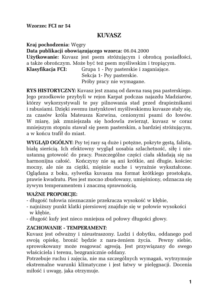 Wzorzec FCI nr 54 KUVASZ Kraj pochodzenia: Węgry Data publikacji obowiązującego wzorca: 06.04.2000 Użytkowanie: Kuvasz jest psem stróżującym i obrońcą posiadłości, a także obrończym. Może być też psem myśliwskim i tropiącym. Klasyfikacja FCI: Grupa 1 - Psy pasterskie i zaganiające. Sekcja 1- Psy pasterskie. Próby pracy nie wymagane. RYS HISTORYCZNY: Kuvasz jest znaną od dawna rasą psa pasterskiego. Jego przodkowie przybyli w rejon Karpat podczas najazdu Madziarów, którzy wykorzystywali te psy pilnowania stad przed drapieżnikami i rabusiami. Dzięki swemu instynktowi myśliwskiemu kuvasze stały się, za czasów króla Mateusza Korwina, cenionymi psami do łowów. W miarę, jak zmniejszała się hodowla zwierząt, kuvasz w coraz mniejszym stopniu stawał się psem pasterskim, a bardziej stróżującym, a w końcu trafił do miast. WYGLĄD OGÓLNY: Psy tej rasy są duże i potężne, pokryte gęstą, falistą, białą sierścią. Ich efektowny wygląd uosabia szlachetność, siłę i nieustanną gotowość do pracy. Poszczególne części ciała składają się na harmonijna całość. Kończyny nie są ani krótkie, ani długie, kościec mocny, ale nie za ciężki, mięśnie suche i wyraźnie wykształcone. Oglądana z boku, sylwetka kuvasza ma format krótkiego prostokąta, prawie kwadratu. Pies jest mocno zbudowany, umięśniony, odznacza się żywym temperamentem i znaczną sprawnością. WAŻNE PROPORCJE: - długość tułowia nieznacznie przekracza wysokość w kłębie, - najniższy punkt klatki piersiowej znajduje się w połowie wysokości w kłębie, - długość kufy jest nieco mniejsza od połowy długości głowy. ZACHOWANIE - TEMPERAMENT: Kuvasz jest odważny i nieustraszony. Ludzi i dobytku, oddanego pod swoją opiekę, bronić będzie z nara-żeniem życia. Pewny siebie, sprowokowany może reagować agresją. Jest przywiązany do swego właściciela i terenu, bezgranicznie oddany. Potrzebuje ruchu i zajęcia, nie ma szczególnych wymagań, wytrzymuje ekstremalne warunki klimatyczne i jest łatwy w pielęgnacji. Docenia miłość i uwagę, jaka otrzymuje. 1 GŁOWA: Głowa kuvasza na kształt klina, jest proporcjonalna do tułowia, szlachetna, dosyć mocna i ładna. Jej kształt odróżnia kuvasza od innych podobnych ras - powinna być sucha i wyrzeźbiona. Głowa psa jest nieco bardziej masywna od głowy suki. Mózgoczaszka: Czaszka: szeroka, czoło lekko wysklepione, rozdzielone po środku wyraźną bruzdą. Stop: ledwie zaznaczony. Trzewioczaszka: Szeroka, długa, dobrze umięśniona. Nos: czarna trufla nosa jest zakończona tępo. Kufa: grzbiet nosa prosty, kufa zwęża się stopniowo, ale nie jest szpiczasta. Wargi: czarne, dobrze przylegające, w kącikach postrzępione. Uzębienie: mocne, dobrze rozwinięte, równomiernie rozmieszczone zgodnie ze wzorem zębowym. Zgryz nożycowy. Oczy: lekko skośne, kształtu migdała, ciemnobrązowe, powieki ciemne i ściśle przylegające do gałki ocznej. Uszy: osadzone średnio wysoko, na jednej trzeciej długości, licząc od podstawy, odstawione dachówkowato od głowy, a dalej wiszące blisko niej. Przy pobudzeniu uszy są lekko wzniesione. Nie mogą być stojące ani zwinięte. SZYJA: Mniej niż średniej długości, dobrze umięśniona, ustawiona pod kątem 25 do 30 stopni do poziomu. Kark krótki, skóra na szyi przylegająca, bez podgardla. U samców wyraźna grzywa. TUŁÓW: Widziany z boku ma format krótkiego prostokąta, nieznacznie tylko odbiega od kwadratu. Kłąb: długi, wyraźnie wystający ponad linię grzbietu. Grzbiet: średniej długości, prosty, szeroki, dobrze umięśniony i związany. Lędźwie: krótkie, dobrze związane, płynnie przechodzące w grzbiet. Zad: lekko opadający, dobrze umięśniony, szeroki, dobrze związany. Gęsta sierść powoduje, że wydaje się nieco przebudowany. Przedpiersie: na skutek silnie rozwiniętych mięśni wydaje się krągłe, z nieznacznie tylko wystającym mostkiem. Klatka piersiowa: długa, głęboka, lekko wysklepiona. 2 Linia dolna: stanowi kontynuację klatki piersiowej i wznosi się ku tyłowi. OGON: Nisko osadzony, stanowi przedłużenie opadającej linii zadu, opuszczony, z końcem lekko wzniesionym, ale nie zakręconym. Przy pobudzeniu może być wzniesiony co najwyżej na wysokość grzbietu. KOŃCZYNY: Kończyny przednie: stanowią mocną podporę dla tułowia, są proste i pionowe aż do nadgarstka, średnio szeroko rozstawione. Gdy patrzeć z przodu, to przy prawidłowym ustawieniu pionowa linia, opuszczona od łokcia, przebiegnie przez środek nogi i zakończy się pomiędzy trzecim a czwartym palcem. Przy oglądaniu z boku pionowa linia poprowadzona od łokcia przechodzi środkiem nogi do nadgarstka. Łopatki: długie, skośnie ustawione, dobrze umięśnione i przylegające do klatki piersiowej, ruchome. Ramiona: średniej długości, dobrze umięśnione, tworzy z łopatką kąt 100 do 110 stopni. Łokcie: przylegające, ani wykręcone na zewnątrz, ani do wewnątrz. Ramię łączy się z podramieniem pod kątem 120 - 130 stopni. Przedramiona: dosyć długie, proste, dobrze umięśnione i suche, o mocnych ścięgnach, sięgających nadgarstka. Nadgarstki: dobrze wykształcone, zwarte, o ścięgnach jak ze stali. Śródręcza: dość krótkie, suche, lekko nachylone (pod kątem 10 - 15 stopni). Łapy: okrągłe lub lekko owalne, zwarte. Palce krótkie, wysklepione tak mocno, że w środkowej części nie dotykają ziemi, zwarte. Opuszki sprężyste, czarne. Pazury mocne, krótkie, czarne lub łupkowoszare. Kończyny tylne: Pozycja ich jest prawidłowa, gdy staw kolanowy znajduje się pod guzem kulszowym, a łapa pod stawem biodrowym. Pionowa linia od guza siedzeniowego powinna przejść przez piętę. Przy oglądaniu z tyłu postawa jest prawidłowa, gdy linia od guza kulszowego przechodzi pionowo przez kończynę, a obie linie są równoległe i rozstawione umiarkowanie szeroko. Uda: dobrze związane z miednicą długimi, szerokimi 