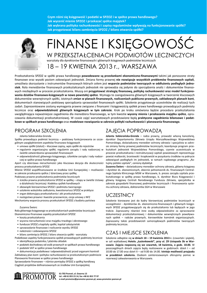 Czym różni się księgowość i podatki w SPZOZ i w spółce prawa handlowego? Jak wycenić mienie SPZOZ i przekazać spółce majątek? Jak wybrana polityka rachunkowości i zapisy regulaminów wpływają na funkcjonowanie spółki? Jak przygotować bilans zamknięcia SPZOZ / bilans otwarcia spółki? FINANSE I KSIĘGOWOŚĆ W PRZEKSZTAŁCENIACH PODMIOTÓW LECZNICZYCH warsztaty dla dyrektorów finansowych i głównych księgowych podmiotów leczniczych 18 – 19 KWIETNIA 2013 r., WARSZAWA Przekształcenia SPZOZ w spółki prawa handlowego powodowane są przesłankami ekonomiczno-finansowymi takimi jak ponoszone straty finansowe oraz wysoki poziom zobowiązań jednostek. Zmiana formy prawnej nie rozwiązuje wszystkich problemów finansowych szpitali, umożliwia skorzystanie z instrumentów finansowych których celem jest wsparcie podmiotów tworzących w oddłużeniu podległych jednostek. Rola menedżerów finansowych przekształcanych jednostek nie sprowadza się jedynie do sporządzenia analiz i dokumentów finansowych niezbędnych w procesie przekształcenia. Muszą oni przygotować strategię finansową, politykę rachunkowości oraz model funkcjonowania działów finansowo-księgowych w nowo powstałej spółce. Wymaga to zaangażowania głównych księgowych w tworzenie kluczowych dokumentów wewnętrznych spółki, istotnych zmian w planach finansowych, rozliczeniach publiczno-prawnych, zakładowych planach kont, dokumentach stanowiących podstawę sporządzania sprawozdań finansowych spółki. Szkolenie przygotowuje uczestników do realizacji tych zadań. Zaprezentowane zostaną wymagania prawne związane z finansami i księgowością spółek prawa handlowego prowadzących podmioty lecznicze oraz odpowiedzialność głównych księgowych w tym zakresie. Krok po kroku omówiona będzie procedura przekształcenia uwzględniająca najważniejsze zagadnienia dla menedżera finansowego, w tym kwestie wyceny mienia i przekazania majątku spółce, opracowania dokumentacji przekształceniowej. W czasie zajęć warsztatowych przedstawione będą praktyczne zagadnienia bilansowe i podatkowe w spółkach prawa handlowego oraz modelowe rozwiązania w zakresie polityki rachunkowości i planowania finansowego. PROGRAM SZKOLENIA ZAJĘCIA POPROWADZĄ Jolanta Sobierańska-Grenda Spółka prowadząca podmiot leczniczy – podstawy funkcjonowania ze szczególnym uwzględnieniem aspektów finansowo-księgowych • umowa spółki (statut) – kluczowe zapisy, wpis spółki do rejestrów • regulamin organizacyjny spółki; regulamin zarządu i rady nadzorczej w świetle zatwierdzania sprawozdań finansowych • odpowiedzialność głównego księgowego, członków zarządu i rady nadzorczej w spółce prawa handlowego Aport czy dzierżawa nieruchomości jako kluczowa decyzja dla skuteczności procesu przekształcenia SPZOZ Mienie SPZOZ współfinansowane ze środków Unii Europejskiej – możliwości w zakresie przekazania spółce / dzierżawy przez spółkę Podstawy prawne przekształcenia podmiotów leczniczych • ścieżka prawna przekształcenia SPZOZ w spółkę – etapy w świetle Ustawy o działalności leczniczej i Kodeksu spółek handlowych • obowiązki kierownictwa SPZOZ i podmiotu tworzącego • ustalenie wskaźnika zadłużenia, kwestionariusz SPZOZ w praktyce • organ dokonujący przekształcenia i akt przekształcenia • następstwo prawne i kwestie pracownicze, cesja umowy z NFZ Mechanizmy wsparcia procesu przekształceń SPZOZ z budżetu państwa Jolanta Sobierańska-Grenda – radca prawny, prowadzi własną kancelarię, dyrektor Departamentu Zdrowia Urzędu Marszałkowskiego Województwa Pomorskiego, doświadczony menedżer ochrony zdrowia i specjalista w zakresie zmiany formy prawnej podmiotów leczniczych; koordynuje program przekształceń jednostek Województwa Pomorskiego, czynnie uczestniczyła w procesie przekształcania i restrukturyzacji szpitali powiatowych reprezentując powiat malborski, braniewski i krapkowicki w pozyskaniu środków na pokrycie zobowiązań podległych im jednostek, w ramach rządowego programu „Ratujmy polskie szpitale”, ceniony dydaktyk Zuzanna Świerc – doświadczony menedżer ochrony zdrowia, główny księgowy i dyrektor ds. ekonomicznych, obecnie pełnomocnik ds. finansowych Centralnego Szpitala Klinicznego MSW w Warszawie, b. prezes zarządu szpitala przekształconego w spółkę prawa handlowego, b. dyrektor Biura Księgowości i główny księgowy Centrali Narodowego Funduszu Zdrowia, specjalistka w zakresie gospodarki finansowej podmiotów leczniczych i finansowania systemu ochrony zdrowia, doktorantka SGH w Warszawie Zuzanna Świerc Rola głównego księgowego w przekształceniach podmiotów leczniczych Ekonomiczno-finansowe aspekty przekształceń SPZOZ • koszty przekształcenia • wycena nieruchomości oraz majątku trwałego i obrotowego • fundusze SPZOZ a kapitały spółki, kapitał założycielski • sprawozdanie finansowe i rozliczenie wyniku SPZOZ • należności i zobowiązania SPZOZ • bilans zamknięcia SPZOZ / bilans otwarcia spółki - warsztaty Podatkowe aspekty funkcjonowania spółek prowadzących podmioty lecznicze • identyfikacja podatnika / płatnika składek • podatek dochodowy od osób prawnych w spółkach prawa handlowego • podatek VAT w spółce prawa handlowego • dokumentacja podatkowa i odpowiedzialność przed organami kontroli Zakładowy plan kont i polityka rachunkowości w przekształconym podmiocie Planowanie finansowe w spółce prawa handlowego Sprawozdanie finansowe – różnice pomiędzy SPZOZ a spółką handlową Ciągłość projektów dofinansowanych ze środków Unii Europejskiej UCZESTNICY Szkolenie kierowane jest do kadry kierowniczej podmiotów leczniczych w szczególności - dyrektorów ds. ekonomiczno-finansowych i głównych księgowych SPZOZ przygotowujących się do przekształcenia lub będących w jego trakcie. Zapraszamy również inne osoby odpowiedz