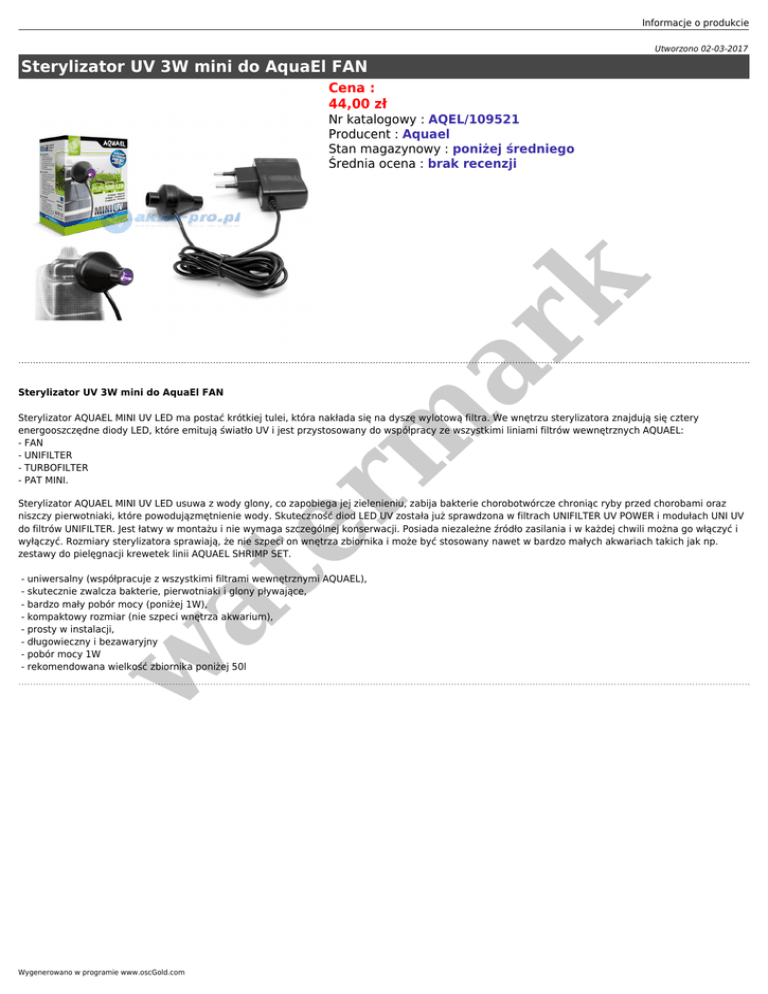 Informacje o produkcie Utworzono 02-03-2017 Sterylizator UV 3W mini do AquaEl FAN Cena : 44,00 zł er m ar k Nr katalogowy : AQEL/109521 Producent : Aquael Stan magazynowy : poniżej średniego Średnia ocena : brak recenzji Sterylizator UV 3W mini do AquaEl FAN Sterylizator AQUAEL MINI UV LED ma postać krótkiej tulei, która nakłada się na dyszę wylotową filtra. We wnętrzu sterylizatora znajdują się cztery energooszczędne diody LED, które emitują światło UV i jest przystosowany do współpracy ze wszystkimi liniami filtrów wewnętrznych AQUAEL: - FAN - UNIFILTER - TURBOFILTER - PAT MINI. at Sterylizator AQUAEL MINI UV LED usuwa z wody glony, co zapobiega jej zielenieniu, zabija bakterie chorobotwórcze chroniąc ryby przed chorobami oraz niszczy pierwotniaki, które powodujązmętnienie wody. Skuteczność diod LED UV została już sprawdzona w filtrach UNIFILTER UV POWER i modułach UNI UV do filtrów UNIFILTER. Jest łatwy w montażu i nie wymaga szczególnej konserwacji. Posiada niezależne źródło zasilania i w każdej chwili można go włączyć i wyłączyć. Rozmiary sterylizatora sprawiają, że nie szpeci on wnętrza zbiornika i może być stosowany nawet w bardzo małych akwariach takich jak np. zestawy do pielęgnacji krewetek linii AQUAEL SHRIMP SET. w - uniwersalny (współpracuje z wszystkimi filtrami wewnętrznymi AQUAEL), - skutecznie zwalcza bakterie, pierwotniaki i glony pływające, - bardzo mały pobór mocy (poniżej 1W), - kompaktowy rozmiar (nie szpeci wnętrza akwarium), - prosty w instalacji, - długowieczny i bezawaryjny - pobór mocy 1W - rekomendowana wielkość zbiornika poniżej 50l Wygenerowano w programie www.oscGold.com