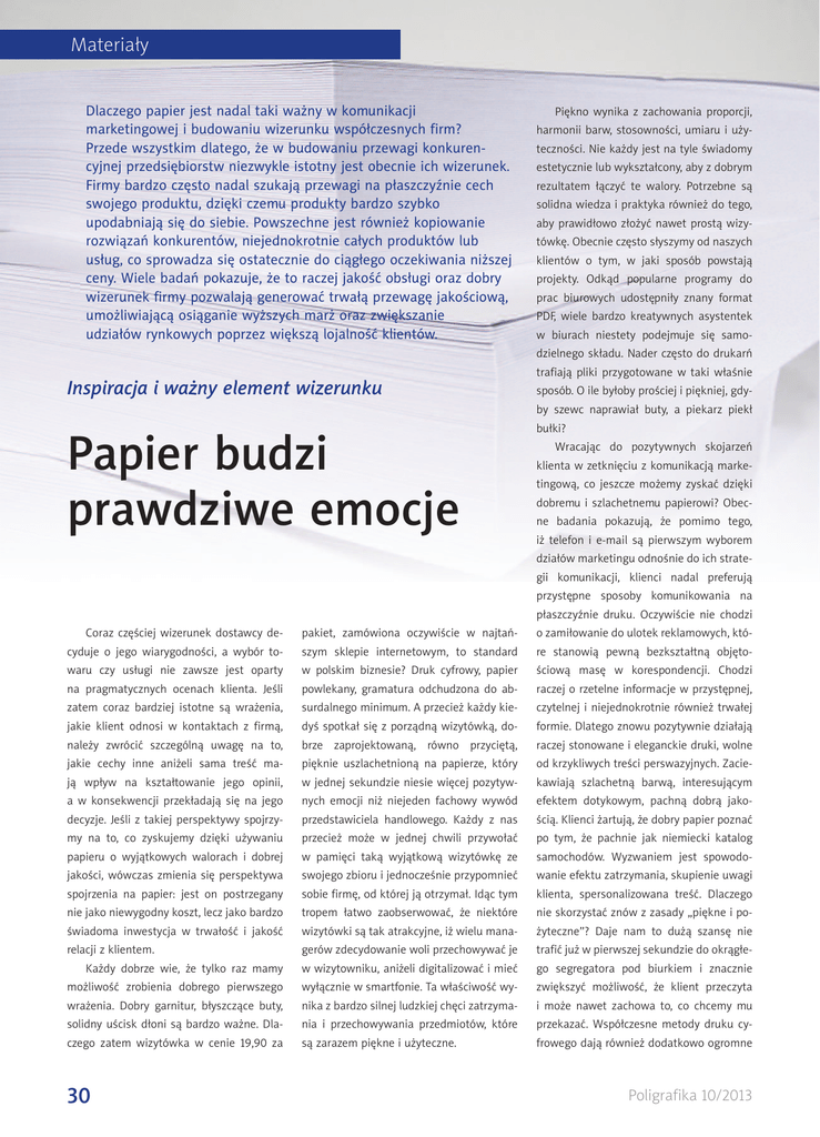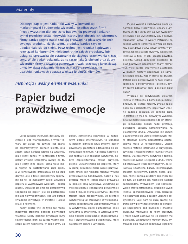 Materiały Dlaczego papier jest nadal taki ważny w komunikacji marketingowej i budowaniu wizerunku współczesnych firm? Przede wszystkim dlatego, że w budowaniu przewagi konkurencyjnej przedsiębiorstw niezwykle istotny jest obecnie ich wizerunek. Firmy bardzo często nadal szukają przewagi na płaszczyźnie cech swojego produktu, dzięki czemu produkty bardzo szybko upodabniają się do siebie. Powszechne jest również kopiowanie rozwiązań konkurentów, niejednokrotnie całych produktów lub usług, co sprowadza się ostatecznie do ciągłego oczekiwania niższej ceny. Wiele badań pokazuje, że to raczej jakość obsługi oraz dobry wizerunek firmy pozwalają generować trwałą przewagę jakościową, umożliwiającą osiąganie wyższych marż oraz zwiększanie udziałów rynkowych poprzez większą lojalność klientów. Piękno wynika z zachowania proporcji, harmonii barw, stosowności, umiaru i użyteczności. Nie każdy jest na tyle świadomy estetycznie lub wykształcony, aby z dobrym rezultatem łączyć te walory. Potrzebne są solidna wiedza i praktyka również do tego, aby prawidłowo złożyć nawet prostą wizytówkę. Obecnie często słyszymy od naszych klientów o tym, w jaki sposób powstają projekty. Odkąd popularne programy do prac biurowych udostępniły znany format PDF, wiele bardzo kreatywnych asystentek w biurach niestety podejmuje się samodzielnego składu. Nader często do drukarń trafiają pliki przygotowane w taki właśnie Inspiracja i ważny element wizerunku sposób. O ile byłoby prościej i piękniej, gdyby szewc naprawiał buty, a piekarz piekł Papier budzi prawdziwe emocje bułki? Wracając do pozytywnych skojarzeń klienta w zetknięciu z komunikacją marketingową, co jeszcze możemy zyskać dzięki dobremu i szlachetnemu papierowi? Obecne badania pokazują, że pomimo tego, iż telefon i e-mail są pierwszym wyborem działów marketingu odnośnie do ich strategii komunikacji, klienci nadal preferują przystępne sposoby komunikowania na płaszczyźnie druku. Oczywiście nie chodzi Coraz częściej wizerunek dostawcy de- pakiet, zamówiona oczywiście w najtań- o zamiłowanie do ulotek reklamowych, któ- cyduje o jego wiarygodności, a wybór to- szym sklepie internetowym, to standard re stanowią pewną bezkształtną objęto- waru czy usługi nie zawsze jest oparty w polskim biznesie? Druk cyfrowy, papier ściową masę w korespondencji. Chodzi na pragmatycznych ocenach klienta. Jeśli powlekany, gramatura odchudzona do ab- raczej o rzetelne informacje w przystępnej, zatem coraz bardziej istotne są wrażenia, surdalnego minimum. A przecież każdy kie- czytelnej i niejednokrotnie również trwałej jakie klient odnosi w kontaktach z firmą, dyś spotkał się z porządną wizytówką, do- formie. Dlatego znowu pozytywnie działają należy zwrócić szczególną uwagę na to, brze zaprojektowaną, równo przyciętą, raczej stonowane i eleganckie druki, wolne jakie cechy inne aniżeli sama treść ma- pięknie uszlachetnioną na papierze, który od krzykliwych treści perswazyjnych. Zacie- ją wpływ na kształtowanie jego opinii, w jednej sekundzie niesie więcej pozytyw- kawiają szlachetną barwą, interesującym a w konsekwencji przekładają się na jego nych emocji niż niejeden fachowy wywód efektem dotykowym, pachną dobrą jako- decyzje. Jeśli z takiej perspektywy spojrzy- przedstawiciela handlowego. Każdy z nas ścią. Klienci żartują, że dobry papier poznać my na to, co zyskujemy dzięki używaniu przecież może w jednej chwili przywołać po tym, że pachnie jak niemiecki katalog papieru o wyjątkowych walorach i dobrej w pamięci taką wyjątkową wizytówkę ze samochodów. Wyzwaniem jest spowodo- jakości, wówczas zmienia się perspektywa swojego zbioru i jednocześnie przypomnieć wanie efektu zatrzymania, skupienie uwagi spojrzenia na papier: jest on postrzegany sobie firmę, od której ją otrzymał. Idąc tym klienta, spersonalizowana treść. Dlaczego nie jako niewygodny koszt, lecz jako bardzo tropem łatwo zaobserwować, że niektóre nie skorzystać znów z zasady „piękne i po- świadoma inwestycja w trwałość i jakość wizytówki są tak atrakcyjne, iż wielu mana- żyteczne”? Daje nam to dużą szansę nie gerów zdecydowanie woli przechowywać je trafić już w pierwszej sekundzie do okrągłe- Każdy dobrze wie, że tylko raz mamy w wizytowniku, aniżeli digitalizować i mieć go segregatora pod biurkiem i znacznie możliwość zrobienia dobrego pierwszego wyłącznie w smartfonie. Ta właściwość wy- zwiększyć możliwość, że klient przeczyta relacji z klientem. wrażenia. Dobry garnitur, błyszczące buty, nika z bardzo silnej ludzkiej chęci zatrzyma- i może nawet zachowa to, co chcemy mu solidny uścisk dłoni są bardzo ważne. Dla- nia i przechowywania przedmiotów, które przekazać. Współczesne metody druku cy- czego zatem wizytówka w cenie 19,90 za są zarazem piękne i użyteczne. frowego dają również dodatkowo ogromne 30 Poligrafika 10/2013 możliwości w zakresie personalizacji. Podłoża do druku cyfrowego również nie ustępują szerokością oferty ani jakością podłożom do druku offsetowego. Ważną cechą naszych czasów jest już również coś nowego, co między innymi zawdzięczamy firmie Apple. Można zaobserwować, że w ostatnich czasach wzrosło znaczenie znakomitego designu jako elementu dystansującego od konkurentów. Oznacza to również powszechne i masowe podniesienie oczekiwań konsumentów w zakresie estetyki oraz wymaganie większej dbałości o szczegóły. Tu już nie chodzi tylko o produkt, ale też o jego spójność ze wszystkimi innymi elementami jak etykiety, opakowania, instrukcje itp. Sukces rynkowy Apple jest dowodem na to, że klienci zapłacą za to więcej. Znacznie więcej. Najciekawsze również jest, że nie mówimy tu już tylko o segmencie luksusowym, ale że takie oczekiwania stają się pewnym standardem masowym. Co do 