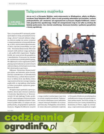 NASZE SPOTKANIA Już po raz 8. w Chrzypsku Wielkim, małej miejscowości w Wielkopolsce, odbyły się Międzynarodowe Targi Tulipanów (MTT), które co roku gromadzą miłośników tych kwiatów, zarówno profesjonalistów, jak i amatorów. Ich organizatorami są Grażyna i Bogdan Królikowie, właściciele gospodarstwa ogrodniczego. Dzięki ich zaangażowaniu targi te nie tylko są atrakcją dla lokalnej społeczności, lecz również umożliwiają biznesowe kontakty i spotkania specjalistów z branży ogrodniczej. Tym, co wyróżnia MTT od innych, podobnych imprez w kraju, jest pomysł uroczystego „chrztu” nowych odmian tulipana, którym nadaje się nazwy związane z rozpoznawalnymi w kraju politykami, np. w 2013 r. była to Jolanta Kwaśniewska, w 2014 r. był nim Leszek Miller, a w tym roku – Bronisław Komorowski. Obecność znanych osób podnosi rangę spotkania i, jak podkreślał organizator Bogdan Królik, jest zaszczytem dla gospodarzy i mieszkańców. Przyczynia się również do rozsławiania tej małej polskiej gminy. W najbliższym czasie organizatorzy MTT planują wprowadzenie na rynek nowych odmian tulipana, których patronami mają być słynni polscy sportowcy. Odmiana ‘Bronisław Komorowski’ jest późna, ma fioletowe, pełne kwiaty. Została wyhodowana w holenderskiej firmie De Geus, a cebule dostarczyła firma J. G. Baltus & Zn. Jan Baltus, który zaprezentował kwiaty nowego tulipana, podkreślił, że reprodukcję cebul będzie w Polsce prowadziło wyłącznie gospodarstwo Królik®. W tegorocznym spotkaniu, oprócz polityków, obecni byli również naukowcy z Instytutu Ogrodnictwa w Skierniewicach. Dr hab. Jadwiga Treder, profesor IO, reprezentująca Stowarzyszenie Producentów Ozdobnych Roślin Cebulowych podkreśliła, że tulipan nie jest polską marką, ale gospodarze spotkania Grażyna i Bogdan Królikowie uczynili REKLAMA 38 Rośliny Ozdobne Od lewej: Grażyna Królik, Bronisław Komorowski, Jan Baltus i Bogdan Królik FOT. A. ANDRZEJEWSKA FOT. A. ANDRZEJEWSKA 1–3.05.2016 r. Chrzypsko Wielkie Tulipanowa majówka W tym roku na plantacji można było podziwiać 450 odmian tulipanów z niego symbol rozsławiający nasz kraj na arenie międzynarodowej. Nadawanie nowym odmianom nazw polityków i innych sławnych Polaków ma wymiar patriotyczny. Prelegentka stwierdziła, że mimo obecności polityków majówka w Chrzypsku Wielkim to przykład godnej naśladowania integracji ponad podziałami politycznymi. Zwróciła uwagę, że kwiaciarstwo jest ważną działalnością biznesową w Polsce, ciągle się rozwijającą, a zaprezentowane podczas targów FOT. A. ANDRZEJEWSKA NASZE SPOTKANIA FOT. A. ANDRZEJEWSKA MTT co roku przyciągają wielu gości FOT. A. ANDRZEJEWSKA W szklarni Venlo i zblokowanych tunelach firmy Farmer można było zobaczyć lilie w różnych fazach wzrostu czyć uprawę lilii w różnych fazach wzrostu (m.in. odmian ‘Conca d’Or’, ‘Brindisi’, ‘Santander’, ‘Siberia’ oraz ‘Sorbonne’). Na terenie gospodarstwa przygotowano również stoiska firm. Obecne były m.in. Farmer – producent tuneli foliowych, Eko Darpol oferujący nawozy ekologiczne, KMK Agro – dystrybutor ciągników marki John Deer, deszczowni RM oraz innych maszyn do produkcji ogrodniczej, Kuhn – producent maszyn rolniczych. Na stoisku firmy Klasmann Deilmann prezentowano podłoża torfowe, a firma Fortis Technology pokazała zbiorniki do paliw. Tradycyjnie podczas targów odbyły się pokazy florystyczne. W tym roku dr hab. Agnieszka Krzymińska z Uniwersytetu Przyrodniczego w Poznaniu zaprezentowała kompozycje z tulipanami w roli głównej do dekoracji samochodów ślubnych. Zaznaczyła, że obecnie w modzie ślubnej dominują kwiaty zarówno w jasnych, jak i w zdecydowanych, odważnych barwach, np. ciemnofioletowe tulipany, Dr hab. Agnieszka Krzymińska podczas przygotowywania jednej z kompozycji do dekoracji samochodu ślubnego, a – efekt końcowy bogactwo odmian umożliwia poznanie potencjału tej branży. W tym roku na plantacji można było podziwiać 450 odmian tulipanów. W go- a spodarstwie uprawia się rośliny zarówno w polu, jak i pod osłonami. Podczas majówki w szklarni Venlo i zblokowanych tunelach firmy Farmer można było zoba- FOT. A. ANDRZEJEWSKA które pięknie komponują się z kwiatami w różnych odcieniach różu. Aleksandra Andrzejewska Redakcja „Warzywa” REKLAMA Rośliny Ozdobne 39
