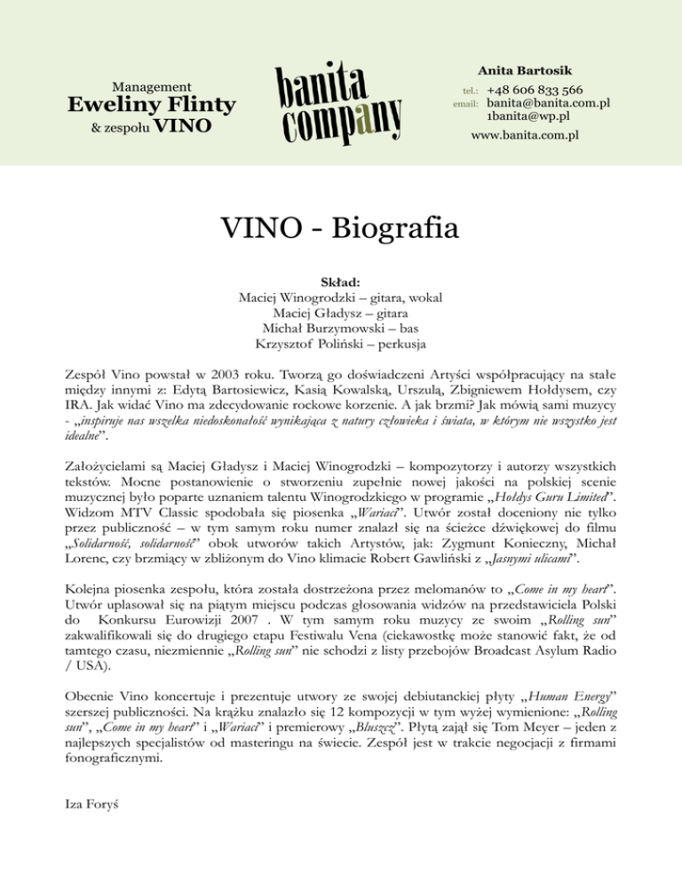 Anita Bartosik Management tel.: Eweliny Flinty email: & zespołu VINO +48 606 833 566 [email protected] [email protected] www.banita.com.pl VINO - Biografia Skład: Maciej Winogrodzki – gitara, wokal Maciej Gładysz – gitara Michał Burzymowski – bas Krzysztof Poliński – perkusja Zespół Vino powstał w 2003 roku. Tworzą go doświadczeni Artyści współpracujący na stałe między innymi z: Edytą Bartosiewicz, Kasią Kowalską, Urszulą, Zbigniewem Hołdysem, czy IRA. Jak widać Vino ma zdecydowanie rockowe korzenie. A jak brzmi? Jak mówią sami muzycy - „inspiruje nas wszelka niedoskonałość wynikająca z natury człowieka i świata, w którym nie wszystko jest idealne”. Założycielami są Maciej Gładysz i Maciej Winogrodzki – kompozytorzy i autorzy wszystkich tekstów. Mocne postanowienie o stworzeniu zupełnie nowej jakości na polskiej scenie muzycznej było poparte uznaniem talentu Winogrodzkiego w programie „Hołdys Guru Limited”. Widzom MTV Classic spodobała się piosenka „Wariaci”. Utwór został doceniony nie tylko przez publiczność – w tym samym roku numer znalazł się na ścieżce dźwiękowej do filmu „Solidarność, solidarność” obok utworów takich Artystów, jak: Zygmunt Konieczny, Michał Lorenc, czy brzmiący w zbliżonym do Vino klimacie Robert Gawliński z „Jasnymi ulicami”. Kolejna piosenka zespołu, która została dostrzeżona przez melomanów to „Come in my heart”. Utwór uplasował się na piątym miejscu podczas głosowania widzów na przedstawiciela Polski do Konkursu Eurowizji 2007 . W tym samym roku muzycy ze swoim „Rolling sun” zakwalifikowali się do drugiego etapu Festiwalu Vena (ciekawostkę może stanowić fakt, że od tamtego czasu, niezmiennie „Rolling sun” nie schodzi z listy przebojów Broadcast Asylum Radio / USA). Obecnie Vino koncertuje i prezentuje utwory ze swojej debiutanckiej płyty „Human Energy” szerszej publiczności. Na krążku znalazło się 12 kompozycji w tym wyżej wymienione: „Rolling sun”, „Come in my heart” i „Wariaci” i premierowy „Bluszcz”. Płytą zajął się Tom Meyer – jeden z najlepszych specjalistów od masteringu na świecie. Zespół jest w trakcie negocjacji z firmami fonograficznymi. Iza Foryś