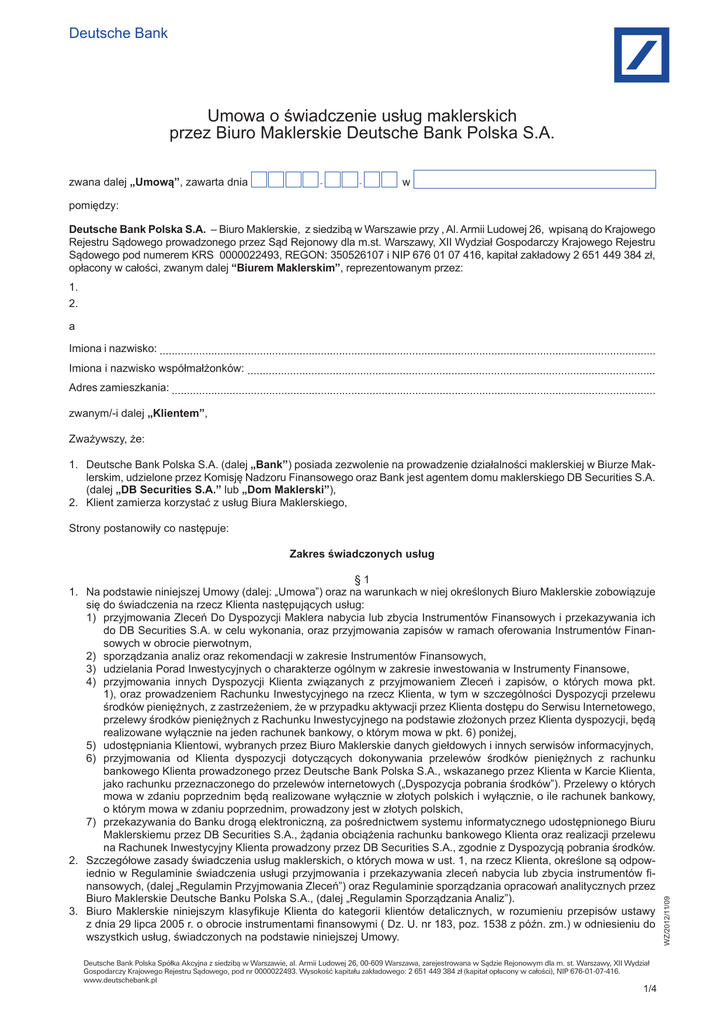 Deutsche Bank Umowa o świadczenie usług maklerskich przez Biuro Maklerskie Deutsche Bank Polska S.A. zwana dalej „Umową”, zawarta dnia - - w pomiędzy: Deutsche Bank Polska S.A. – Biuro Maklerskie, z siedzibą w Warszawie przy , Al. Armii Ludowej 26, wpisaną do Krajowego Rejestru Sądowego prowadzonego przez Sąd Rejonowy dla m.st. Warszawy, XII Wydział Gospodarczy Krajowego Rejestru Sądowego pod numerem KRS 0000022493, REGON: 350526107 i NIP 676 01 07 416, kapitał zakładowy 2 651 449 384 zł, opłacony w całości, zwanym dalej “Biurem Maklerskim”, reprezentowanym przez: 1. 2. a Imiona i nazwisko: ................................................................................................................................................................... Imiona i nazwisko współmałżonków: ...................................................................................................................................... Adres zamieszkania: ............................................................................................................................................................... zwanym/-i dalej „Klientem”, Zważywszy, że: 1. Deutsche Bank Polska S.A. (dalej „Bank”) posiada zezwolenie na prowadzenie działalności maklerskiej w Biurze Maklerskim, udzielone przez Komisję Nadzoru Finansowego oraz Bank jest agentem domu maklerskiego DB Securities S.A. (dalej „DB Securities S.A.” lub „Dom Maklerski”), 2. Klient zamierza korzystać z usług Biura Maklerskiego, Strony postanowiły co następuje: §1 1. Na podstawie niniejszej Umowy (dalej: „Umowa”) oraz na warunkach w niej określonych Biuro Maklerskie zobowiązuje się do świadczenia na rzecz Klienta następujących usług: 1) przyjmowania Zleceń Do Dyspozycji Maklera nabycia lub zbycia Instrumentów Finansowych i przekazywania ich do DB Securities S.A. w celu wykonania, oraz przyjmowania zapisów w ramach oferowania Instrumentów Finansowych w obrocie pierwotnym, 2) sporządzania analiz oraz rekomendacji w zakresie Instrumentów Finansowych, 3) udzielania Porad Inwestycyjnych o charakterze ogólnym w zakresie inwestowania w Instrumenty Finansowe, 4) przyjmowania innych Dyspozycji Klienta związanych z przyjmowaniem Zleceń i zapisów, o których mowa pkt. 1), oraz prowadzeniem Rachunku Inwestycyjnego na rzecz Klienta, w tym w szczególności Dyspozycji przelewu środków pieniężnych, z zastrzeżeniem, że w przypadku aktywacji przez Klienta dostępu do Serwisu Internetowego, przelewy środków pieniężnych z Rachunku Inwestycyjnego na podstawie złożonych przez Klienta dyspozycji, będą realizowane wyłącznie na jeden rachunek bankowy, o którym mowa w pkt. 6) poniżej, 5) udostępniania Klientowi, wybranych przez Biuro Maklerskie danych giełdowych i innych serwisów informacyjnych, 6) przyjmowania od Klienta dyspozycji dotyczących dokonywania przelewów środków pieniężnych z rachunku bankowego Klienta prowadzonego przez Deutsche Bank Polska S.A., wskazanego przez Klienta w Karcie Klienta, jako rachunku przeznaczonego do przelewów internetowych („Dyspozycja pobrania środków”). Przelewy o których mowa w zdaniu poprzednim będą realizowane wyłącznie w złotych polskich i wyłącznie, o ile rachunek bankowy, o którym mowa w zdaniu poprzednim, prowadzony jest w złotych polskich, 7) przekazywania do Banku drogą elektroniczną, za pośrednictwem systemu informatycznego udostępnionego Biuru Maklerskiemu przez DB Securities S.A., żądania obciążenia rachunku bankowego Klienta oraz realizacji przelewu na Rachunek Inwestycyjny Klienta prowadzony przez DB Securities S.A., zgodnie z Dyspozycją pobrania środków. 2. Szczegółowe zasady świadczenia usług maklerskich, o których mowa w ust. 1, na rzecz Klienta, określone są odpowiednio w Regulaminie świadczenia usługi przyjmowania i przekazywania zleceń nabycia lub zbycia instrumentów finansowych, (dalej „Regulamin Przyjmowania Zleceń”) oraz Regulaminie sporządzania opracowań analitycznych przez Biuro Maklerskie Deutsche Banku Polska S.A., (dalej „Regulamin Sporządzania Analiz”). 3. Biuro Maklerskie niniejszym klasyfikuje Klienta do kategorii klientów detalicznych, w rozumieniu przepisów ustawy z dnia 29 lipca 2005 r. o obrocie instrumentami finansowymi ( Dz. U. nr 183, poz. 1538 z późn. zm.) w odniesieniu do wszystkich usług, świadczonych na podstawie niniejszej Umowy. Deutsche Bank Polska Spółka Akcyjna z siedzibą w Warszawie, al. Armii Ludowej 26, 00-609 Warszawa, zarejestrowana w Sądzie Rejonowym dla m. st. Warszawy, XII Wydział Gospodarczy Krajowego Rejestru Sądowego, pod nr 0000022493. Wysokość kapitału zakładowego: 2 651 449 384 zł (kapitał opłacony w całości), NIP 676-01-07-416. www.deutschebank.pl 1/4 WZ/2012/11/09 Zakres świadczonych usług 4. Znaczenie wyrażeń pisanych z wielkiej litery, których definicji nie zawiera niniejsza Umowa określone jest w Regulaminie Przyjmowania Zleceń. W razie kolizji definicji rozstrzygające jest znaczenie nadane niniejszą Umową. §2 Klient jest zobowiązany do podania w Karcie Klienta Adresu Poczty Elektronicznej służącego w szczególności do nieodpłatnego otrzymywania potwierdzeń realizacji transakcji. W przypadku braku Adresu Poczty Elektronicznej potwierdzenia zawarcia transakcji będą wysyłane do Klienta listem zwykłym. Za wysłanie potwierdzenia transakcji listem zwykłym pobierana jest opłata zgodnie z Tabelą Opłat. Przyjmowanie Zleceń i innych Dyspozycji §3 1. Klient może składać Zlecenia i inne Dyspozycje pisemnie, za pośrednictwem telefonu, telefaxu lub z wykorzystaniem Serwisu Internetowego. Warunkiem składania zleceń z wykorzystaniem Serwisu Internetowego, jest aktywacja tej usługi zgodnie z Regulaminem Przyjmowania Zleceń. 2. W celu identyfikacji osoby składającej Zlecenie lub inną Dyspozycję za pośrednictwem telefonu, lub telefaxu strony ustalają hasło w brzmieniu określon