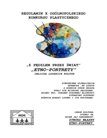 REGULAMIN X OGÓLNOPOLSKIEGO KONKURSU PLASTYCZNEGO „Z PĘDZLEM PRZEZ ŚWIAT” „ETNO-PORTRETY” OBLICZA LUDZKICH KULTUR POWSZECHNA GLOBALIZACJA SPRAWIŁA ,ŻE LUDZIE Z RÓŻNYCH STRON ŚWIATA STALI SIĘ BLISKIMI SĄSIADAMI. DZIĘKI TEJ, CZASAMI POZORNEJ BLISKOŚCI POTRAFIMY DOSTRZEC RÓŻNICE MIĘDZY LUDŹMI I ICH KULTURAMI. CHROŃ KULTURĘ, POZNAJ JĄ, DOCEŃ JEJ ODMIENNOŚĆ. STWÓRZ WŁASNY ETNO-PORTRET. ORGANIZATOR: Młodzieżowy Dom Kultury Wrocław-Krzyki Dyrektor: Małgorzata Brodzińska Koordynator konkursu: Iwona Gocyk pytania w sprawie konkursu proszę kierować na e-mail: [email protected] Koordynator Festiwalu Sztuka Łączy Pokolenia "Inspiracje Flamenco" Przenikanie Kultur: Anna Patkiewicz Konkurs „Z pędzlem przez świat” już od kilku lat stał się atrakcją w ramach festiwalu: „Sztuka Łączy Pokolenia Inspiracje Flamenco - Przenikanie Kultur”. Jest to organizowana przez MDK –Krzyki impreza międzynarodowa, która ma na celu przedstawienie wielu kultur, mających wpływ na powstanie sztuki Flamenco. W ramach Festiwalu przenikają się kultury, narodowości, inspiracje, ale nie tylko. Ideą przedsięwzięcia jest też udział w imprezie różnych pokoleń, ich wspólne projekty, wzajemne upowszechnianie szacunku wobec różnorodności. Więcej o festiwalu można dowiedzieć się na stronie: www.flamenco.mdk-krzyki.pl lub fanpage na facebooku pod hasłem: Festiwal Sztuka Łączy Pokolenia "Inspiracje Flamenco" Przenikanie Kultur. CELE KONKURSU: * przybliżenie i popularyzacja wybranej kultury świata (lub kilku), * inspirowanie specyficzną kulturą i wybranego kraju, wyglądem jego mieszkańców, * inspirowanie do pracy twórczej, * doskonalenie umiejętności warsztatowych, poznanie nowych technik, * wychowanie przez sztukę i dla sztuki, * prezentacja i konfrontacja możliwości twórczych w dziedzinie plastyki. ZASADY UCZESTNICTWA: Uczestnicy: uczniowie szkół podstawowych, gimnazjów, szkół ponadgimnazjalnych, uczestnicy zajęć pozaszkolnych, dorośli Tematyka: prace inspirowane ciekawą kulturą i sztuką wybranego regionu świata, jej charakterystycznym krajobrazem, tańcem, zwyczajami Format: nie większy niż 50 cm x 70 cm Technika: dowolne techniki plastyczne, w tym rzeźba, fotografia, ceramika i malarstwo olejne Ilość prac: dowolna Opisanie pracy: każda praca powinna być czytelnie podpisana na odwrocie: imię i nazwisko uczestnika, wiek, imię i nazwisko nauczyciela, pod którego kierunkiem została wykonana praca, nazwa i adres szkoły, placówki (telefon, fax., e- mail). KRYTERIA OCENY PRAC KONKURSOWYCH. Prace będą oceniane w następujących grupach wiekowych: 7 - 9 lat 10 - 13 lat 14 – 19 lat DOROŚLI TERMIN NADSYŁANIA PRAC DO 31.01.2017 NA ADRES: MŁODZIEŻOWY DOM KULTURY WROCŁAW-KRZYKI ul. Powstańców Śląskich 190 53-139 WROCŁAW z dopiskiem: „ETNO-PORTRETY” Do zestawu prac należy dołączyć listę autorów z podziałem na grupy wiekowe. WRĘCZENIE NAGRÓD I DYPLOMÓW nastąpi w marcu. O wynikach konkursu, terminie i miejscu wystawy laureaci zostaną powiadomieni mailowo lub telefonicznie. NAGRODY. Organizatorzy przewidują nagrody dla laureatów. Wyróżnieniem będzie ekspozycja prac w ramach IX edycji festiwalu: Sztuka Łączy Pokolenia Inspiracje Flamenco – Przenikanie Kultur. UWAGI KOŃCOWE: * nie dopuszcza się prac zbiorowych, * koszty przesłania i doręczenia prac pokrywa nadawca, * prace nie podlegają zwrotowi i pozostają do dyspozycji organizatorów, * organizatorzy konkursu zastrzegają sobie prawo publikowania i reprodukowania prac bez wypłacania honorariów autorskich, * koszt przejazdu po odbiór nagród pokrywa uczestnik, * nieodebrane nagrody w terminie trzech miesięcy od daty wręczania dyplomów przechodzą na własność organizatorów, * informacje o konkursie i jego wynikach będą również dostępne w Internecie pod adresem: www.mdk-krzyki.pl, * udział w konkursie jest równoznaczny z wyrażeniem zgody na przetwarzanie danych osobowych uczestnika dla potrzeb konkursu i wystawy (zgodnie z ustawą o ochronie danych osobowych z dnia 29.08. 1997 rok Dz. U. Nr 133 poz.833 z późniejszymi zmianami. ZAPRASZAMY DO UDZIAŁU W KONKURSIE !!! ORGANIZATORZY