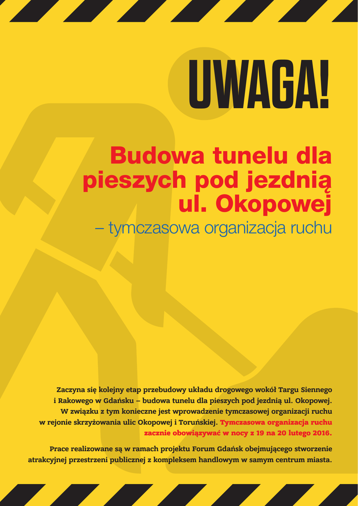 UWAGA! Budowa tunelu dla pieszych pod jezdnią ul. Okopowej – tymczasowa organizacja ruchu Zaczyna się kolejny etap przebudowy układu drogowego wokół Targu Siennego i Rakowego w Gdańsku – budowa tunelu dla pieszych pod jezdnią ul. Okopowej. W związku z tym konieczne jest wprowadzenie tymczasowej organizacji ruchu w rejonie skrzyżowania ulic Okopowej i Toruńskiej. Tymczasowa organizacja ruchu zacznie obowiązywać w nocy z 19 na 20 lutego 2016. Prace realizowane są w ramach projektu Forum Gdańsk obejmującego stworzenie atrakcyjnej przestrzeni publicznej z kompleksem handlowym w samym centrum miasta. Św ię Okopowa - Toruńska Hucisko KIERUNKU RUCHU W REJONIE SKRZYŻOWANIA ULIC OKOPOWA – TORUŃSKA Hucisko ellońskie Pierwszy etap prac rozpocznie się 22 lutego. W związku z tym konieczne jest zamknięcie przejazdu z ul. Okopowej w ul. Toruńską. Objazdy dla kierowców wyznaczone zostały ulicami Okopową, Augustyńskiego i Rzeźnicką. Toruń Wały Ja gi Targ y Okopowa Okopo tej Tró jc ska ZALECANE OBJAZDY DO UL. TORUŃSKIEJ Rako wy y Podwale Przedmie jskie Pod w ale Prze dm Rzeźn Okopowa Św ię Tró jc y Wały Ja gielloń sk Okopowa ie tej nicka Przypominamy, że nadal obowiązują wprowadzone w styczniu zmiany w rejonie al. Armii Krajowej i przejazdu ul. Okopową pod al. Armii Krajowej. Ruch na wiaduktach, którymi biegnie al. Armii Krajowej, jest zwężony o jeden pas w każdą stronę, ale wyłącznie w nocy, tylko w godz. 23:30-5:00. Natomiast przejazd ulicą Okopową pod al. Armii Krajowej w kierunku Pruszcza Gdańskiego został zwężony do jednego pasa. Zmiana organizacji ruchu w al. Armii Krajowej będzie obowiązywać do połowy roku, natomiast na ul. Okopowej – do końca Targ Rako wy wakacji. ie icka iejsk Rzeź Armii Krajowej Podwale Prz edmiejskie Krajowej Toruń a Żab i Kruk ska Tor u Okopowa Oko pow ńsk Targ W ęglow a y ia tad s ZWĘŻENIA PASÓW JEZDNI NA UL. OKOPOWEJ I AL. ARMII KRAJOWEJ icka La Rzeźn 3 Maja Okopowa 3 Maja Ale ja A rmi i Kra jow Wprowadzone zmiany mają na celu zachowanie ej podstawowych relacji na skrzyżowaniu Okopowa – Toruńska, a także utrzymanie dotychczasowej trasy dojazdu do Urzędu Wojewódzkiego i Marszałkowskiego. Aleja Arm ii Kra jow ej Podwale Pr Taka organizacja ruchu (z ewentualnymi drobnymi korektami) obowiązywać będzie przez cały okres budowy tunelu. Całość prac w tym rejonie powinna zakończyć się na przełomie maja i czerwca 2017 roku. zedm Podwale Przed miej opowa Aleja Armii Okopowa Okopowa Oko p owa Okopo wa Targ W ęglow Św ię tej Tr Hucisko O Forum Gdańsk Nadal trwają też intensywne prace w rejonie ul. Hucisko. Najprawdopodobniej potrwają one do drugiej połowy kwietnia. W tym czasie zostanie przygotowany alternatywny dojazd do terenu budowy przez ul. Nowe Podwale Grodzkie od strony północnej. Obecnie przy Hucisku wykonywana jest izolacja konstrukcji tunelu oraz jego obsypka. Następnym etapem będzie zakończenie przebudowy infrastruktury podziemnej (sieć wodociągowa, kanalizacyjna, sieci teletechniczne i energetyczne) w nowym tunelu. W dalszej kolejności nastąpi wzmocnienie podłoża gruntowego w obrębie skrzyżowania Hucisko/Targ Rakowy/Podwale Grodzkie. Na koniec zostaną tam wykonane warstwy asfaltowe nawierzchni drogowej. Niestety wcześniejsze otwarcie obu jezdni ul. Hucisko – przed zakończeniem tych prac – spowoduje konieczność powtórnego zamknięcia jednej jezdni dla zakończenia robót drogowych. Forum Gdańsk to nowa, atrakcyjna przestrzeń publiczna z kompleksem handlowym, która powstaje w samym centrum miasta w ramach rewitalizacji historycznego Targu Siennego i Targu Rakowego. Inwestycja obejmuje budowę Centrum Dziedzictwa Historycznego Miasta Gdańska oraz węzła przesiadkowego i infrastruktury drogowej wokół kompleksu. Projekt realizowany jest we współpracy pomiędzy Multi Poland i Gminą Miasta Gdańska oraz grupą PKP. Otwarcie kompleksu planowane jest na 2017 rok. Piesi Wprowadzane zmiany w organizacji ruchu nie wiążą się z dodatkowymi utrudnieniami w ruchu pieszym. Wokół terenu inwestycji piesi (i rowerzyści) nadal poruszają się tak, jak dotychczas. KOMUNIKACJA PIESZA I ROWEROWA W REJONIE HUCISKA Dworzec PKP Podwale Grodzk ie W ramach projektu Forum Gdańsk miasto zyska nowe rozwiązania infrastrukturalne. Na przebudowanym wiadukcie w ciągu al. Armii Krajowej powstanie węzeł przesiadkowy, który zintegruje komunikację autobusową, tramwajową i kolejową, w tym uruchomiony w 2015 roku przystanek SKM Gdańsk Śródmieście. Dzięki temu kompleks będzie doskonale skomunikowany ze wszystkimi częściami Trójmiasta oraz z regionem. Ponadto przebudowa wiaduktu usprawni przejazd do i z centrum Gdańska. Dogodny dojazd do obwodnicy trójmiejskiej sprawi, że do Forum Gdańsk z łatwością dostaną się również zmotoryzowani. OZNACZENIA drogi dla rowerów ciągi pieszo-rowerowe z pierwszeństwem pieszych W ał strefy piesze z dopuszczonym ruchem rowerów Ta Hucisko rg grody Nowe O 3 Maja Targ W ęglow y Urząd Miejski Okopowa Złota Brama ew ie ńsk ello agi tunel dla pieszych / rowerów i pieszych ny yJ ciągi piesze D rz Targ Rakowy stanie się ciągiem pieszym przechodzącym w plac miejski. Powstanie też ogólnodostępna ulica Nowe Podwale Grodzkie biegnąca pod budynkami wzdłuż torów kolejowych. Usprawni ona przejazd przez teren Forum Gdańsk. W rejonie inwestycji zmodernizowanych zostanie sześć skrzyżowań. Zrewitalizowane zostanie również przejście podziemne pod ul. Wały Jagiellońskie. Dalszy zakres prac wokół Targu Siennego i Rakowego Wprowadzane zmiany to nie ostatnie utrudnienia w rejonie Targu Siennego i Rakowego. Inwestycja również w przyszłości wymagać będzie zmian organizacji ruchu w najbliższym sąsiedztwie. O szczegółach zmian będziemy informować na bieżąco, natomiast orientacyjny zakres prac przedstawia poniższa tabela: Ulica 3 Maja / Rogaczewskiego Ulica Okopowa Aleja Armii Krajowej Węzeł