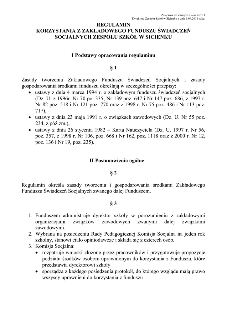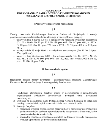 Załącznik do Zarządzenia nr 7/2011 Dyrektora Zespołu Szkół w Sicienku z dnia 1.09.2011 roku. REGULAMIN KORZYSTANIA Z ZAKŁADOWEGO FUNDUSZU ŚWIADCZEŃ SOCJALNYCH ZESPOŁU SZKÓŁ W SICIENKU I Podstawy opracowania regulaminu §1 Zasady tworzenia Zakładowego Funduszu Świadczeń Socjalnych i zasady gospodarowania środkami funduszu określają w szczególności przepisy: ustawy z dnia 4 marca 1994 r. o zakładowym funduszu świadczeń socjalnych (Dz. U. z 1996r. Nr 70 po. 335, Nr 139 poz. 647 i Nr 147 poz. 686, z 1997 r. Nr 82 poz. 518 i Nr 121 poz. 770 oraz z 1998 r. Nr 75 poz. 486 i Nr 113 poz. 717), ustawy z dnia 23 maja 1991 r. o związkach zawodowych (Dz. U. Nr 55 poz. 234, z póź.zm.), ustawy z dnia 26 stycznia 1982 – Karta Nauczyciela (Dz. U. 1997 r. Nr 56, poz. 357, z 1998 r. Nr 106, poz. 668 i Nr 162, poz. 1118 oraz z 2000 r. Nr 12, poz. 136 i Nr 19, poz. 235). II Postanowienia ogólne §2 Regulamin określa zasady tworzenia i gospodarowania środkami Zakładowego Funduszu Świadczeń Socjalnych zwanego dalej Funduszem. §3 1. Funduszem administruje dyrektor szkoły w porozumieniu z zakładowymi organizacjami związków zawodowych zwanymi dalej związkami zawodowymi. 2. Wybrana na posiedzeniu Rady Pedagogicznej Komisja Socjalna na jeden rok szkolny, stanowi ciało opiniodawcze i składa się z czterech osób. 3. Komisja Socjalna: rozpatruje wnioski złożone przez pracowników i przygotowuje propozycje podziału środków osobom uprawnionym do korzystania z Funduszu, które przedstawia dyrektorowi szkoły sporządza z każdego posiedzenia protokół, do którego wzglądu mają prawo wszyscy uprawnieni do korzystania z funduszu Załącznik do Zarządzenia nr 7/2011 Dyrektora Zespołu Szkół w Sicienku z dnia 1.09.2011 roku. §4 Uzgodnieniom ze związkami zawodowymi podlegają: regulamin Zakładowego Funduszu Świadczeń Socjalnych zmiany wprowadzane do istniejącego regulaminu w formie poprawek do tekstu oraz aneksów załączniki do regulaminu rozliczenie wydatkowania środków Funduszu za rok ubiegły wszelkie decyzje o przydziale świadczeń z Funduszu §5 1. Zakładowy Fundusz Świadczeń Socjalnych tworzy się z: corocznego odpisu podstawowego na każdego pracownika zatrudnionego, a także przebywającego na urlopie wychowawczym, wyliczonego od postawy (37,5% przeciętnego wynagrodzenia miesięcznego w gospodarce narodowej w roku poprzednim lub drugim półroczu roku poprzedniego), 8% planowanych rocznych środków przeznaczonych na wynagrodzenie osobowe nauczycieli. 2. Środki Funduszu są gromadzone na odrębnym rachunku bankowym. 3. Środki Funduszu niewykorzystane w danym roku kalendarzowym przechodzą na rok następny. Na realizację pkt 2-5 § 8 pozostawia się kwotę nie mniejszą niż kwota miesięcznego wynagrodzenia nauczyciela mianowanego w danym roku kalendarzowym. §6 Za błędne decyzje dotyczące administrowania Funduszem wszelką odpowiedzialność ponosi pracodawca. Związkom zawodowym przysługuje prawo dochodzenia roszczeń w przypadku niezgodnego z ustawą i innymi aktami prawnymi wydatkowania środków Funduszu. III Osoby uprawnione do korzystania z Funduszu §7 1. Do korzystania ze świadczeń Funduszu uprawnione są wszystkie osoby, którym prawo do korzystania z Funduszu dał przepis zawarty w art.2 pkt.4 ustawy oraz osoby, którym prawo to nadał pracodawca w uzgodnieniu ze związkami zawodowymi. Załącznik do Zarządzenia nr 7/2011 Dyrektora Zespołu Szkół w Sicienku z dnia 1.09.2011 roku. Są to w szczególności: pracownicy zatrudnieni na czas nieokreślony i określony na podstawie umowy o pracę, powołania, wyboru, mianowania - w pełnym i niepełnym, wymiarze czasu pracy pracownicy przebywający na urlopach wychowawczych, macierzyńskich, zdrowotnych i innych członkowie rodzin pracowników emeryci i renciści (byli pracownicy szkoły ) członkowie rodzin po zmarłych pracownikach oraz emerytach i rencistach, jeżeli byli na utrzymaniu osoby zmarłej i uzyskali rentę rodzinną 2. Do uprawnionych członków rodzin, o których mowa w ust. 3 i 4 regulaminu zalicza się: pozostające na utrzymaniu i wychowaniu osoby uprawnionej dzieci własne, dzieci współmałżonka, dzieci przysposobione oraz przyjęte na wychowanie w ramach rodziny zastępczej, wnuki i rodzeństwo w wieku do lat 18 a jeżeli kształcą się w szkole - do czasu ukończenia nauki, nie dłużej jednak niż do ukończenia 25 lat, lub 26 lat jeśli jest na ostatnim roku nauki. osoby wymienione w pkt. 1 ( niezdolne do żadnej pracy na podstawie orzeczenia lekarskiego ) bez względu na wiek IV Przeznaczenie Funduszu Świadczeń Socjalnych §8 Środki Funduszu przeznaczone są na działalność socjalną w zakresie: 1. Dofinansowywania różnych form wypoczynku urlopowego i wakacyjnego osób uprawnionych, zwłaszcza wczasów, sanatoriów, a także wypoczynku organizowanego we własnym zakresie Nauczycielom przysługuje obligatoryjnie określone art. 53 pkt la Karty Nauczyciela świadczenie urlopowe Nauczycielom, pracownikom administracji i obsługi przysługuje dofinansowanie określonej we wniosku pracownika formy wypoczynku (zależnie o sytuacji życiowej i materialnej pracownika, przyznawane według tabeli dopłaty stanowiącej załącznik do regulaminu) 2. Dofinansowywania działalności kulturalno - oświatowej w postaci imprez artystycznych, kulturalnych i (z wyłączeniem uroczystości szkolnych) oraz zakupu biletów wstępu na te imprezy. Załącznik do Zarządzenia nr 7/2011 Dyrektora Zespołu Szkół w Sicienku z dnia 1.09.2011 roku. 3. Dofinansowywanie działalności sportowo-rekreacyjnej organizowanej w postaci różnych ogólnodostępnych form rekreacji ruchowej, uczestnictwa w masowych imprezach sportowych lub zakupu biletów wstępu na imprezy sportowe i rekreacyjne. 4. Bezzwrotnych zapomóg losowych dla osób, które znalazły się w trudnej sytuacji życiowej, rodzinnej i materialnej np. z powodu sytuacji losowych (kradzież , włamanie, pożar , zalanie 