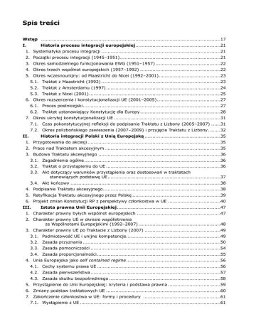 Spis treści Wstęp .....................................................................................................................17 I. Historia procesu integracji europejskiej........................................................21 1. Systematyka procesu integracji..............................................................................21 2. Początki procesu integracji (1945–1951)..................................................................21 3. Okres samodzielnego funkcjonowania EWG (1951–1957)...........................................22 4. Okres trzech wspólnot europejskich (1957–1992).....................................................22 5. Okres wczesnounijny: od Maastricht do Nicei (1992–2001).........................................23 5.1. Traktat z Maastricht (1992)..............................................................................23 5.2. Traktat z Amsterdamu (1997)...........................................................................24 5.3. Traktat z Nicei (2001)......................................................................................25 6. Okres rozszerzenia i konstytucjonalizacji UE (2001–2005)..........................................27 6.1. Proces postnicejski..........................................................................................27 6.2. Traktat ustanawiający Konstytucję dla Europy.....................................................28 7. Okres ukrytej konstytucjonalizacji UE......................................................................31 7.1. Czas pokonstytucyjnej refleksji do podpisania Traktatu z Lizbony (2005–2007).......31 7.2. Okres polizbońskiego zawieszenia (2007–2009) i przyjęcie Traktatu z Lizbony.........32 II. Historia integracji Polski z Unią Europejską..................................................35 1. Przygotowania do akcesji.......................................................................................35 2. Prace nad Traktatem akcesyjnym............................................................................35 3. Budowa Traktatu akcesyjnego................................................................................36 3.1. Zagadnienia ogólne.........................................................................................36 3.2. Traktat o przystąpieniu do UE...........................................................................36 3.3. Akt dotyczący warunków przystąpienia oraz dostosowań w traktatach . stanowiących podstawę UE..........................................................................37 3.4. Akt końcowy..................................................................................................38 4. Podpisanie Traktatu akcesyjnego.............................................................................38 5. Ratyfikacja Traktatu akcesyjnego przez Polskę..........................................................39 6. Projekt zmian Konstytucji RP z perspektywy członkostwa w UE...................................40 III. Istota prawna Unii Europejskiej....................................................................47 1. Charakter prawny byłych wspólnot europejskich.......................................................47 2. Charakter prawny UE w okresie współistnienia . ze Wspólnotami Europejskimi (1992–2007)......................................................48 3. Charakter prawny UE po Traktacie z Lizbony (2007)..................................................49 3.1. Podmiotowość UE i unijne kompetencje..............................................................49 3.2. Zasada przyznania..........................................................................................50 3.3. Zasada pomocniczości.....................................................................................54 3.4. Zasada proporcjonalności.................................................................................55 4. Unia Europejska jako self contained regime..............................................................56 4.1. Cechy systemu prawa UE.................................................................................56 4.2. Zasada pierwszeństwa.....................................................................................57 4.3. Zasada skutku bezpośredniego.........................................................................58 5. Przystąpienie do Unii Europejskiej: kryteria i podstawa prawna...................................59 6. Zmiany podstaw traktatowych UE...........................................................................60 7. Zakończenie członkostwa w UE: formy i procedury ...................................................61 7.1. Wystąpienie z UE............................................................................................61 —— 7.2. Wykluczenie z UE i wygaśnięcie traktatów..........................................................62 7.3. Zawieszenie obowiązywania traktatów...............................................................63 8. Kształt funkcjonalny UE.........................................................................................63 9. Symbolika Unii Europejskiej...................................................................................65 10.Uprawnienia w relacjach z innymi podmiotami prawa międzynarodowego.....................65 10.1.Prawo do zawierania traktatów.........................................................................65 10.2.Prawo legacji..................................................................................................67 10.3.Prawo do stosowania siły.................................................................................68 10.4.Zdolność UE do ponoszenia odpowiedzialności....................................................71 IV. Aksjologia Unii Europejskiej.........................................................................75 1. Kształtowanie się standard
