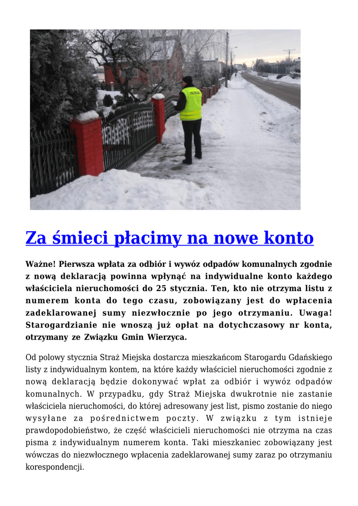 Za śmieci płacimy na nowe konto Ważne! Pierwsza wpłata za odbiór i wywóz odpadów komunalnych zgodnie z nową deklaracją powinna wpłynąć na indywidualne konto każdego właściciela nieruchomości do 25 stycznia. Ten, kto nie otrzyma listu z numerem konta do tego czasu, zobowiązany jest do wpłacenia zadeklarowanej sumy niezwłocznie po jego otrzymaniu. Uwaga! Starogardzianie nie wnoszą już opłat na dotychczasowy nr konta, otrzymany ze Związku Gmin Wierzyca. Od polowy stycznia Straż Miejska dostarcza mieszkańcom Starogardu Gdańskiego listy z indywidualnym kontem, na które każdy właściciel nieruchomości zgodnie z nową deklaracją będzie dokonywać wpłat za odbiór i wywóz odpadów komunalnych. W przypadku, gdy Straż Miejska dwukrotnie nie zastanie właściciela nieruchomości, do której adresowany jest list, pismo zostanie do niego wysyłane za pośrednictwem poczty. W związku z tym istnieje prawdopodobieństwo, że część właścicieli nieruchomości nie otrzyma na czas pisma z indywidualnym numerem konta. Taki mieszkaniec zobowiązany jest wówczas do niezwłocznego wpłacenia zadeklarowanej sumy zaraz po otrzymaniu korespondencji. Zgodnie z wcześniejszymi informacjami pierwsza płatność za odbiór i wywóz śmieci na nowe konto, podane przez Gminę Miejską Starogard Gdański, powinna nastąpić do 25 stycznia. Uwaga! Nie wnosimy już opłat na dotychczasowy nr konta, otrzymany ze Związku Gmin Wierzyca. Przypominamy też o obowiązku złożenia nowej deklaracji na odbiór odpadów komunalnych w Starogardzie Gdańskim. Wielu właścicieli i zarządców nieruchomości nie zrobiło tego jeszcze, a termin minął 30 listopada 2016 roku. W związku z tym informujemy, że konsekwencją niezłożenia deklaracji w trybie natychmiastowym będzie zaprzestanie z początkiem lutego obioru odpadów z nieruchomości .
