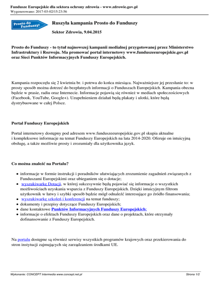 Fundusze Europejskie dla sektora ochrony zdrowia - www.zdrowie.gov.pl Wygenerowano: 2017-03-02/15:23:56 Ruszyła kampania Prosto do Funduszy Sektor Zdrowia, 9.04.2015 Prosto do Funduszy - to tytuł najnowszej kampanii medialnej przygotowanej przez Ministerstwo Infrastruktury i Rozwoju. Ma promować portal internetowy www.funduszeeuropejskie.gov.pl oraz Sieci Punktów Informacyjnych Funduszy Europejskich. Kampania rozpoczęła się 2 kwietnia br. i potrwa do końca miesiąca. Najważniejsze jej przesłanie to: w prosty sposób można dotrzeć do bezpłatnych informacji o Funduszach Europejskich. Kampania obecna będzie w prasie, radiu oraz Internecie. Informacje pojawią się również w mediach społeczościowych (Facebook, YouTube, Google+). Uzupełnieniem działań będą plakaty i ulotki, które będą dystrybuowane w całej Polsce. Portal Funduszy Europejskich Portal internetowy dostępny pod adresem www.funduszeeuropejskie.gov.pl skupia aktualne i kompleksowe informacje na temat Funduszy Europejskich na lata 2014-2020. Oferuje on intuicyjną obsługę, a także możliwie prosty i zrozumiały dla użytkownika język. Co można znaleźć na Portalu? informacje w formie instrukcji i poradników ułatwiających zrozumienie zagadnień związanych z Funduszami Europejskimi oraz ubieganiem się o dotacje; wyszukiwarkę Dotacji, w której sukcesywnie będą pojawiać się informacje o wszystkich możliwościach uzyskania wsparcia z Funduszy Europejskich. Dzięki intuicyjnym filtrom użytkownik w łatwy i szybki sposób będzie mógł odnaleźć interesujące go źródło finansowania; wyszukiwarkę szkoleń i konferencji na temat funduszy; dokumenty i przepisy dotyczące Funduszy Europejskich; dane kontaktowe Punktów Informacyjnych Funduszy Europejskich; informacje o efektach Funduszy Europejskich oraz dane o projektach, które otrzymały dofinansowanie z Funduszy Europejskich. Na portalu dostępne są również serwisy wszystkich programów krajowych oraz przekierowania do stron instytucji zajmujących się zarządzaniem środkami UE. Wykonanie: CONCEPT Intermedia www.concept.net.pl Strona 1/2 Fundusze Europejskie dla sektora ochrony zdrowia - www.zdrowie.gov.pl Wygenerowano: 2017-03-02/15:23:56 Punkty Informacyjne Funduszy Europejskich W całej Polsce działa 75 Punktów Informacyjnych Funduszy Europejskich (stan na 2 kwietnia 2015 r). Zlokalizowane są one w miastach wojewódzkich i w części miast powiatowych. Z konsultacji można skorzystać osobiście bądź wysłać pytanie mailowo lub zadzwonić. Dane kontaktowe poszczególnych Punktów dostępne są na Portalu Funduszy Europejskich w zakładce Punkty informacyjne. W Punktach Informacyjnych można uzyskać pomoc w ustaleniu, czy dany pomysł ma szansę na wsparcie z Funduszy Europejskich; poznać warunki, kryteria i procedury przyznania dofinansowania; skorzystać z konsultacji w trakcie przygotowywania wniosku oraz podczas realizacji projektu; zyskać pomoc przy rozliczaniu dofinansowanego projektu. Dodatkowo Punkty organizują szkolenia i spotkania informacyjne. We wszystkich Punktach obowiązują te same standardy obsługi m.in. ustalony, krótki czas na udzielenie odpowiedzi i wydłużone godziny pracy w poniedziałki. Dla mieszkańców mniejszych miejscowości organizowane są Mobilne Punkty Informacyjne (MPI). Ich istotą są specjalne dyżury konsultantów, podczas których udzielają oni informacji z zakresu Funduszy Europejskich. Wiadomości o prowadzonych Mobilnych Punktach Informacyjnych są publikowane w lokalnej prasie, na stronach internetowych gmin, w których odbywa się akurat MPI lub w zakładce Szkolenia i konferencje. Wykonanie: CONCEPT Intermedia www.concept.net.pl Strona 2/2