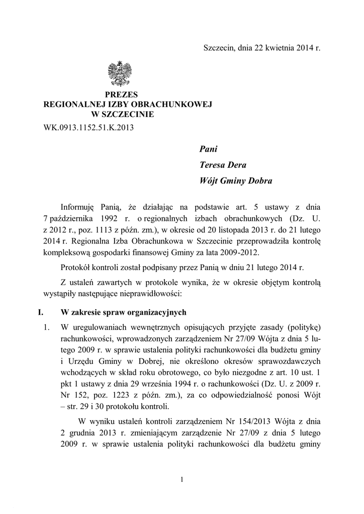 Szczecin, dnia 22 kwietnia 2014 r. PREZES REGIONALNEJ IZBY OBRACHUNKOWEJ W SZCZECINIE WK.0913.1152.51.K.2013 Pani Teresa Dera Wójt Gminy Dobra Informuję Panią, że działając na podstawie art. 5 ustawy z dnia 7 października 1992 r. o regionalnych izbach obrachunkowych (Dz. U. z 2012 r., poz. 1113 z późn. zm.), w okresie od 20 listopada 2013 r. do 21 lutego 2014 r. Regionalna Izba Obrachunkowa w Szczecinie przeprowadziła kontrolę kompleksową gospodarki finansowej Gminy za lata 2009-2012. Protokół kontroli został podpisany przez Panią w dniu 21 lutego 2014 r. Z ustaleń zawartych w protokole wynika, że w okresie objętym kontrolą wystąpiły następujące nieprawidłowości: I. 1. W zakresie spraw organizacyjnych W uregulowaniach wewnętrznych opisujących przyjęte zasady (politykę) rachunkowości, wprowadzonych zarządzeniem Nr 27/09 Wójta z dnia 5 lutego 2009 r. w sprawie ustalenia polityki rachunkowości dla budżetu gminy i Urzędu Gminy w Dobrej, nie określono okresów sprawozdawczych wchodzących w skład roku obrotowego, co było niezgodne z art. 10 ust. 1 pkt 1 ustawy z dnia 29 września 1994 r. o rachunkowości (Dz. U. z 2009 r. Nr 152, poz. 1223 z późn. zm.), za co odpowiedzialność ponosi Wójt – str. 29 i 30 protokołu kontroli. W wyniku ustaleń kontroli zarządzeniem Nr 154/2013 Wójta z dnia 2 grudnia 2013 r. zmieniającym zarządzenie Nr 27/09 z dnia 5 lutego 2009 r. w sprawie ustalenia polityki rachunkowości dla budżetu gminy 1 i Urzędu Gminy Dobra określono wchodzące w skład roku obrotowego okresy sprawozdawcze. II. W zakresie spraw finansowych 1. Na wyprzedzające finansowanie działań finansowanych ze środków pochodzących z Unii Europejskiej, w dniu 22 grudnia 2010 r. jednostka samorządu terytorialnego zaciągnęła z kredyt w wysokości 1 563 000,00 zł bez uzyskania opinii regionalnej izby obrachunkowej o możliwości jego spłaty, co było niezgodne z art. 91 ust. 2 ustawy z dnia 27 sierpnia 2009 r. o finansach publicznych (Dz. U. Nr 157, poz. 1240 z późn. zm.). Ponadto ww. kredyt został zaciągnięty: § z przekroczeniem limitu zobowiązań z tytułu zaciąganych kredytów i pożyczek oraz emitowanych papierów wartościowych na finansowanie planowanego deficytu budżetu jednostki samorządu terytorialnego, § bez zwiększenia kwoty przychodów budżetu z podanego tytułu, zaplanowanych przez Radę Gminy uchwałą Nr XXXIII/489/09 z dnia 30 grudnia 2009 r. w wysokości 4 755 144,00 zł (odpowiednio: § 11 i § 4) i wynikających z umowy Nr 682/2010/00004135/00 z dnia 29 kwietnia 2010 r. zawartej z bankiem o zaciągnięciu kredytu przeznaczonego na sfinansowanie deficytu budżetu związanego z realizacją zadania "Budowa sali gimnastycznej przy szkole w Bezrzeczu”, czym naruszono art. 91 ust. 1 w zw. z art. 212 ust. 1 pkt 4 i pkt 6 ustawy z dnia 27 sierpnia 2009 r. o finansach publicznych. Za wskazane nieprawidłowości odpowiedzialność ponosi Wójt, która – wbrew obowiązkowi wynikającemu z art. 30 ust. 2 pkt 1 ustawy z dnia 8 marca 1990 r. o samorządzie gminnym (Dz. U. z 2001 r. Nr 142, poz. 1591 z późn. zm.) – nie przygotowała i nie przedłożyła organowi stanowiącemu jednostki samorządu terytorialnego projektu uchwały w sprawie zmiany budżetu Gminy na rok 2010 w podanym zakresie – str. 188-190 protokołu kontroli. 2. Wskutek błędu pracownika zobowiązanie w wysokości 105 000,00 zł, stanowiące spłatę kolejnej raty pożyczki zaciągniętej przez Gminę w wysokości 5 000 000,00 zł na podstawie umowy z dnia 12 stycznia 1998 r., zawartej z Wojewódzkim Funduszem Ochrony Środowiska i Gospodarki Wodnej w Szczecinie, uregulowano 4 dni po terminie ustalonym § 4 ust. 5 ww. umowy, tj. w dniu 4 grudnia 2012 r. zamiast do dnia 30 listopada 2012 r., co było niezgodne z art. 44 ust. 3 pkt 3 ustawy z dnia 27 sierpnia 2009 r. o finansach publicznych, za co odpowiedzialność ponosi Inspektor 2 ds. płac, któremu powierzono przygotowanie dowodu w postaci przelewu środków finansowych na zapłatę ww. zobowiązania, a z nadzoru Skarbnik – str. 195 i 196 protokołu kontroli. W wyniku opisanego zaniechania z budżetu jednostki samorządu terytorialnego zapłacono odsetki w kwocie 166,85 zł, których wartość w dniu 24 stycznia 2013 r. została zwrócona na rachunek Urzędu przez pracownika odpowiedzialnego na wystąpienie opisanej nieprawidłowości. 3. Opłatę za zezwolenie na sprzedaż napojów alkoholowych wniesioną przez przedsiębiorcę w dniu 16 grudnia 2009 r. w kwocie 3 150,00 zł ujęto w § 0460-Wpływy z opłaty eksploatacyjnej, zamiast w § 0480-Wpływy z opłat za zezwolenia na sprzedaż napojów alkoholowych, co było niezgodne z zasadami klasyfikowania tego rodzaju dochodów, określonymi § 1 pkt 3 rozporządzenia Ministra Finansów z dnia 14 czerwca 2006 r. w sprawie szczegółowej klasyfikacji dochodów, wydatków, przychodów i rozchodów oraz środków pochodzących ze źródeł zagranicznych (Dz. U. Nr 107, poz. 726 z późn. zm.), za co odpowiedzialność ponosi Inspektor ds. księgowości budżetowej, a z nadzoru Skarbnik – str. 98 protokołu kontroli. W trakcie kontroli stwierdzono również inne nieprawidłowości, które zostały opisane w protokole z kontroli, jednak z uwagi na ich mniejszy ciężar gatunkowy nie zostały wskazane w niniejszym wystąpieniu pokontrolnym. W celu wyeliminowania stwierdzonych nieprawidłowości koniecznym jest bezwzględne przestrzeganie wszystkich norm prawnych oraz podjęcie następujących działań: I. W zakresie spraw finansowych 1. Przestrzegania obowiązku uzyskania opinii regionalnej izby obrachunkowej o możliwości spłaty kredytu lub pożyczki w przypadku ubiegania się przez jednostkę samorządu terytorialnego o kredyt lub pożyczkę na wyprzedzające finansowanie działań finansowanych ze środków pochodzących z budżetu Unii Europejskiej. 2. Zaciągania kredytów i pożyczek wyłącznie do wysokości limitów zobowiązań z podan