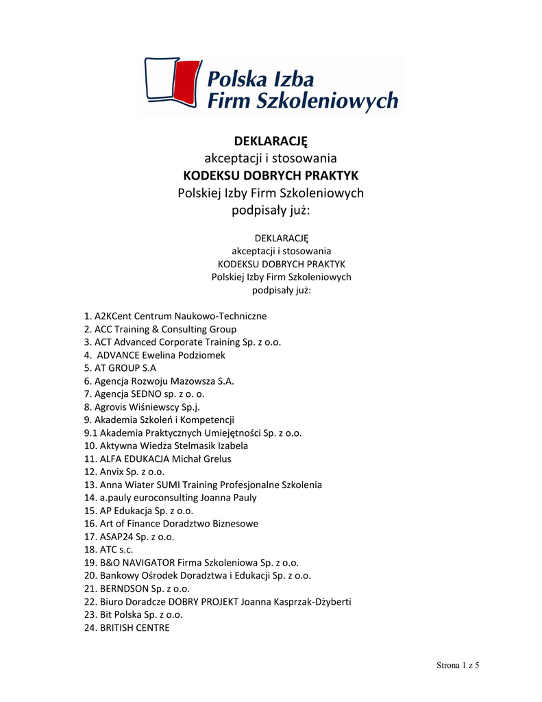 DEKLARACJĘ akceptacji i stosowania KODEKSU DOBRYCH PRAKTYK Polskiej Izby Firm Szkoleniowych podpisały już: DEKLARACJĘ akceptacji i stosowania KODEKSU DOBRYCH PRAKTYK Polskiej Izby Firm Szkoleniowych podpisały już: 1. A2KCent Centrum Naukowo-Techniczne 2. ACC Training & Consulting Group 3. ACT Advanced Corporate Training Sp. z o.o. 4. ADVANCE Ewelina Podziomek 5. AT GROUP S.A 6. Agencja Rozwoju Mazowsza S.A. 7. Agencja SEDNO sp. z o. o. 8. Agrovis Wiśniewscy Sp.j. 9. Akademia Szkoleń i Kompetencji 9.1 Akademia Praktycznych Umiejętności Sp. z o.o. 10. Aktywna Wiedza Stelmasik Izabela 11. ALFA EDUKACJA Michał Grelus 12. Anvix Sp. z o.o. 13. Anna Wiater SUMI Training Profesjonalne Szkolenia 14. a.pauly euroconsulting Joanna Pauly 15. AP Edukacja Sp. z o.o. 16. Art of Finance Doradztwo Biznesowe 17. ASAP24 Sp. z o.o. 18. ATC s.c. 19. B&O NAVIGATOR Firma Szkoleniowa Sp. z o.o. 20. Bankowy Ośrodek Doradztwa i Edukacji Sp. z o.o. 21. BERNDSON Sp. z o.o. 22. Biuro Doradcze DOBRY PROJEKT Joanna Kasprzak-Dżyberti 23. Bit Polska Sp. z o.o. 24. BRITISH CENTRE Strona 1 z 5 25. BUSINESS CENTER 1 26. Centrum CBT Sp. z o.o. 27. Centrum Edukacji Ekspert 28. Centrum Edukacji Grupa Orlen 29. Centrum Edukacji Zawodowej CARGO 30. Centrum Doradztwa i Kształcenia Kadr P.W. „ZBRYK” 31. Centrum Doradztwa i Szkoleń HOMO CREATORE Strona 2 z 5 32. Centrum Kreowania Liderów S.A. 33. Centrum Kształcenia i Szkolenia Sp. z o.o. 34. Centrum Rozwiązań Menedżerskich S.A. 35. Centrum Rozwoju Coaching i Szkolenia 36. Centrum Szkoleniowo-Doradcze "KREATOR" Alina Plata 37. Centrum Szkolenia Zawodowego Sp. z o.o. 38. Centrum Tłumaczeń, Doradztwa i Edukacji PRAGMATIC 39. KORA Centrum Szkoleń 40. Centrum Szkolenia i Promocji „Prestige” 41. Centrum Szkoleniowe MENTOR 42. Centrum Szkoleń i Innowacji Grzegorz Miszczak 43. Certes Sp. z o.o. 44. CoachWise S.A. 45. COMARTIN - Szkolenia, Konsulting, Badania Rynku 46. Communication One Consulting Sp. z o.o. 47. Conart Sp. z o.o. 48. CONSULTING Firma Doradczo-Szkoleniowa Julita Orłowska-Szczepańska 49. Consultor Sp. Z o.o. 50. Consulman Pl Sp. z o.o. 51. CS Szkolenie I Doradztwo Sp. z o.o. 52. CE2 Centrum Edukacji M. Dziewa, E. Tarnas-Szwed Sp.j. 53. Creator Sp. z o.o. 54.Deinde Sp. z o.o. 55.DOOR GROUP S.A. 56.DOSCO Sp. z o.o. 57.DOSKAM Sp. z o.o. 58. CEDEGO 59. EDORADCA Sp. z o.o. SKA 60. EMT-SYSTEMS Grzegorz Wszołek 61. English Unlimited Sp. z o.o. 62. ETTA Monika Chutnik 63. EUROPEAN EDU CENTER 64. Europejski Instytut Edukacji Informatycznej 65. Europejski Instytut Psychologii Biznesu sp.j. 66. Europejskie Centrum Kształcenia "Eureka" Sp. z o.o. 67. Eurotraining - szkolenia i doradztwo Katarzyna Gieniec-Sarna 68. Eurocentrum Innowacji i Przedsiębiorczości 69. EXBIS Eksperci Biznesmenom - Szopa i Szóstak Sp. J. Strona 2 z 5 70.Danish Technological Institute Polska Sp. z o.o. (dawniej FIRMA 2000 Sp. z o.o.) 71. Firma Szkoleniowa TRAKT 72. "FORTY" doradztwo gospodarczo-kadrowe Małgorzata Kuc-Wojteczek 73. Fundacja Edukacja Bez Granic 74. Fundacja Nauki Języków Obcych „Linguae Mundi” 75. Fundacja Rozwoju Bankowości Spółdzielczej we Wrocławiu 76. Fundacja „Wałbrzych 2000” 77. Fundacja Warszawski Instytut Bankowości Strona 3 z 5 78.GB Resources Polska Sp. z o.o. 79.Gdańskie Wydawnictwo Oświatowe spółka z o.o. sp. k. 80.Grupa Doradcza Projekt Sp. z o.o. 81.Grupa EK’s Polska 82.Grupa OSB s.c. 83.Halibut Grupa Szkoleniowa Jakub Pałczyński 84. H-consulting Wojciech Hołowacz 85.HEIDTMAN&PIASECKI 86. Konsorcjum doradczo - szkoleniowe S.A 87.HRP Czernecka, Jaszczyński sp.j. 88.Human Partner 89.Human Solutions E. Borowska, E. Pytlak Sp.j. 90. IDES Consultants Polska Sp. z o.o. 91. IMPACT POLSKA Sp. z o.o. 92. INCASO GROUP SP. Z O.O. 93. INCEPT Adam Tittinger i Wspólnik Spółka Jawna 94. INSPIRE Centrum Rozwoju Umiejętności s.c. Jakub Poradzisz, Lidia Poradzisz 95. Instytut Samorządu i Administracji Sp. z o.o. 96. INTEGRA Consulting 97. "INFO-BIZ" Profesjonalna Edukacja Mariola Wiśniewska 98. Inventi Consulting s.c. 99. Invento Marta Kowalczyk 100. INVICTUS Sp. z o.o. Ośrodek Konsultingowo Szkoleniowy 101. IRP Inwestycje-Rozwój-Personel Jarosław Niemczyk 102. J.G. Training Jadwiga Gwóźdź 103. JGL Logistics Wojtysiak Spółka Jawna 104. KDK INFO Sp. z o.o. 105. Centrum "TROP" Sp. z o.o. 106. Kontekst HR Sp. z o.o. 107. Kontrakt-OSH J.Gut, W.Haman, R.Zych Sp. J 108. Korporacja Umiejętności - ARKA Marcin Rogowski 109. Lauren Peso Polska S.A 110. Learn UP Sp. z o.o. 111. LEBIEDŹ CONSULTING Tomasz Lebiedź 112. Lechaa Consulting Sp. z o.o. 113. LP Products - Centrum Szkoleń i Kalibracji s.c Edward Lupa 114. Szkoła Języków Obcych MANDRAGORA Małgorzata Krawczyk Strona 3 z 5 115. M&M Centrum Kształcenia Pielęgniarek s.c. 116. Marzena Biuro Reklamowo – Handlowe Zbigniew Banaszek 117. MCS sp. z o.o. sp. k. (dawniej Mazowieckie Centrum Szkoleń sp. z o.o.) 118. Meditor Ośrodek Kształcenia Ustawicznego 119. MEDIATOR Ośrodek Szkoleń i Doradztwa Gospodarczego Małgorzata Wierzęć 120. Miedziowe Centrum Kształcenia Kadr Sp. z o.o. 121. MIĘDZYNARDOWA SZKOŁA BANKOWOŚCI I FINANSÓW Sp. z o.o. 122. MindLab Sp. z o.o. 123. MODERATOR s.c. Strona 4 z 5 124. MPM Productivity Management Sp. z o.o. 125. MTD Marek Dziduszko 126. Nowe Motywacje Sp. z o.o. 127. OSI CompuTrain SA 128. Ośrodek Doradztwa i Treningu Kierowniczego Spółdzielnia 129. Ośrodek Kształcenia Zawodowego „Elpro” Sp. z o.o. 130. Ośrodek Pomocy i Edukacji Psychologicznej INTRA 131. Ośrodek Szkoleń i Informacji EFFECT 132. Ośrodek Szkolenia Technicznego Sp. z o.o. 133. O.K. Centrum Języków Obcych Sp. z o.o. 134. PAIZ Konsulting Sp. z o o. 135. PDC Consensus 136. Pegaz Group Sp. z o.o. 137. Personel Profit Sp. z o.o. 138. Perspektywa Tomasz Tynderenda 139. P.H.U. „QT SYSTEM” 140. PM – Doradztwo Gospodarcze Sp. z o.o. 141. PM GROUP LAAX Sp. z o.o. Sp. k. (dawniej PM GROUP Zubrycki, Panasewicz Sp.j.) 142. Podkarpacka Akademia Przedsiębiorczośc