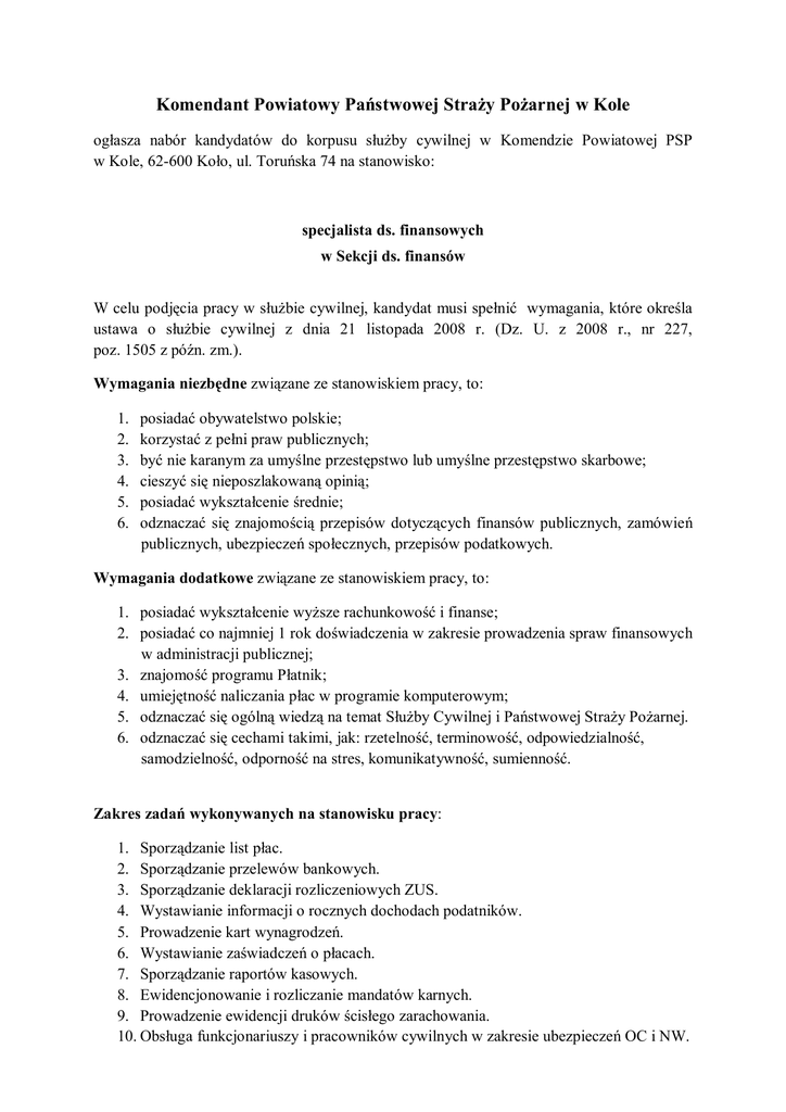 Komendant Powiatowy Państwowej Straży Pożarnej w Kole ogłasza nabór kandydatów do korpusu służby cywilnej w Komendzie Powiatowej PSP w Kole, 62-600 Koło, ul. Toruńska 74 na stanowisko: specjalista ds. finansowych w Sekcji ds. finansów W celu podjęcia pracy w służbie cywilnej, kandydat musi spełnić wymagania, które określa ustawa o służbie cywilnej z dnia 21 listopada 2008 r. (Dz. U. z 2008 r., nr 227, poz. 1505 z późn. zm.). Wymagania niezbędne związane ze stanowiskiem pracy, to: 1. 2. 3. 4. 5. 6. posiadać obywatelstwo polskie; korzystać z pełni praw publicznych; być nie karanym za umyślne przestępstwo lub umyślne przestępstwo skarbowe; cieszyć się nieposzlakowaną opinią; posiadać wykształcenie średnie; odznaczać się znajomością przepisów dotyczących finansów publicznych, zamówień publicznych, ubezpieczeń społecznych, przepisów podatkowych. Wymagania dodatkowe związane ze stanowiskiem pracy, to: 1. posiadać wykształcenie wyższe rachunkowość i finanse; 2. posiadać co najmniej 1 rok doświadczenia w zakresie prowadzenia spraw finansowych w administracji publicznej; 3. znajomość programu Płatnik; 4. umiejętność naliczania płac w programie komputerowym; 5. odznaczać się ogólną wiedzą na temat Służby Cywilnej i Państwowej Straży Pożarnej. 6. odznaczać się cechami takimi, jak: rzetelność, terminowość, odpowiedzialność, samodzielność, odporność na stres, komunikatywność, sumienność. Zakres zadań wykonywanych na stanowisku pracy: 1. Sporządzanie list płac. 2. Sporządzanie przelewów bankowych. 3. Sporządzanie deklaracji rozliczeniowych ZUS. 4. Wystawianie informacji o rocznych dochodach podatników. 5. Prowadzenie kart wynagrodzeń. 6. Wystawianie zaświadczeń o płacach. 7. Sporządzanie raportów kasowych. 8. Ewidencjonowanie i rozliczanie mandatów karnych. 9. Prowadzenie ewidencji druków ścisłego zarachowania. 10. Obsługa funkcjonariuszy i pracowników cywilnych w zakresie ubezpieczeń OC i NW. Wymagane dokumenty: 1. życiorys i podanie o pracę; 2. kopie dokumentów potwierdzających wykształcenie i uprawnienia; 3. oświadczenie kandydata o korzystaniu z pełni praw publicznych i o niekaralności (druk do pobrania na naszej stronie internetowej lub w komórce kadr tut. komendy); 4. oświadczenie kandydata o wyrażeniu zgody na przetwarzanie danych osobowych do celów rekrutacji (druk do pobrania na naszej stronie internetowej lub w komórce kadr tut. komendy); 5. kopia dowodu osobistego; 6. kopie świadectw pracy; 7. rekomendacje lub opinie z miejsc pracy. Warunki pracy: Praca wykonywana od poniedziałku do piątku w godz. od 7.30 do 15.30 w siedzibie tut. jednostki. Możliwość wyjazdów służbowych w ramach narad szkoleniowych. Miejsce i otoczenie organizacyjno-techniczne: Brak wystąpienia szkodliwych, uciążliwych i niebezpiecznych warunków pracy. Praca wykonywana przy komputerze. Inne informacje: 1. Rekrutację prowadzi Komisja Kwalifikacyjna Powiatowego PSP w Kole. 2. Postępowanie kwalifikacyjne polegało będzie na: powołana przez Komendanta weryfikacji wymaganych dokumentów pod względem formalnym przez Komisję Kwalifikacyjną; rozmowie kwalifikacyjnej Komendanta Powiatowego PSP w Kole z kandydatami w obecności Komisji Kwalifikacyjnej. Podczas rozmowy zostanie sprawdzona wiedza kandydatów z zakresu przepisów dotyczących finansów publicznych, zamówień publicznych, ubezpieczeń społecznych, przepisów podatkowych oraz ogólnej wiedzy na temat Służby Cywilnej i Państwowej Straży Pożarnej. 3. Dokumenty należy składać do dnia 06 kwietnia 2012 r. w Komendzie Powiatowej PSP w Kole, ul. Toruńska 74, 62-600 Koło (w komórce ds. kadr lub PSK) lub przesyłać pocztą z dopiskiem „Nabór KSC”– liczy się data stempla pocztowego. Oferty, które nie spełnią wymogów formalnych i niezbędnych, niekompletne oraz złożone po terminie nie będą brane pod uwagę. Kandydaci zakwalifikowani zostaną powiadomieni telefonicznie o terminie postępowania rekrutacyjnego. Oferty osób nie zakwalifikowanych będą przechowywane przez okres 2 lat w Wydziale Kwatermistrzowsko-Kadrowym KP PSP w Kole jako dokumentacja dowodowa. Dodatkowe informacje można uzyskać pod nr tel. (0-63) 26-28-123.