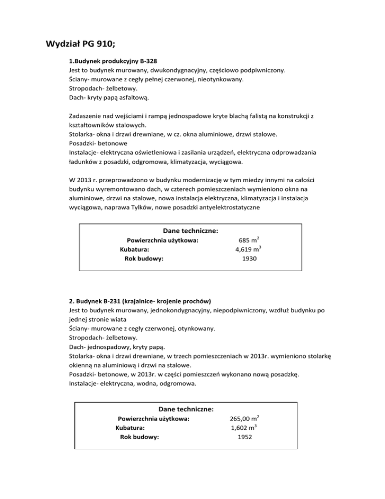 Wydział PG 910; 1.Budynek produkcyjny B-328 Jest to budynek murowany, dwukondygnacyjny, częściowo podpiwniczony. Ściany- murowane z cegły pełnej czerwonej, nieotynkowany. Stropodach- żelbetowy. Dach- kryty papą asfaltową. Zadaszenie nad wejściami i rampą jednospadowe kryte blachą falistą na konstrukcji z kształtowników stalowych. Stolarka- okna i drzwi drewniane, w cz. okna aluminiowe, drzwi stalowe. Posadzki- betonowe Instalacje- elektryczna oświetleniowa i zasilania urządzeo, elektryczna odprowadzania ładunków z posadzki, odgromowa, klimatyzacja, wyciągowa. W 2013 r. przeprowadzono w budynku modernizację w tym miedzy innymi na całości budynku wyremontowano dach, w czterech pomieszczeniach wymieniono okna na aluminiowe, drzwi na stalowe, nowa instalacja elektryczna, klimatyzacja i instalacja wyciągowa, naprawa Tylków, nowe posadzki antyelektrostatyczne Dane techniczne: Powierzchnia użytkowa: Kubatura: Rok budowy: 685 m2 4,619 m3 1930 2. Budynek B-231 (krajalnice- krojenie prochów) Jest to budynek murowany, jednokondygnacyjny, niepodpiwniczony, wzdłuż budynku po jednej stronie wiata Ściany- murowane z cegły czerwonej, otynkowany. Stropodach- żelbetowy. Dach- jednospadowy, kryty papą. Stolarka- okna i drzwi drewniane, w trzech pomieszczeniach w 2013r. wymieniono stolarkę okienną na aluminiową i drzwi na stalowe. Posadzki- betonowe, w 2013r. w części pomieszczeo wykonano nową posadzkę. Instalacje- elektryczna, wodna, odgromowa. Dane techniczne: Powierzchnia użytkowa: Kubatura: Rok budowy: 265,00 m2 1,602 m3 1952 3.Budynek B-163 (podsuszki- suszenie ziarna prochowego) Jest to budynek murowany, jednokondygnacyjny, niepodpiwniczony. Ściany- murowane z cegły czerwonej, nieotynkowany. Stropodach- drewniany. Dach- dwuspadowy, kryty papą. Stolarka- okna i drzwi drewniane. Posadzki- betonowe. Instalacje- elektryczna, odgromowa. Dane techniczne: Powierzchnia użytkowa: Kubatura: Rok budowy: 53,88 m2 295m3 1928 4.Budynek B- 64 (bęben polerowniczy- polerowanie prochów) Jest to budynek murowany, jednokondygnacyjny, niepodpiwniczony. Ściany- murowane z cegły czerwonej, nieotynkowany. Stropodach- na części wyższej żelbetowy, na części niższej drewniany. Dach- dwuspadowy, kryty papą. Stolarka- w części użytkowej (ok.2/3 budynku) okna i drzwi wymienione na nowe drewniane. Posadzki- betonowe. Instalacje- elektryczna, odgromowa, wodna, c.o.. Dane techniczne: Powierzchnia użytkowa: Kubatura: Rok budowy: 292,87 m2 1,796m3 1924 5.Budynek B-284 (mieszalnik prochów- mieszanie i ujednorodnianie prochów) Jest to budynek murowany, na części dwukondygnacyjny, niepodpiwniczony. Ściany- murowane z cegły pełnej czerwonej, nieotynkowany. Strop- żelbetowy, monolityczny płytowo-żebrowy. Stropodach- żelbetowy. Dach- jednospadowy, płaski, kryty papą. Stolarka- okna, drzwi, wrota drewniane. Posadzki- betonowe. Instalacje- elektryczna, odgromowa, wodna. Dane techniczne: Powierzchnia użytkowa: Kubatura: Rok budowy: 333,00 m2 2,537m3 1955 6.Budynek B-526 (prasa odwadniająca- odwadnianie ciśnieniowe nitrocelulozy) Jest to budynek murowany, jednokondygnacyjny, niepodpiwniczony. Ściany- murowane z cegły czerwonej, nieotynkowany. Stropodach- żelbetowy. Dach- dwuspadowy, kryty papą. Stolarka- okna i drzwi drewniane. Posadzki- betonowe. Instalacje- elektryczna, odgromowa, wodna. Dane techniczne: Powierzchnia użytkowa: Kubatura: Rok budowy: 89,00 m2 1,145m3 1928 7.Budynek B-626 (prasa odwadniająca- odwadnianie ciśnieniowe nitrocelulozy) Jest to budynek murowany, jednokondygnacyjny, niepodpiwniczony. Ściany- murowane z cegły pełnej czerwonej, otynkowany. Stropodach- żelbetowy. Dach- dwuspadowy płaski, kryty papą. Stolarka- okna i drzwi drewniane. Posadzki- betonowe. Instalacje- elektryczna, odgromowa, wodna. Dane techniczne: Powierzchnia użytkowa: Kubatura: Rok budowy: 208,00 m2 2,204m3 1950 8.Budynek B-428 (krajalnica gilotynowa- cięcie prochów) Jest to budynek murowany, jednokondygnacyjny, niepodpiwniczony. Ściany- murowane z cegły czerwonej, nieotynkowany. Stropodach- żelbetowy. Dach- dwuspadowy, kryty papą. Stolarka- okna i drzwi drewniane. Posadzki- betonowe. Instalacje- elektryczna, odgromowa, wodna. Dane techniczne: Powierzchnia użytkowa: Kubatura: Rok budowy: 515,50 m2 3,048m3 1954 9.Budynek B-295 (B-195 adsorbery- rekuperacja eteru etylowego) Jest to budynek murowany, jednokondygnacyjny, niepodpiwniczony. Ściany- murowane z cegły czerwonej, nieotynkowany. Stropodach- żelbetowy. Dach- dwuspadowy, kryty papą. Stolarka- okna i drzwi drewniane, cz. stalowa. Posadzki- betonowe. Instalacje- elektryczna, odgromowa, wodna. Dane techniczne: Powierzchnia użytkowa: Kubatura: Rok budowy: 469,00 m2 3.950,43m3 1950 10. Budynek B-98 ( zbiorniki magazynowe- magazynowanie eteru) Jest to budynek murowany, jednokondygnacyjny, niepodpiwniczony. Ściany- murowane z cegły czerwonej, nieotynkowany. Stropodach- drewniany. Dach- dwuspadowy, kryty papą. Stolarka- okna i drzwi drewniane. Posadzki- betonowe. Instalacje- elektryczna, wod.-kan.. Dane techniczne: Powierzchnia użytkowa: Kubatura: Rok budowy: 27,00 m2 173,43m3 1924 11. Budynek N-10 ( mieszanie ciasta prochowego) Jest to budynek murowany, jednokondygnacyjny, niepodpiwniczony. Ściany- murowane z cegły czerwonej pełnej, nieotynkowany. Stropodach- drewniany. Dach- dwuspadowy, kryty papą. Stolarka- okna i drzwi drewniane. Posadzki- betonowe. Instalacje- elektryczna, c.o., odgromowa. Dane techniczne: Powierzchnia użytkowa: Kubatura: Rok budowy: 122,70 m2 698,07m3 1936 12. Budynek B-23 (instalacja do produkcji eteru) Jest to budynek murowany, jednokondygnacyjny, niepodpiwniczony. Ściany- murowane z cegły czerwonej, nieotynkowany. Stropodach- drewniany. Dach- konstrukcja stalowa, kryty papą. Stolarka- okna, drzwi, wrota stalowe. Posadzki- betonowe. Instalacje- elektryczna i wodna. Dane techniczne: Powierzchnia użytkowa: Kubatura: Rok budowy: 1.080,00 m2 6,788m3 1924 WYDZIAŁ PH 13. Budyne
