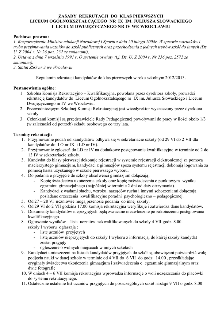 ZASADY REKRUTACJI DO KLAS PIERWSZYCH LICEUM OGÓLNOKSZTAŁCĄCEGO NR IX IM. JULIUSZA SŁOWACKIEGO I LICEUM DWUJĘZYCZNEGO NR IV WE WROCŁAWIU Podstawa prawna: 1. Rozporządzenie Ministra edukacji Narodowej i Sportu z dnia 20 lutego 2004r. W sprawie warunków i trybu przyjmowania uczniów do szkół publicznych oraz przechodzenia z jednych trybów szkół do innych (Dz. U. Z 2004 r. Nr 26 poz. 232 ze zmianami), 2. Ustawa z dnia 7 września 1991 r. O systemie oświaty (t.j. Dz. U. Z 2004 r. Nr 256 poz. 2572 ze zmianami), 3. Statut ZSO nr 3 we Wrocławiu Regulamin rekrutacji kandydatów do klas pierwszych w roku szkolnym 2012/2013. Postanowienia ogólne: 1. Szkolna Komisja Rekrutacyjno – Kwalifikacyjna, powołana przez dyrektora szkoły, prowadzi rekrutację kandydatów do Liceum Ogólnokształcącego nr IX im. Juliusza Słowackiego i Liceum Dwujęzycznego nr IV we Wrocławiu. 2. Przewodniczącym Szkolnej Komisji Rekrutacyjnej jest wicedyrektor wyznaczony przez dyrektora szkoły. 3. Członkami komisji są przedstawiciele Rady Pedagogicznej powoływani do pracy w ilości około 1/3 (w zależności od potrzeb) składu osobowego co trzy lata. Terminy rekrutacji: 1. Przyjmowanie podań od kandydatów odbywa się w sekretariacie szkoły (od 29 VI do 2 VII dla kandydatów do LO nr IX i LD nr IV). 2. Przyjmowanie zgłoszeń do LD nr IV na dodatkowe postępowanie kwalifikacyjne w terminie od 2 do 13 IV w sekretariacie szkoły. 3. Kandydat do klasy pierwszej dokonuje rejestracji w systemie rejestracji elektronicznej za pomocą macierzystego gimnazjum, kandydaci z gimnazjów spoza systemu rejestracji dokonują logowania za pomocą hasła uzyskanego w szkole pierwszego wyboru. 4. Do podania o przyjęcie do szkoły absolwenci gimnazjum dołączają: - Kopię świadectwa ukończenia szkoły oraz kopię zaświadczenia o punktowym wyniku egzaminu gimnazjalnego (najpóźniej w terminie 2 dni od daty otrzymania). - Kandydaci z wadami słuchu, wzroku, narządów ruchu i innymi schorzeniami dołączają posiadane orzeczenia kwalifikacyjne poradni psychologiczno – pedagogicznej. 5. Od 27 – 28 VI uczniowie mogą przenosić podania do innej szkoły. 6. Od 29 VI do 2 VII godzina 17.00 komisja rekrutacyjna weryfikuje i zatwierdza dane kandydatów. 7. Dokumenty kandydatów nieprzyjętych będą zwracane niezwłocznie po zakończeniu postępowania kwalifikacyjnego. 8. Ogłoszenie wyników – lista uczniów zakwalifikowanych do szkoły 4 VII godz. 8.00. szkoły I wyboru ogłaszają : - listę uczniów przyjętych - listę uczniów nieprzyjętych do szkoły I wyboru z informacją, do której szkoły kandydat został przyjęty - ogłoszenie o wolnych miejscach w innych szkołach 9. Kandydaci umieszczeni na listach kandydatów przyjętych do szkół są obowiązani potwierdzić wolę podjęcia nauki w danej szkole w terminie od 4 VII do 6 VII do godz. 14.00 , przedkładając oryginały świadectwa ukończenia gimnazjum i zaświadczenia o egzaminie gimnazjalnym oraz dwie fotografie . 10. W dniach 4 – 6 VII komisja rekrutacyjna wprowadza informacje o woli uczęszczania do placówki do systemu rekrutacyjnego. 11. Ostatecznie ustalenie list uczniów przyjętych do poszczególnych szkół nastąpi 9 VII o godz. 8.00 Zasady punktacji decydujące o przyjęciu do szkoły 1. Kandydat może uzyskać 100 punktów rekrutacyjnych: 50% punktów rekrutacyjnych za egzamin gimnazjalny: 10% język polski 10 % historia i WOS 10 % matematyka 10 % geografia, fizyka, chemia, biologia 10 % język obcy 40% punktów z 4 przedmiotów ze świadectwa ukończenia gimnazjum: do klas A: j. polski , matematyka , fizyka , historia do klasy B: j. polski, j. angielski, matematyka, fizyka. do klas C1 , C2 , D: j. polski, j. angielski, matematyka, biologia do klas E, F: j. polski, j. angielski, matematyka , historia. do klasy G: j. polski, matematyka, geografia, historia. do klasy H (LD nr IV): j. polski, matematyka, geografia, historia Punkty liczone są według schematu: oceny z przedmiotów: celujący – 10 punktów bardzo dobry – 8 punktów dobry – 6 punktów dostateczny – 4 punkty dopuszczający – 0 punktów 10 % za osiągnięcia - w tym: 2 pkt. za świadectwo ukończenia gimnazjum z wyróżnieniem, max. 5 pkt. za udział w konkursach organizowanych przez Kuratora Oświaty, co najmniej na szczeblu wojewódzkim (1 konkurs 2 pkt., 2 konkursy 4 pkt., 3 i więcej 5 pkt.) max. 2 pkt. za osiągnięcia sportowe i artystyczne i przedmiotowe, co najmniej na szczeblu powiatowym. max. 1 pkt. za : udział w wolontariacie, działalność w organizacjach młodzieżowych, w samorządzie szkolnym, gazetce szkolnej; zachowanie wzorowe. Osiągnięcia ucznia muszą być wymienione na świadectwie ukończenia gimnazjum, jeżeli nie są kandydaci – laureaci lub finaliści konkursów przedmiotowych dołączają zaświadczenia wydane przez komisję konkursową - co najmniej na szczeblu wojewódzkim (dla konkursów organizowanych przez Kuratora Oświaty), osiągnięcia sportowe lub artystyczne lub wiedzy - co najmniej na szczeblu powiatowym, do dokumentacji składanej przez kandydata. 2. Laureaci ostatniego stopnia wojewódzkich konkursów przedmiotowych z zakresu jednego z grupy przedmiotów objętych egzaminem gimnazjalnym są zwolnieni odpowiednio z części humanistycznej lub matematyczno – przyrodniczej egzaminu. Uprawnienie do zwolnienia wystawia OKE. 3. Laureaci konkursów przedmiotowych o zasięgu wojewódzkim i ponadwojewódzkim których program obejmuje w całości lub poszerza treści podstawy programowej co najmniej jednego przedmiotu , przyjmowani są do wybranej szkoły ponadgimnazjalnej niezależnie od kryteriów o których mowa powyżej. (Punkt ten nie dotyczy klas objętych dodatkowym postępowaniem rekrutacyjnym – klasy sportowe, dwujęzyczne) 4. Przy przyjmowaniu do szkoły, w przypadku równorzędnych wyników uzyskanych w postępowaniu kwalifikacyjnym: pierwszeństwo mają : a) sieroty , osoby przebywające w placówkach opiekuńc