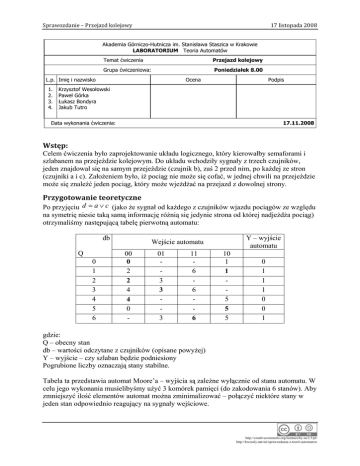 Sprawozdanie – Przejazd kolejowy 17 listopada 2008 Akademia Górniczo Górniczo-Hutnicza Hutnicza im. Stanisława Staszica w Krakowie LABORATORIUM Teoria Automatów Temat ćwiczenia Przejazd kolejowy Grupa ćwiczeniowa: Poniedziałek 8.00 L.p. Imię i nazwisko 1. 2. 3. 4. Ocena Podpis Krzysztof Wesołowski Paweł Górka Łukasz Bondyra Jakub Tutro Data wykonania ćwiczenia: 17.11.2008 Wstęp: Celem ćwiczenia ćwiczenia było zaprojektowanie układu logicznego, który kierowałby semaforami i szlabanem na przejeździe przeje dzie kolejowym. Do układu wchodziły sygnały z trzech czujników, jeden znajdował się si na samym przeje przejeździe ździe dzie (czujnik b), zaś za 2 przed nim, po ka kaŜdej dej ze stron (czujniki a i c). ZałoŜeniem Zało eniem było, iŜ i pocią pociąg nie moŜe Ŝe się si cofać, ć,, w jednej chwili na przeje przejeździe moŜe Ŝe się znaleźć źć jeden poci pociąg, ąg, g, który moŜ moŜe mo wjeŜdŜać Ŝać na przejazd z dowolnej strony. Przygotowanie teoretyczne d = a ∨ c (jako Ŝe Po przyjęciu przyję Ŝe sygnał od kaŜdego ka dego z czujników wjazdu poci pociągów gów ze względu wzgl na symetrię symet niesie taką tak samąą informację informacj róŜnią ró sięę jedynie strona od której nadje nadjeŜdŜa Ŝa pociąg) poci otrzymali my następującą otrzymaliśmy nastę tabelę tabel pierwotną automatu: automatu db Q 0 1 2 3 4 5 6 Y – wyj wyjście automatu Wejś automatu Wejście 00 0 2 2 4 4 0 - 01 3 3 3 11 6 6 6 10 1 1 5 5 5 0 1 1 1 0 0 1 gdzie: Q – obecny stan db – wartości warto ci odczytane z czujników (opisane powyŜej) powy powyŜ Y – wyjście wyjś – czy szlaban będzie będzie dzie podniesiony Pogrubione liczby oznaczają oznacz ą stany stabilne. Tabela ta przedstawia automat Moore’a – wyjścia cia są zaleŜne ne wyłą wyłącznie cznie od stanu automatu. W celu jego wykonania musielibyśmy musieliby musielibyś uŜyć Ŝ ć 3 komórek pamięci pami ci (do zakodowania 6 stanów). Aby zmniejszy ilość zmniejszyć ść elementów automat mo moŜna zminimalizować moŜna zminimalizowa – połączyćć niektóre stany w jeden stan odpowiednio reagujący reaguj cy na sygnały we reagują wejściowe. ściowe. http://creativecommons.org/licenses/by http://creativecommons.org/licenses/by-sa/2.5/pl/ http://kwesoly.net/air/sprawozdania http://kwesoly.net/air/sprawozdania-z-teorii teorii-automatow Sprawozdanie – Przejazd kolejowy 17 listopada 2008 Przy minimalizacji moŜemy mo emy minimalizować minimalizowa automat zarówno do automatu Moore’a jak i Mealy’ego, jednak w tej sytuacji lepsze okazało się się zastosowanie automatu Mealy’ego – udało się zmniejszyć ilość ść stanów do 4 co pozwoli zapamiętywać zapami tywać stan w dwóch je jednostkach dnostkach pamięci. ęci. Po zminimalizowaniu automat posiadał 4 stany, które od razu postanowiliśmy postanowili my zakodować zakodowa za pomocą bitów: Q -stan(y) q1, q2 – bity pamięci 0 00 1,2 01 3,4,6 11 5 10 Po wpisaniu kodować kodowa (powyŜszych) szych) i poł połą połączonych czonych stanów tabela minimalnego automatu Moore’a wygląda wygląda tak: db q1, q2 00 01 11 10 00 01 11 10 00, 0 01 , 1 11, 0 00, 0 -, 11, 1 11, 1 -, - -,, 11, 1 11, 1 -,, - 01, 1 01, 1 10, 0 10, 0 W kaŜdej Ŝdej dej komórce zapisujemy stan do którego ma przejść przej automat (zakodowany bitowo), oraz po przecinku wyjście wyj cie które ma być być ustawione dla stanu po lewej i wejś wej wejścia cia powyŜej. Kolejnym krokiem jest rozpisanie tabel dla q1’, q2’ oraz Y’. Tabele te będą będą przedstawiać przedstawia nowe wartości warto ci bitów stanu (q1 i q2) oraz wyj wyjście cie dla danego stanu i wejścia. we ścia. cia. Tworzymy je przepisuj c odpowiednie części przepisując części ci pół z powy powyŜszej szej tabelki. Tabelka dla q1’: q1’ db q1, q2 00 01 11 10 00 01 11 10 0 0 1 0 1 1 - 1 1 - 0 0 1 1 Pokryliśmy Pokryliś my pola tabelki tak aby otrzyma otrzymać jedynki i zera tam gdzie są s wymagane. Poza tym wykorzystali my my wykorzystaliśmy myślniki – pola o wartości warto ci dowolnej (gdyŜ wartoś (gdyŜ w rzeczywisto rzeczywistoś rzeczywistości ci sytuacja w której by wystąpiły wystąpiły się si nie moŜe moŜ zdarzyć) ć)) do stworzenia najprostszych funkcji logicznych. PowyŜsza Ŝsza sza tabela, zwana tabel tabelą Karnaugha arnaugha pozwala w prosty sposób uzyskać najprostsze sze funkcje logiczne. Im większy wi kszy jest prostokąt prostoką prostok o będącej ącej potęgą pot ą dwójki ilości ilości ci pól z jedynk jedynką tym prostsza postać postać funkcji logicznej. W tym w wypadku ypadku pozostaje nam zapisanie ka kaŜdego dego pokrycia jako prostej funkcji logicznej (czyli koniunkcji odpowiednich wyrazów pochodz pochodzących cych z http://creativecommons.org/licenses/by http://creativecommons.org/licenses/by-sa/2.5/pl/ http://kwesoly.net/air/sprawozdania http://kwesoly.net/air/sprawozdania-z-teorii teorii-automatow Sprawozdanie – Przejazd kolejowy 17 listopada 2008 pierwszego wiersza/kolumny) i zsumowanie ich za pomocą pomocą alternatywy. Otrzymana funkcja to: q1 ' = b ∨ q1q 2 ∨ dq1 Tabelka dla q2’: q2’ db q1, q2 00 01 11 10 00 01 11 10 0 1 1 0 1 1 - 1 1 - 1 1 0 0 W powyŜszej powyŜszej tabelce (którą (którą moŜna mo na znaleźć równieŜŜ w instrukcji), poza podanymi (brązowymi) ązowymi) zowymi) pokryciami trzeba było uwzgl uwzględnićć teŜ pokrycie czerwone. Istniał tu bowiem hazard statyczny jedynki występujący wyst wystę cy gdy w stanie kodowanym 01 wejście wejście cie zmieniało się si 10<->000 (naleŜy Ŝy pami pamiętaćć Ŝee w tabeli Karnaugha skrajne pola są s swoimi są sąsiadami).. Jako Ŝe nasz automat jest automatem asynchronicznym i wszystkie zmiany występuj występują jako prawie natychmiastowa reakcja na zmianę zmian wejścia ścia,, bez likwidacji tego hazardu wyst występowało powało zjawisko sko wyścig
