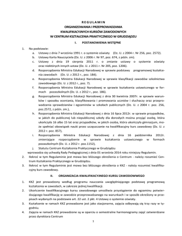 REGULAMIN ORGANIZOWANIA I PRZEPROWADZANIA KWALIFIKACYJNYCH KURSÓW ZAWODOWYCH W CENTRUM KSZTAŁCENIA PRAKTYCZNEGO W GRUDZIĄDZU I. POSTANOWIENIA WSTĘPNE 1. Na podstawie: a. Ustawy z dnia 7 września 1991 r. o systemie oświaty (Dz. U. z 2004 r. Nr 256, poz. 2572). b. Ustawy Karta Nauczyciela (Dz. U. z 2006 r. Nr 97, poz. 674, z późn. zm). c. Ustawy z dnia 19 sierpnia 2011 r. o zmianie ustawy o systemie oświaty oraz niektórych innych ustaw (Dz. U. z 2011 r. Nr 205, poz. 1206). d. Rozporządzenia Ministra Edukacji Narodowej w sprawie podstawy programowej kształcenia zawodach (Dz. U. z 2012 r., poz. 184). e. Rozporządzenia Ministra Edukacji Narodowej w sprawie klasyfikacji zawodów szkolnictwa zawodowego (Dz. U. z 2012 r., poz. 7). f. Rozporządzenia Ministra Edukacji Narodowej w sprawie kształcenia ustawicznego w formach pozaszkolnych (Dz. U. z 2012 r., poz. 186). g. Rozporządzenia Ministra Edukacji Narodowej z dnia 30 kwietnia 2007r. w sprawie warunków i sposobu oceniania, klasyfikowania i promowania uczniów i słuchaczy oraz przeprowadzania sprawdzianów i egzaminów w szkołach publicznych (Dz. U. z 2004 r. poz. 256, poz.2572, z późn. zm.), h. Rozporządzenia Ministra Edukacji Narodowej z dnia 16 lipca 2012r. w sprawie przypadków, w jakich do publicznej lub niepublicznej szkoły dla dorosłych można przyjąć osobę, która ukończyła 16 albo 15 lat oraz przypadków, w jakich osoba, która ukończyła gimnazjum, może spełniać obowiązek nauki przez uczęszczanie na kwalifikacyjny kurs zawodowy (Dz. U. z 2012 r. poz. 857), i. Rozporządzenia Ministra Edukacji Narodowej z dnia 16 października 2012r. zmieniające rozporządzenie w sprawie kształcenia ustawicznego w formach pozaszkolnych (Dz. U. z 2012 r. poz.1152), j. Statutu Centrum Kształcenia Praktycznego w Grudziądzu wprowadza się uchwałą Rady Pedagogicznej z dnia 01 września 2014 roku niniejszy Regulamin. 2. Ilekroć w tym Regulaminie jest mowa bez bliższego określenia o Centrum - należy rozumieć Centrum Kształcenia Praktycznego w Grudziądzu. 3. Ilekroć w tym Regulaminie jest mowa bez bliższego określenia o KKZ - należy rozumieć kwalifikacyjny kurs zawodowy. II. 1. 2. 3. 4. ORGANIZACJA KWALIFIKACYJNEGO KURSU ZAWODOWWEGO KKZ jest prowadzony według programu nauczania uwzględniającego podstawę programową kształcenia w zawodach, w zakresie jednej kwalifikacji. Ukończenie kwalifikacyjnego kursu zawodowego umożliwia przystąpienie do egzaminu potwierdzającego kwalifikację w zawodzie przeprowadzanego na warunkach i w sposób określony w przepisach wydanych na podstawie art. 22 ust. 2 pkt. 4 Ustawy o systemie oświaty. Kształcenie w ramach KKZ prowadzone jest jako stacjonarne, zajęcia odbywają się trzy razy w tygodniu. Zajęcia w ramach KKZ prowadzone są w oparciu o semestralne harmonogramy zajęć zatwierdzane przez dyrektora Centrum 1 5. Zajęcia prowadzone są w blokach składających się z 6 jednostek dydaktycznych. Jedna jednostka dydaktyczna trwa 45 min. 6. KKZ prowadzony za zgodą organu prowadzącego jest nieodpłatny. 7. Centrum może organizować odpłatnie KKZ na zamówienie pracodawców, urzędów pracy, innych organizacji. 8. Liczba słuchaczy uczestniczących w KKZ wynosi co najmniej 20 i nie przekracza 24 osób. 9. Za zgodą organu prowadzącego liczba słuchaczy na KKZ może być mniejsza niż 20. 10. Warunki i tryb organizowania praktycznej nauki zawodu na KKZ określają przepisy wydane na podstawie art. 70 ust. 4 ustawy o systemie oświaty. 11. O przyjęcie na KKZ mogą ubiegać się osoby pełnoletnie, które ukończyły co najmniej gimnazjum lub ośmioletnią szkołę podstawową. 12. Osoby niepełnoletnie kwalifikowane są do udziału w KKZ na podstawie odrębnych przepisów. 13. Jeżeli liczba osób chętnych do uczestnictwa w KKZ przekracza 24, uczestnicy wyłaniani są w drodze postępowania rekrutacyjnego prowadzonego przez Komisję rekrutacyjną powoływaną każdorazowo przez dyrektora Centrum. 14. Przy wyłanianiu uczestników KKZ w drodze postępowania rekrutacyjnego pierwszeństwo mają kandydaci nie posiadający żadnych kwalifikacji zawodowych. 15. Dodatkowe kryteria naboru określa Regulamin rekrutacji KKZ. 16. Warunkiem uczestnictwa w KKZ jest wypełnienie karty zgłoszenia uczestnictwa na formularzu stanowiącym załącznik do Regulaminu i dostarczenie nie później niż w 30 dniu od daty rozpoczęcia KKZ: a. świadectwa ukończenia szkoły, b. zaświadczenia lekarskiego o braku przeciwwskazań zdrowotnych do podjęcia praktycznej nauki zawodu w danej kwalifikacji. 17. Wnioski zgłoszeniowe przyjmowane są w sekretariacie od maja do sierpnia każdego roku. 18. O terminie rozpoczęcia i zakończenia KKZ decyduje dyrektor Centrum. 19. Warunkiem ukończenia kursu jest nie mniejsza niż 60% frekwencja na wszystkich zajęciach i uzyskanie zaliczeń z wszystkich przedmiotów objętych kursem. 20. Zaliczenia z przedmiotu przeprowadzane są w formie testów i/lub zadań praktycznych. Testy i zadania praktyczne wraz z kryteriami oceniania opracowuje nauczyciel prowadzący zajęcia z przedmiotu a zatwierdza dyrektor Centrum. 21. Uczestnik który ukończył KKZ otrzymuje zaświadczenie według załącznika Nr 5 do Rozporządzenia Ministra Edukacji Narodowej w sprawie kształcenia ustawicznego w formach pozaszkolnych. 22. Frekwencja na zajęciach i zaliczenia z przedmiotów odnotowywane są w dzienniku KKZ 23. Uczestnik KKZ posiadający: a. dyplom potwierdzający kwalifikacje zawodowe lub inny równorzędny, b. świadectwo uzyskania tytułu zawodowego, dyplom uzyskania tytułu mistrza lub inny równorzędny, c. świadectwo czeladnicze lub dyplom mistrzowski, d. świadectwo ukończenia szkoły prowadzącej kształcenie zawodowe, e. świadectwo ukończenia liceum profilowanego, f. świadectwo potwierdzające kwalifikację w zawodzie, g. zaświadczenie o ukończeniu kwalifikacyjnego kursu zawodowego, jest zwalniany, na swój wniosek złożony dyrektorowi Centrum z zaj
