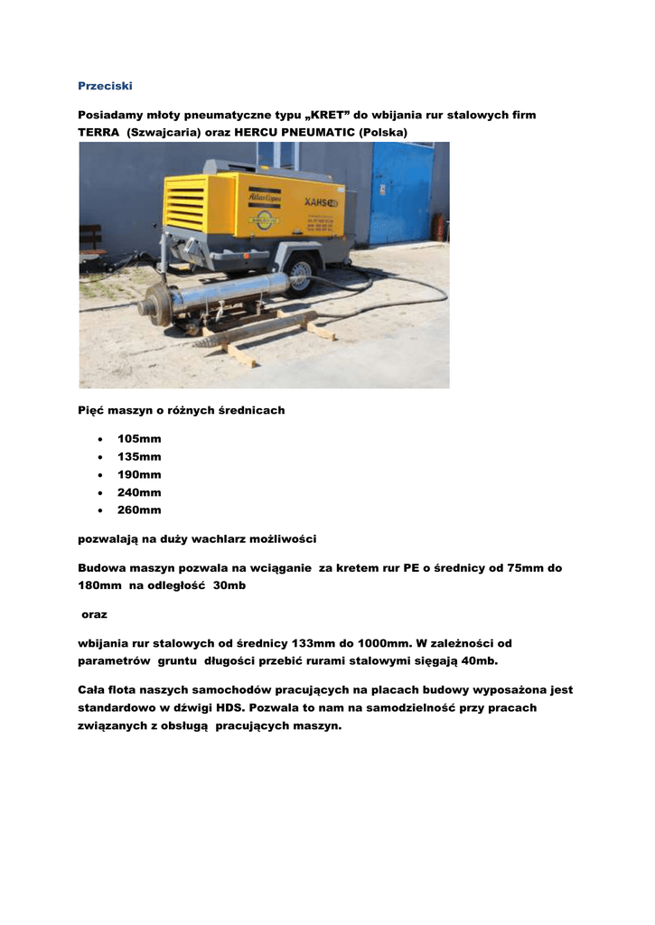 Przeciski Posiadamy młoty pneumatyczne typu „KRET” do wbijania rur stalowych firm TERRA (Szwajcaria) oraz HERCU PNEUMATIC (Polska) Pięć maszyn o różnych średnicach  105mm  135mm  190mm  240mm  260mm pozwalają na duży wachlarz możliwości Budowa maszyn pozwala na wciąganie za kretem rur PE o średnicy od 75mm do 180mm na odległość 30mb oraz wbijania rur stalowych od średnicy 133mm do 1000mm. W zależności od parametrów gruntu długości przebić rurami stalowymi sięgają 40mb. Cała flota naszych samochodów pracujących na placach budowy wyposażona jest standardowo w dźwigi HDS. Pozwala to nam na samodzielność przy pracach związanych z obsługą pracujących maszyn.
