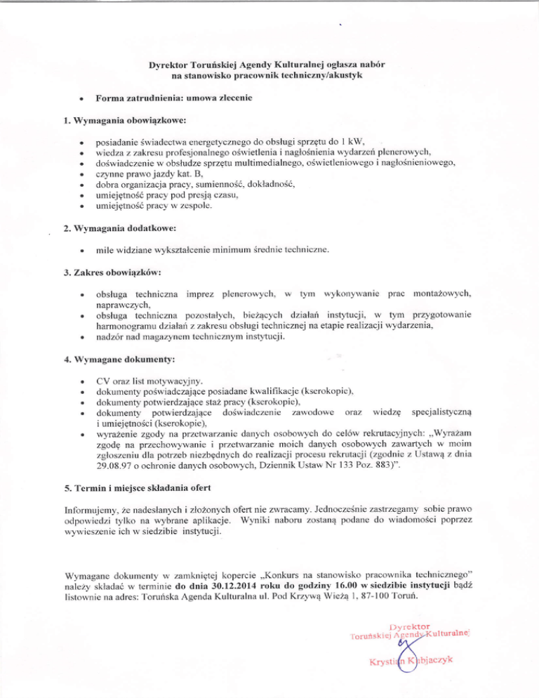 Dyrektor Toruriskiej Agendy Kulturalnej oglaszanab6r