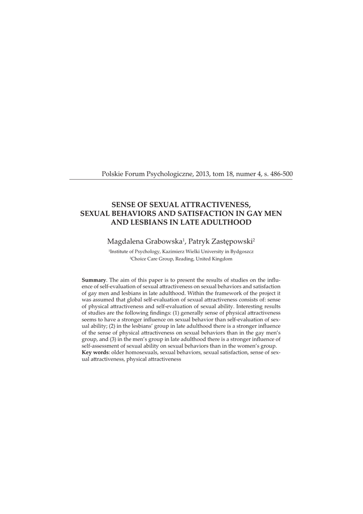 Polskie Forum Psychologiczne, 2013, tom 18, numer 4, s. 486-500 ȱȱȱǰ ȱ ȱȱȱȱȱȱ AND LESBIANS IN LATE ADULTHOOD Magdalena Grabowska1ǰȱ¢ȱ¿ 2 1 Institute of Psychology, Kazimierz Wielki University in Bydgoszcz 2 Choice Care Group, Reading, United Kingdom SummaryǯȱȱȱȱȱȱȱȱȱȱȱȱȱȱȱĚȱȱȬȱȱ¡ȱĴȱȱ¡ȱȱȱȱ of gay men and lesbians in late adulthood. Within the framework of the project it ȱȱȱȱȬȱȱ¡ȱĴȱȱDZȱȱ ȱ¢ȱĴȱȱȬȱȱ¡ȱ¢ǯȱȱȱ ȱȱȱȱ ȱęDZȱǻŗǼȱ¢ȱȱȱ¢ȱĴȱ ȱȱȱȱȱĚȱȱ¡ȱȱȱȬȱȱ¡ȱ¢DzȱǻŘǼȱȱȱȂȱȱȱȱȱȱȱȱȱĚȱ ȱȱȱȱ¢ȱĴȱȱ¡ȱȱȱȱȱ¢ȱȂȱ ǰȱȱǻřǼȱȱȱȂȱȱȱȱȱȱȱȱȱĚȱȱ self-assessment of sexual ability on sexual behaviors than in the women’s group. Key words: older homosexuals, sexual behaviors, sexual satisfaction, sense of sexȱĴǰȱ¢ȱĴ