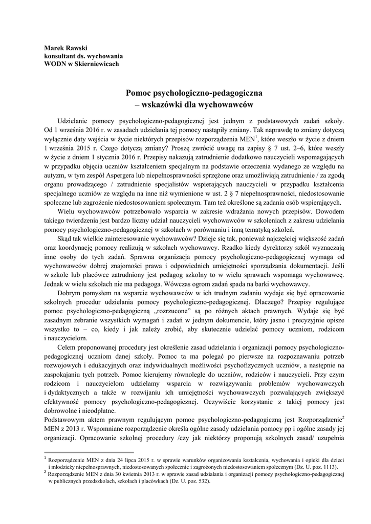 Marek Rawski konsultant ds. wychowania WODN w Skierniewicach Pomoc psychologiczno-pedagogiczna – wskazówki dla wychowawców Udzielanie pomocy psychologiczno-pedagogicznej jest jednym z podstawowych zadań szkoły. Od 1 września 2016 r. w zasadach udzielania tej pomocy nastąpiły zmiany. Tak naprawdę to zmiany dotyczą wyłącznie daty wejścia w życie niektórych przepisów rozporządzenia MEN1, które weszło w życie z dniem 1 września 2015 r. Czego dotyczą zmiany? Proszę zwrócić uwagę na zapisy § 7 ust. 2–6, które weszły w życie z dniem 1 stycznia 2016 r. Przepisy nakazują zatrudnienie dodatkowo nauczycieli wspomagających w przypadku objęcia uczniów kształceniem specjalnym na podstawie orzeczenia wydanego ze względu na autyzm, w tym zespół Aspergera lub niepełnosprawności sprzężone oraz umożliwiają zatrudnienie / za zgodą organu prowadzącego / zatrudnienie specjalistów wspierających nauczycieli w przypadku kształcenia specjalnego uczniów ze względu na inne niż wymienione w ust. 2 § 7 niepełnosprawności, niedostosowanie społeczne lub zagrożenie niedostosowaniem społecznym. Tam też określone są zadania osób wspierających. Wielu wychowawców potrzebowało wsparcia w zakresie wdrażania nowych przepisów. Dowodem takiego twierdzenia jest bardzo liczny udział nauczycieli wychowawców w szkoleniach z zakresu udzielania pomocy psychologiczno-pedagogicznej w szkołach w porównaniu i inną tematyką szkoleń. Skąd tak wielkie zainteresowanie wychowawców? Dzieje się tak, ponieważ najczęściej większość zadań oraz koordynację pomocy realizują w szkołach wychowawcy. Rzadko kiedy dyrektorzy szkół wyznaczają inne osoby do tych zadań. Sprawna organizacja pomocy psychologiczno-pedagogicznej wymaga od wychowawców dobrej znajomości prawa i odpowiednich umiejętności sporządzania dokumentacji. Jeśli w szkole lub placówce zatrudniony jest pedagog szkolny to w wielu sprawach wspomaga wychowawcę. Jednak w wielu szkołach nie ma pedagoga. Wówczas ogrom zadań spada na barki wychowawcy. Dobrym pomysłem na wsparcie wychowawców w ich trudnym zadaniu wydaje się być opracowanie szkolnych procedur udzielania pomocy psychologiczno-pedagogicznej. Dlaczego? Przepisy regulujące pomoc psychologiczno-pedagogiczną „rozrzucone” są po różnych aktach prawnych. Wydaje się być zasadnym zebranie wszystkich wymagań i zadań w jednym dokumencie, który jasno i precyzyjnie opisze wszystko to – co, kiedy i jak należy zrobić, aby skutecznie udzielać pomocy uczniom, rodzicom i nauczycielom. Celem proponowanej procedury jest określenie zasad udzielania i organizacji pomocy psychologicznopedagogicznej uczniom danej szkoły. Pomoc ta ma polegać po pierwsze na rozpoznawaniu potrzeb rozwojowych i edukacyjnych oraz indywidualnych możliwości psychofizycznych uczniów, a następnie na zaspokajaniu tych potrzeb. Pomoc kierujemy równolegle do uczniów, rodziców i nauczycieli. Przy czym rodzicom i nauczycielom udzielamy wsparcia w rozwiązywaniu problemów wychowawczych i dydaktycznych a także w rozwijaniu ich umiejętności wychowawczych pozwalających zwiększyć efektywność pomocy psychologiczno-pedagogicznej. Oczywiście korzystanie z takiej pomocy jest dobrowolne i nieodpłatne. Podstawowym aktem prawnym regulującym pomoc psychologiczno-pedagogiczną jest Rozporządzenie2 MEN z 2013 r. Wspomniane rozporządzenie określa ogólne zasady udzielania pomocy pp i ogólne zasady jej organizacji. Opracowanie szkolnej procedury /czy jak niektórzy proponują szkolnych zasad/ uzupełnia 1 2 Rozporządzenie MEN z dnia 24 lipca 2015 r. w sprawie warunków organizowania kształcenia, wychowania i opieki dla dzieci i młodzieży niepełnosprawnych, niedostosowanych społecznie i zagrożonych niedostosowaniem społecznym (Dz. U. poz. 1113). Rozporządzenie MEN z dnia 30 kwietnia 2013 r. w sprawie zasad udzialania i organizacji pomocy psychologiczno-pedagogicznej w publicznych przedszkolach, szkołach i placówkach (Dz. U. poz. 532). i precyzuje szczegóły dotyczące kolejnych działań podejmowanych dla wsparcia adresatów pomocy. W szkołach, w których nie opracowano i nie wprowadzono takich procedur panuje pewna dowolność. Mam na myśli sposób dokumentowania udzielanej uczniom i rodzicom pomocy. Rozporządzenie nie zawiera bowiem załączników, które zapewniłyby jednolitość opracowywanych dokumentów. Podaje natomiast zbiór informacji, które dany dokument ma zawierać. W procedurze dokładnie ustala się, kto, kiedy i w jaki sposób planuje, koordynuje i dokumentuje pomoc psychologiczno-pedagogiczną udzielaną na terenie szkoły czy placówki, kto, kiedy i na jakich zasadach przechowuje i udostępnia dokumentację zainteresowanym stronom. Ustala się warunki organizacji dodatkowych zajęć, ich formy i wymiar czasowy. Wymienia się zadania dyrektora, wychowawcy, nauczycieli i specjalistów. Ustala się prawa i obowiązki rodziców w procesie udzielania pomocy. Uczniom posiadającym opinię poradni psychologiczno-pedagogicznej o potrzebie dostosowania wymagań edukacyjnych wynikających z programu nauczania do indywidualnych potrzeb i możliwości psychofizycznych opracowuje się Plan Działań Wspierających /PDW/. Uczniowi posiadającemu orzeczenie o potrzebie kształcenia specjalnego opracowuje się indywidualny program edukacyjno-terapeutyczny /IPET/ zgodnie z rozporządzeniem MEN3. Jeśli nie mamy w szkole odpowiedniej procedury. To zadajmy sobie pytanie: Czy każdy wychowawca ma oddzielnie tworzyć dokumentację według własnego pomysłu? Sposobem na ujednolicenie postępowania i dokumentowania pracy szkoły w tym obszarze jest opracowanie szkolnej procedury, która zawiera między innymi w formie załączników wzory sporządzanych dokumentów. Mam tu na myśli wzory np.: powiadomienie rodziców o potrzebie objęcia ucznia pomocą psychologiczno-pedagogiczną, zgodę rodziców /oświadczenie skierowane do dyrektora szkoły