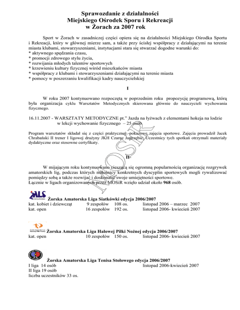 Sprawozdanie z działalności Miejskiego Ośrodek Sporu i Rekreacji w śorach za 2007 rok Sport w śorach w zasadniczej części opiera się na działalności Miejskiego Ośrodka Sportu i Rekreacji, który w głównej mierze sam, a takŜe przy ścisłej współpracy z działającymi na terenie miasta klubami, stowarzyszeniami, instytucjami stara się stwarzać dogodne warunki do: * aktywnego spędzania czasu, * promocji zdrowego stylu Ŝycia, * rozwijania młodych talentów sportowych * krzewieniu kultury fizycznej wśród mieszkańców miasta * współpracy z klubami i stowarzyszeniami działającymi na terenie miasta * pomocy w poszerzaniu kwalifikacji kadry nauczycielskiej I W roku 2007 kontynuowano rozpoczętą w poprzednim roku propozycję programową, którą była organizacja cyklu Warsztatów Metodycznych skierowana głównie do nauczycieli wychowania fizycznego. 16.11.2007 - WARSZTATY METODYCZNE pt.” Jazda na łyŜwach z elementami hokeja na lodzie w lekcji wychowanie fizycznego – 25 osób Program warsztatów składał się z części praktycznej -pokazowe zajęcia sportowe. Zajęcia prowadził Jacek Chrabański II trener I ligowej druŜyny JKH Czarne Jastrzębie. Uczestnicy tych spotkań otrzymali materiały dydaktyczne oraz stosowne certyfikaty. II W mijającym roku kontynuowano cieszącą się ogromną popularnością organizację rozgrywek amatorskich lig, podczas których miłośnicy konkretnych dyscyplin sportowych mogli rywalizować pomiędzy sobą a takŜe rozwijać i doskonalić swoje umiejętności sportowe. Łącznie w ligach organizowanych przez MOSiR wzięło udział około 968 osób. śorska Amatorska Liga Siatkówki edycja 2006/2007 kat. kobiet i dziewcząt 9 zespołów 108 os. listopad 2006 – marzec 2007 kat. open 16 zespołów 192 os. listopad 2006- kwiecień 2007 kat. open śorska Amatorska Liga Halowej Piłki NoŜnej edycja 2006/2007 10 zespołów 150 os. listopad 2006- kwiecień 2007 śorska Amatorska Liga Tenisa Stołowego edycja 2006/2007 I liga 14 osób listopad 2006-kwiecień 2007 II liga 19 osób liczba uczestników 33 os. Przystąpiono równieŜ do organizacji kolejnych edycji: Inauguracja śALS 2007/2008 kat. kobiet i dziewcząt 8 zespołów 96 os. kat. open 12 zespołów 144 os. grudzień 2007 - luty 2008 listopad 2007- kwiecień 2008 Inauguracja śALTS 2007/2008 I liga 12 os. II liga 23 os. rozgrywki rozpoczęły się od listopada 2007 potrwają do maja 2008 Inauguracja śALPN 2007/2008 kat. open 14 druŜyn 210 zawodników rozgrywki rozpoczęły się od października 2007 potrwają do kwietnia 2008 III Pragnąc upowszechnić róŜne formy aktywności ruchowej wśród Ŝorskich załóg pracowniczych (MOSiR) tak jak w poprzednich latach zorganizowano (od kilku lat organizuje) GRAND PRIX śOR –rywalizację sportową o tytuł najbardziej usportowionego zakładu pracy. W III edycji w roku 2007 udział w zawodach sportowych (od kwietnia do czerwca) obejmujących róŜne dyscypliny (piłka noŜna, siatkówka, koszykówka, dwa ognie, piłka noŜna plaŜowa, wielobój sprawnościowy, zawody strzeleckie, tenis stołowy, tenis ziemny) udział wzięły: Zakłady Techniki Komunalnej, Castorama, Urząd Miasta, Zarząd Budynków Miejskich, Geo-Bud, MM Petro, Komenda Miejska Policji, MOSiR. Mistrzem III edycji Grand Prix zostały Zakłady Techniki Komunalnej. IV W minionym roku zorganizowano i przeprowadzono wiele imprez sportowych. Niektóre z nich juŜ na stałe wpisały się do kalendarza sportowego naszego miasta inne z kolei były nową propozycją promowania wizerunku Miejskiego Ośrodka Sportu i Rekreacji. Ściśle współpracując ze Szkolnym Związkiem Sportowym zorganizowano kilka zawodów miejskich wynikających z realizacji kalendarza rozgrywek SZS. Wychodząc naprzeciw oczekiwaniu mieszkańców i w oparciu o współpracę z licznymi klubami, organizacjami, stowarzyszeniami zorganizowano szereg imprez sportowych dla Ŝorskiego społeczeństwa. luty Zawody Pływackie Miting o Puchar Dyrektora MOSiR śory liczba uczestników: 200 osób Halowy Turniej Piłki NoŜnej trampkarzy rocznik 1996 mł. liczba uczestników: 77 współorganizatorzy: KS Osiny, MOSiR Turniej Piłki NoŜnej Trampkarzy o Puchar Prezydenta Miasta śory liczba uczestników: 55 współorganizatorzy: KS śory, MOSiR marzec Futsalowe Mistrzostwa Górników liczba uczestników: 8 druŜyn – 80 osób Topienie Marzanny na Gichcie – impreza rowerowa liczba uczestników: 20 organizatorzy: MOSiR, Klub Turystyki Kolarskiej PTTK „Wandrus” Półfinał Mistrzostw Polski Juniorek w Piłce Ręcznej organizatorzy: MTS śory, MOSiR kwiecień Wielki Turniej Gier i Zabaw szkół podstawowych liczba uczestników: 6 szkół – 60 osób Festiwal Fitness i Kulturystyki organizator: TKKF Tytan , współorganizator: MOSiR maj Klubowy Turniej Piłki NoŜnej śory-CUP 2007 rocznik 1993 i mł. liczba druŜyn: 6 -uczestników 70 osób organizator: KS śory, MOSiR Dni Otwarte Hali Sportowej (turnieje sportowe) oraz Pływalni Krytej (bezpłatny wstęp dla rodzin) liczba osób: około 200 Otwarte Zawody Strzeleckie – sportowa majówka liczba uczestników: 169 współorganizator: Kurkowe Bractwo Strzeleckie Otwarty Bieg Wiosenny z cyklu „Polska Biega” Zupełnie nową propozycją zachęcenia do aktywnego wypoczynku było przystąpienie MOSiR-u do akcji pod patronatem Radia RMF, Gazety Wyborczej i TVP Sport „Bieg Wiosenny” – Polska Biega. Do biegu mogły przystąpić dzieci, młodzieŜ, dorośli, amatorzy, zawodowcy w wieku od 0 do 100 lat. śorskie bieganie rozpoczęła rozgrzewka poprowadzona przez Ŝorzan: Monikę GluzaHalową Mistrzynię Polski Juniorów z 2004 roku na dystansie 600m i Marcina RóŜyckiego – Halowego Mistrza Śląska na dystansie 2km. Mimo zmiennej aury w biegu uczestniczyło 71 osób. Na mecie kaŜdy uczestnik otrzymał dyplom i upominek. Turniej Streetballa „Powitanie Lata z Koszykówka” liczba uczestników: 63 osoby współorganizator: SZS czerwiec Dzień Dziecka na 