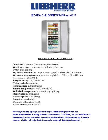 SZAFA CHŁODNICZA FKvsl 4112 PARAMETRY TECHNICZNE Obudowa – srebrna ( malowana proszkowo) Wnętrze – tworzywo sztuczne w kolorze białym Drzwi przeszklone Wymiary zewnętrzne ( wys.x szer.x głęb.) – 1800 x 600 x 610 mm Wymiary wewnętrzne ( wys.x szer.x głęb.) – 1612 x 470 x 440 mm Pojemność – 365/346 L ZuŜycie energii- 2,0 kWh/24h Chłodzenie dynamiczne RozmraŜanie automatyczne Zakres temperatur - +0°C do +15°C Wskaźnik temperatury zewnętrzny cyfrowy Sterowanie mechaniczne Nośność półek – do 50 kg Zamek w standardzie Czynnik chłodniczy R600 Klasa klimatyczna SN-ST Profesjonalny sprzęt chłodniczy LIEBHERR pozwala na zaoszczędzenie kwoty nawet 300-900 zł. rocznie, w porównaniu z dostępnymi na polskim rynku urządzeniami chłodniczymi innych marek , których wielkość zuŜycia energii jest podawana.