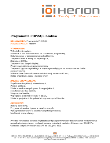 Programista PHP/SQL Krakow STANOWISKO: Programista PHP/SQL MIEJSCE PRACY: Kraków WYMAGANIA: Wykształcenie wyższe, Minimum 2 lata doświadczenia na stanowisku programisty, Doświadczenie w programowaniu obiektowym, Znajomość PHP w wersji co najmniej 5.x, Znajomość HTML, Znajomość baz danych MySQL, Praktyczna umiejętność programowania, Znajomość języka angielskiego w stopniu pozwalającym na korzystanie ze źródeł obcojęzycznych, Mile widziane doświadczenie w administracji serwerami Linux, Dobra organizacja czasu i miejsca pracy. ZAKRES OBOWIĄZKÓW: Projektowanie aplikacji internetowych, Pisanie aplikacji, Udział w realizowanych przez firmę projektach, Monitorowanie baz danych, Diagnostyka błędów, Współpraca z innymi osobami w dziale, Udział w projektach dla polskich i zagranicznych klientów. OFERUJEMY: Rozwój zawodowy, Przyjazną atmosferę i pracę w młodym zespole, Wynagrodzenie oparte o podstawę i system premiowy, Możliwość pracy zdalnej. Prosimy o dopisanie klauzuli: Wyrażam zgodę na przetwarzanie moich danych osobowych dla potrzeb niezbędnych przy realizacji procesu rekrutacji zgodnie z Ustawą z dn. 29.08.97 o Ochronie Danych Osobowych (DZ.U. nr 133, poz. 883). HERION – TWÓJ IT PARTNER ul. J. Bojki 9/29 30-611 Kraków, NIP PL 697 106 88 70, Regon 356269924, Telefony: +48 12 654 31 13, +48 504 09 44 20, e-mail: [email protected], http:\\www.herion.com.pl Bank: PKOBP SA Oddział - CBE „Interligo” 50102055581111118528700077 Dziękujemy za wszystkie nadesłane aplikacje, jednocześnie informujemy, że skontaktujemy się wyłącznie z wybranymi kandydatami. HERION – TWÓJ IT PARTNER ul. J. Bojki 9/29 30-611 Kraków, NIP PL 697 106 88 70, Regon 356269924, Telefony: +48 12 654 31 13, +48 504 09 44 20, e-mail: [email protected], http:\\www.herion.com.pl Bank: PKOBP SA Oddział - CBE „Interligo” 50102055581111118528700077