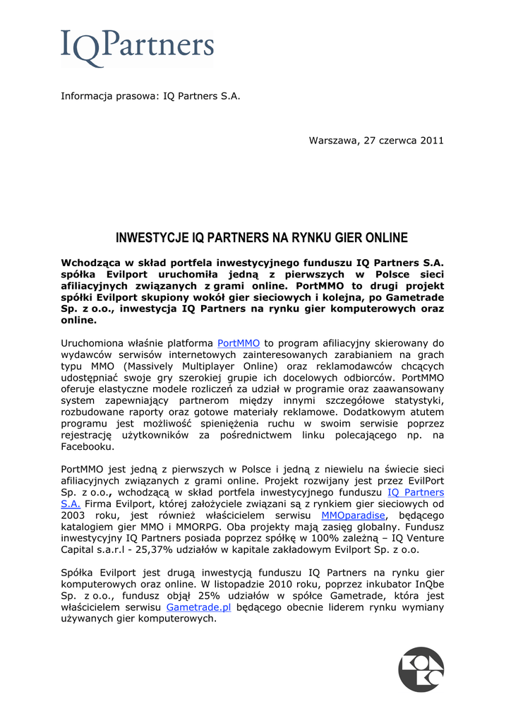 Informacja prasowa: IQ Partners S.A. Warszawa, 27 czerwca 2011 INWESTYCJE IQ PARTNERS NA RYNKU GIER ONLINE Wchodząca w skład portfela inwestycyjnego funduszu IQ Partners S.A. spółka Evilport uruchomiła jedną z pierwszych w Polsce sieci afiliacyjnych związanych z grami online. PortMMO to drugi projekt spółki Evilport skupiony wokół gier sieciowych i kolejna, po Gametrade Sp. z o.o., inwestycja IQ Partners na rynku gier komputerowych oraz online. Uruchomiona właśnie platforma PortMMO to program afiliacyjny skierowany do wydawców serwisów internetowych zainteresowanych zarabianiem na grach typu MMO (Massively Multiplayer Online) oraz reklamodawców chcących udostępniać swoje gry szerokiej grupie ich docelowych odbiorców. PortMMO oferuje elastyczne modele rozliczeń za udział w programie oraz zaawansowany system zapewniający partnerom między innymi szczegółowe statystyki, rozbudowane raporty oraz gotowe materiały reklamowe. Dodatkowym atutem programu jest możliwość spieniężenia ruchu w swoim serwisie poprzez rejestrację użytkowników za pośrednictwem linku polecającego np. na Facebooku. PortMMO jest jedną z pierwszych w Polsce i jedną z niewielu na świecie sieci afiliacyjnych związanych z grami online. Projekt rozwijany jest przez EvilPort Sp. z o.o., wchodzącą w skład portfela inwestycyjnego funduszu IQ Partners S.A. Firma Evilport, której założyciele związani są z rynkiem gier sieciowych od 2003 roku, jest również właścicielem serwisu MMOparadise, będącego katalogiem gier MMO i MMORPG. Oba projekty mają zasięg globalny. Fundusz inwestycyjny IQ Partners posiada poprzez spółkę w 100% zależną – IQ Venture Capital s.a.r.l - 25,37% udziałów w kapitale zakładowym Evilport Sp. z o.o. Spółka Evilport jest drugą inwestycją funduszu IQ Partners na rynku gier komputerowych oraz online. W listopadzie 2010 roku, poprzez inkubator InQbe Sp. z o.o., fundusz objął 25% udziałów w spółce Gametrade, która jest właścicielem serwisu Gametrade.pl będącego obecnie liderem rynku wymiany używanych gier komputerowych. „Zarówno Gametrade.pl, jak i projekty rozwijane przez spółkę Evilport są połączeniem pasji, dobrego rozeznania rynku oraz wysokich umiejętności biznesowych ich twórców. Rynek gier komputerowych oraz online rozwija się w bardzo intensywnym tempie i ze względu na obiecujące perspektywy biznesowe, liczymy na szybki sukces obu spółek.“ – komentuje Maciej Hazubski, Prezes IQ Partners S.A. Więcej informacji udziela: Joanna Kółkowska Kolko Communications www.kolko.com.pl mail: [email protected] tel.: +48 668 370 071 Informacje dodatkowe: IQ Partners S.A. jest wiodącym polskim funduszem specjalizującym się w inwestycjach w przedsięwzięcia we wczesnej fazie rozwoju (seed, start-up). Internet, mobile, e-commerce oraz IT to obszary, w ramach których fundusz stale poszukuje nowych inwestycji. Do tej pory IQ Partners zrealizował ponad 40 projektów inwestycyjnych oraz przeprowadził częściowe transakcje wyjścia z czterech inwestycji. IQ Partners posiada 100% udziałów w trzech wehikułach inwestycyjnych: Ventures Hub Sp. z o.o., InQbe Sp. z.o.o oraz IQ Venture Capital s.a.r.l. z siedzibą w Luksemburgu.