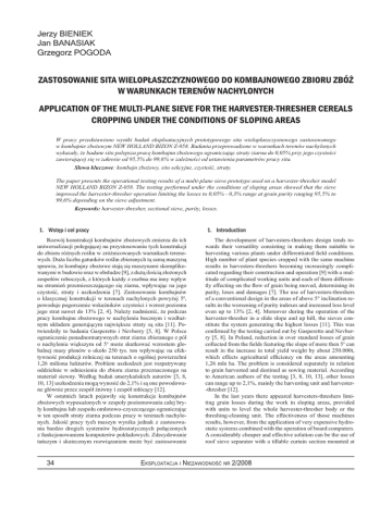 Jerzy BIENIEK Jan BANASIAK Grzegorz POGODA ZASTOSOWANIE SITA WIELOPŁASZCZYZNOWEGO DO KOMBAJNOWEGO ZBIORU ZBÓŻ W WARUNKACH TERENÓW NACHYLONYCH APPLICATION OF THE MULTI-PLANE SIEVE FOR THE HARVESTER-THRESHER CEREALS CROPPING UNDER THE CONDITIONS OF SLOPING AREAS W pracy przedstawiono wyniki badań eksploatacyjnych prototypowego sita wielopłaszczyznowego zastosowanego w kombajnie zbożowym NEW HOLLAND BIZON Z-058. Badania przeprowadzone w warunkach terenów nachylonych wykazały, że badane sito polepsza pracę kombajnu zbożowego ograniczając straty ziarna do 0,05% przy jego czystości zawierającej się w zakresie od 95,5% do 99,6% w zależności od ustawienia parametrów pracy sita. Słowa kluczowe: kombajn zbożowy, sito sekcyjne, czystość, straty. The paper presents the operational testing results of a multi-plane sieve prototype used on a harvester-thresher model NEW HOLLAND BIZON Z-058. The testing performed under the conditions of sloping areas showed that the sieve improved the harvester-thresher operation limiting the losses to 0,05% - 0,3% range at grain purity ranging 95,5% to 99,6% depending on the sieve adjustment. Keywords: harvester-thresher, sectional sieve, purity, losses. 1. Wstęp i cel pracy 1. Introduction Rozwój konstrukcji kombajnów zbożowych zmierza do ich uniwersalizacji polegającej na przystosowaniu tych konstrukcji do zbioru różnych roślin w zróżnicowanych warunkach terenowych. Duża liczba gatunków roślin zbieranych tą samą maszyną sprawia, że kombajny zbożowe stają się maszynami skomplikowanymi w budowie oraz w obsłudze [9], z dużą ilością złożonych zespołów roboczych, z których każdy z osobna ma inny wpływ na strumień przemieszczającego się ziarna, wpływając na jego czystość, straty i uszkodzenia [7]. Zastosowanie kombajnów o klasycznej konstrukcji w terenach nachylonych powyżej 50, powoduje pogorszenie wskaźników czystości i wzrost poziomu jego strat nawet do 13% [2, 4]. Należy nadmienić, że podczas pracy kombajnu zbożowego w nachyleniu bocznym i wzdłużnym układem generującym największe straty są sita [11]. Potwierdziły to badania Gasperetto i Nevberry [5, 8]. W Polsce ograniczenie ponadnormatywnych strat ziarna zbieranego z pól o nachyleniu większym od 5o może skutkować wzrostem globalnej masy plonów o około 250 tys. ton wpływając na efektywność produkcji rolniczej na terenach o ogólnej powierzchni 1,26 miliona hektarów. Problem uszkodzeń jest rozpatrywany oddzielnie w odniesieniu do zbioru ziarna przeznaczonego na materiał siewny. Według badań amerykańskich autorów [3, 8, 10, 13] uszkodzenia mogą wynosić do 2,1% i są one powodowane głównie przez zespół żniwny i zespół młócący [12]. W ostatnich latach pojawiły się konstrukcje kombajnów zbożowych wyposażonych w zespoły poziomowania całej bryły kombajnu lub zespołu omłotowo-czyszczącego ograniczając w ten sposób straty ziarna podczas pracy w terenach nachylonych. Jakość pracy tych maszyn wynika jednak z zastosowania bardzo drogich systemów hydrostatycznych połączonych z funkcjonowaniem komputerów pokładowych. Zdecydowanie tańszym i skutecznym rozwiązaniem może być zastosowanie 34 The development of harvesters-threshers design tends towards their versatility consisting in making them suitable to harvesting various plants under differentiated field conditions. High number of plant species cropped with the same machine results in harvesters-threshers becoming increasingly complicated regarding their construction and operation [9] with a multitude of complicated working units and each of them differently effecting on the flow of grain being moved, determining its parity, loses and damages [7]. The use of harvesters-threshers of a conventional design in the areas of above 5° inclination results in the worsening of purity indexes and increased loss level even up to 13% [2, 4]. Moreover during the operation of the harvester-thresher in a slide slope and up hill, the sieves constitute the system generating the highest losses [11]. This was confirmed by the testing carried out by Gasperetto and Nevberry [5, 8]. In Poland, reduction in over standard losses of grain collected from the fields featuring the slope of more then 5o can result in the increase in total yield weight by about 250.000t, which effects agricultural efficiency on the areas amounting 1,26 mln ha. The problem is considered separately in relation to grain harvested and destined as sowing material. According to American authors of the testing [3, 8, 10, 13], other losses can range up to 2,1%, mainly the harvesting unit and harvester-thresher [12]. In the last years there appeared harvesters-threshers limiting grain losses during the work in sloping areas, provided with units to level the whole harvester-thresher body or the threshing-cleaning unit. The effectiveness of those machines results, however, from the application of very expensive hydrostatic systems combined with the operation of board computers. A considerably cheaper and effective solution can be the use of roof sieve separator with a tillable curtain section mounted at EKSPLOATACJA I NIEZAWODNOŚĆ NR 2/2008 NAUKA I TECHNIKA daszkowego separatora sitowego z żaluzjową sekcją uchylną zamontowaną w miejsce sita kłosowego, którego schemat przedstawiono na rysunku 1 [1]. Do powyższego stwierdzenia upoważniają uzyskane wyniki badań stanowiskowych przeprowadzonych w Instytucie Inżynierii Rolniczej Uniwersytetu Przyrodniczego we Wrocławiu [2]. Z uwagi na to, że biologiczne cechy zbieranych roślin charakterystyczne dla danego gatunku podlegają znacznej zmienności [6], autorzy artykułu przeprowadzili polowe badania weryfikacyjne na dwóch rodzajach upraw. Celem pracy było wyznaczenie wskaźników jakościowych pracy (czystości i strat ziarna) uzyskanych w czasie badań eksploatacyjnych sita wielopłaszczyznowego przy zbiorze pszenicy i mieszanki zbożowej. 2. Metodyk