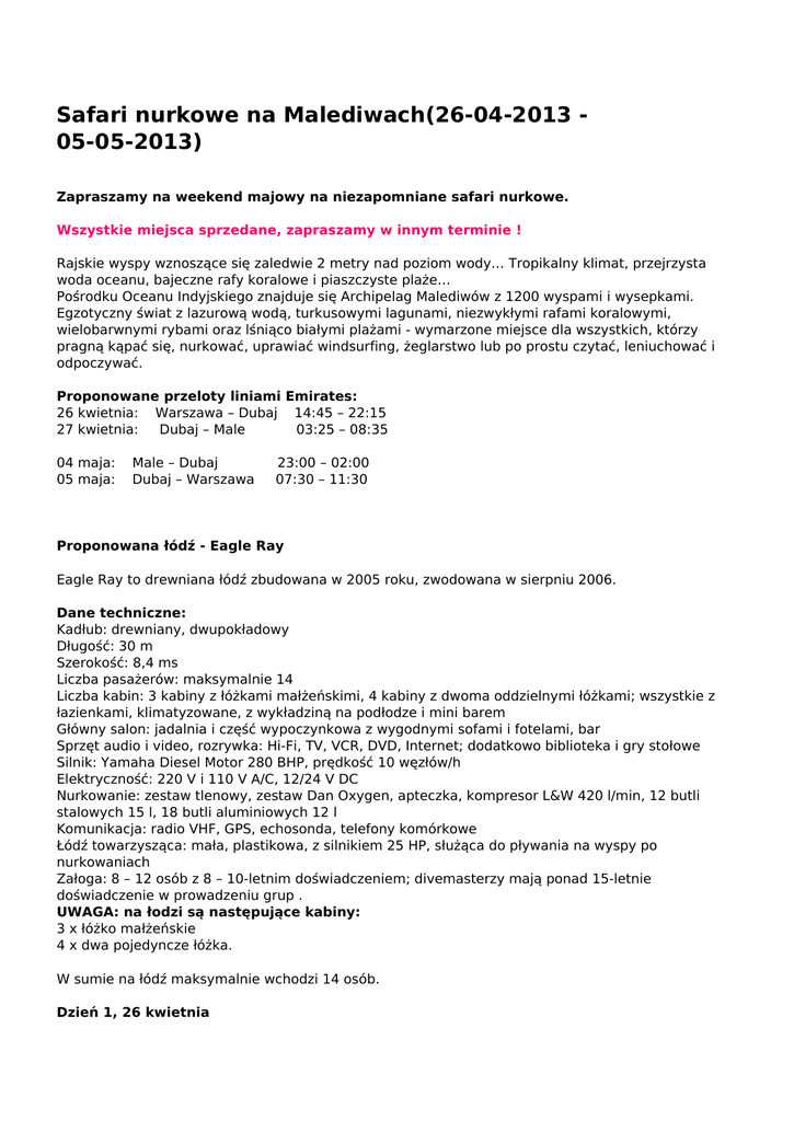 Safari nurkowe na Malediwach(26-04-2013 05-05-2013) Zapraszamy na weekend majowy na niezapomniane safari nurkowe. Wszystkie miejsca sprzedane, zapraszamy w innym terminie ! Rajskie wyspy wznoszące się zaledwie 2 metry nad poziom wody… Tropikalny klimat, przejrzysta woda oceanu, bajeczne rafy koralowe i piaszczyste plaże… Pośrodku Oceanu Indyjskiego znajduje się Archipelag Malediwów z 1200 wyspami i wysepkami. Egzotyczny świat z lazurową wodą, turkusowymi lagunami, niezwykłymi rafami koralowymi, wielobarwnymi rybami oraz lśniąco białymi plażami - wymarzone miejsce dla wszystkich, którzy pragną kąpać się, nurkować, uprawiać windsurfing, żeglarstwo lub po prostu czytać, leniuchować i odpoczywać. Proponowane przeloty liniami Emirates: 26 kwietnia: Warszawa – Dubaj 14:45 – 22:15 27 kwietnia: Dubaj – Male 03:25 – 08:35 04 maja: 05 maja: Male – Dubaj Dubaj – Warszawa 23:00 – 02:00 07:30 – 11:30 Proponowana łódź - Eagle Ray Eagle Ray to drewniana łódź zbudowana w 2005 roku, zwodowana w sierpniu 2006. Dane techniczne: Kadłub: drewniany, dwupokładowy Długość: 30 m Szerokość: 8,4 ms Liczba pasażerów: maksymalnie 14 Liczba kabin: 3 kabiny z łóżkami małżeńskimi, 4 kabiny z dwoma oddzielnymi łóżkami; wszystkie z łazienkami, klimatyzowane, z wykładziną na podłodze i mini barem Główny salon: jadalnia i część wypoczynkowa z wygodnymi sofami i fotelami, bar Sprzęt audio i video, rozrywka: Hi-Fi, TV, VCR, DVD, Internet; dodatkowo biblioteka i gry stołowe Silnik: Yamaha Diesel Motor 280 BHP, prędkość 10 węzłów/h Elektryczność: 220 V i 110 V A/C, 12/24 V DC Nurkowanie: zestaw tlenowy, zestaw Dan Oxygen, apteczka, kompresor L&W 420 l/min, 12 butli stalowych 15 l, 18 butli aluminiowych 12 l Komunikacja: radio VHF, GPS, echosonda, telefony komórkowe Łódź towarzysząca: mała, plastikowa, z silnikiem 25 HP, służąca do pływania na wyspy po nurkowaniach Załoga: 8 – 12 osób z 8 – 10-letnim doświadczeniem; divemasterzy mają ponad 15-letnie doświadczenie w prowadzeniu grup . UWAGA: na łodzi są następujące kabiny: 3 x łóżko małżeńskie 4 x dwa pojedyncze łóżka. W sumie na łódź maksymalnie wchodzi 14 osób. Dzień 1, 26 kwietnia 12:45 - spotkanie na lotnisku Okęcie w Warszawie. Odprawa biletowo – bagażowa i przelot do Dubaju. Po przylocie na miejsce przesiadka do samolotu do Male. Dzień 2, 27 kwietnia O 08:35 planowy przylot do Male. Po odebraniu bagaży spotkanie z miejscowym kontrahentem i transfer do portu. Zaokrętowanie na łodzi Eagle Ray i wypłynięcie. Tego dnia nurkowanie sprawdzające przy Maa Giri (Północny Atol Male). Nocleg na łodzi przy wiosce Guradhoo. Dzień 3, 28 kwietnia Posiłki na łodzi. Przepłynięcie przez Kanał Guradhoo przy Południowym Atolu Male do Południowego Atolu Ari. Nurkowanie przy Kuda Rah Tila (Atol Ari), nocne nurkowanie przy Gethi Wall (Atol Ari). Nocleg przy wiosce Dangethi. Dzień 4, 29 kwietnia Posiłki na łodzi. Nurkowania przy Don Tila (Południowy Atol Ari),Didhu Goni (Południowy Atol Ari), Migili Corner (Południowy Atol Ari). Poszukiwania rekinów wielorybich i nocleg przy Hotelu Holiday. Dzień 5, 30 kwietnia Posiłki na łodzi. Nurkowania przy Holiday Goni (Południowy Atol Ari), Rangali Manta Point (Zachodni Atol Ari), Digga Tila (Zachodni Atol Ari). Nocleg przy niezamieszkałej wyspie Kuda Digga. Dzień 6, 01 maja Posiłki na łodzi. Nurkowania przy Kala Handi (Zachodni Atol Ari), Hemandhoo Tila (Zachodni Atol Ari), Malos Tila (Zachodni Atol Ari). Nocleg przy Ranfaru – rafowej obręczy. Dzień 7, 02 maja Posiłki na łodzi. Nurkowania przy Ranfaru Channel (Zachodni Atol Ari), wraku Fesdhu (Środkowy Atol Ari), Fish Head (Środkowy Atol Ari). Nocleg przy Faana Mudu. Dzień 8, 03 maja Posiłki na łodzi. Nurkowania przy Fish Head (Środkowy Atol Ari), Maya Tila (Północny Atol Ari). Po południu łódź przypływa do Male. Czas na wypłukanie i wysuszenie sprzętu. Nocleg na łodzi. Dzień 9, 04 maja 10:00 - po śniadaniu opuszczenie kabin i transfer na ląd. W związku z tym, że odlot do Europy jest wieczorem, będzie możliwość przechowania bagaży i wyjścia do miasta przed odlotem. Wieczorem transfer na lotnisko i pożegnanie z miejscowym kontrahentem. O 23:00 planowy wylot z Male do Dubaju i dalej do Warszawy. Dzień 10, 05 maja 11:30 - po przylocie do Warszawy pożegnanie i koniec imprezy. Cena: 1390,00 USD/osoba + przelot od 3050,00 PLN/osoba W cenie: przelot na trasie Warszawa – Male – Warszawa transfer lotnisko – łódź – lotnisko zakwaterowanie w dwuosobowych klimatyzowanych kabinach z łazienkami trzy posiłki dziennie + przekąski kawa, herbata 24 h kolacja BBQ na wyspie 1 wycieczka na ląd 3 nurkowania dziennie + 1 nurkowanie nocne (w sumie 17 nurkowań) butle 12 l + balast opieka anglojęzycznego divemastera opieka polskiego instruktora (leci razem z grupą) ubezpieczenie turystyczne. Dodatkowe opłaty: pozostałe napoje SCUBA TRAVEL – PROFESSIONAL INCENTIVE UL. STOCZNIOWCÓW 9, 03-982 WARSZAWA EMAIL: [email protected], http://www.scubatravel.com.pl [email protected], http://www.proincentive.pl TEL.: (+4822) 646 98 43, FAX: (+4822) 646 98 41 Powered by TCPDF (www.tcpdf.org)