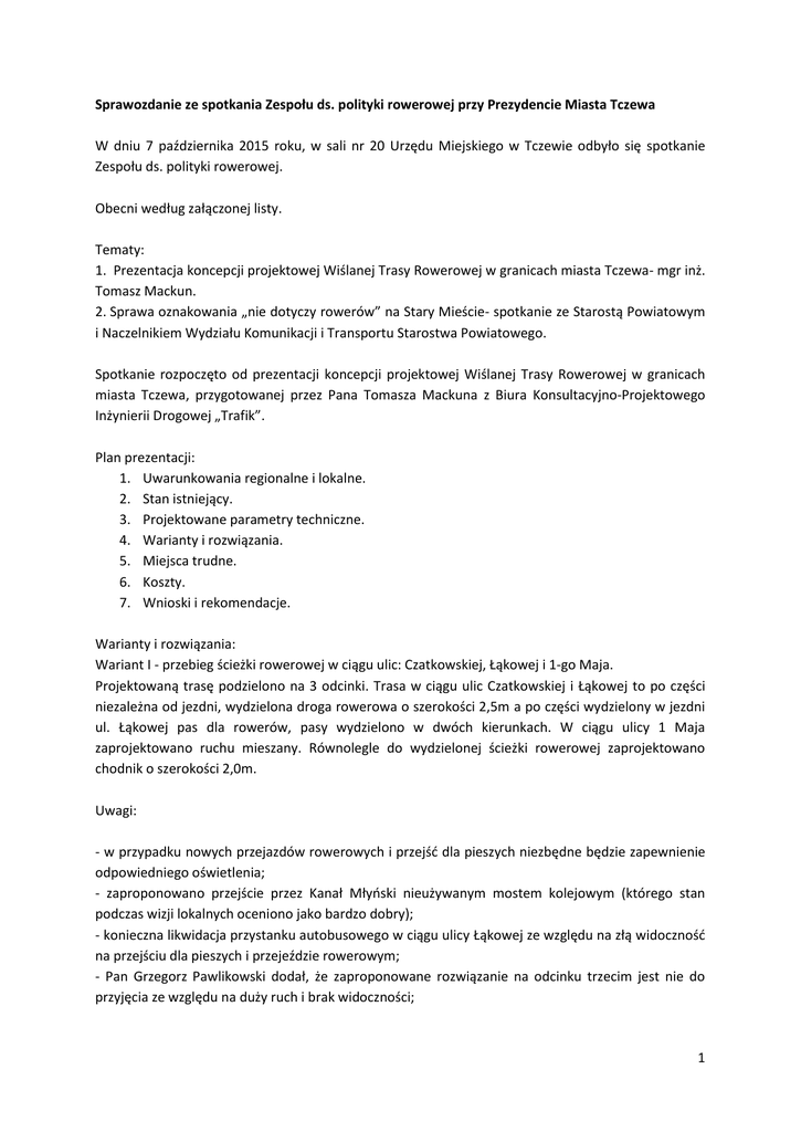 Sprawozdanie ze spotkania Zespołu ds. polityki rowerowej przy Prezydencie Miasta Tczewa W dniu 7 października 2015 roku, w sali nr 20 Urzędu Miejskiego w Tczewie odbyło się spotkanie Zespołu ds. polityki rowerowej. Obecni według załączonej listy. Tematy: 1. Prezentacja koncepcji projektowej Wiślanej Trasy Rowerowej w granicach miasta Tczewa- mgr inż. Tomasz Mackun. 2. Sprawa oznakowania „nie dotyczy rowerów” na Stary Mieście- spotkanie ze Starostą Powiatowym i Naczelnikiem Wydziału Komunikacji i Transportu Starostwa Powiatowego. Spotkanie rozpoczęto od prezentacji koncepcji projektowej Wiślanej Trasy Rowerowej w granicach miasta Tczewa, przygotowanej przez Pana Tomasza Mackuna z Biura Konsultacyjno-Projektowego Inżynierii Drogowej „Trafik”. Plan prezentacji: 1. Uwarunkowania regionalne i lokalne. 2. Stan istniejący. 3. Projektowane parametry techniczne. 4. Warianty i rozwiązania. 5. Miejsca trudne. 6. Koszty. 7. Wnioski i rekomendacje. Warianty i rozwiązania: Wariant I - przebieg ścieżki rowerowej w ciągu ulic: Czatkowskiej, Łąkowej i 1-go Maja. Projektowaną trasę podzielono na 3 odcinki. Trasa w ciągu ulic Czatkowskiej i Łąkowej to po części niezależna od jezdni, wydzielona droga rowerowa o szerokości 2,5m a po części wydzielony w jezdni ul. Łąkowej pas dla rowerów, pasy wydzielono w dwóch kierunkach. W ciągu ulicy 1 Maja zaprojektowano ruchu mieszany. Równolegle do wydzielonej ścieżki rowerowej zaprojektowano chodnik o szerokości 2,0m. Uwagi: - w przypadku nowych przejazdów rowerowych i przejść dla pieszych niezbędne będzie zapewnienie odpowiedniego oświetlenia; - zaproponowano przejście przez Kanał Młyński nieużywanym mostem kolejowym (którego stan podczas wizji lokalnych oceniono jako bardzo dobry); - konieczna likwidacja przystanku autobusowego w ciągu ulicy Łąkowej ze względu na złą widoczność na przejściu dla pieszych i przejeździe rowerowym; - Pan Grzegorz Pawlikowski dodał, że zaproponowane rozwiązanie na odcinku trzecim jest nie do przyjęcia ze względu na duży ruch i brak widoczności; 1 Wariant II Ścieżka projektowana w tym wariancie jest ścieżką prowadzoną w ciągu ulic: Partyzantów (ul. równoległa do ul. Czatkowskiej – po wschodniej stronie Starego Wału Wisły), Łąkowej i 1 Maja. Projektowana trasa w ciągu ulic Partyzantów i Łąkowej stanowi niezależna od jezdni, wydzielona droga rowerowa o szerokości 2,5m. Pozostała część to wydzielony w jezdni ul. Łąkowej pas da rowerów, pasy wydzielono w dwóch kierunkach. W ciągu ulicy 1 Maja zaprojektowano ruchu mieszany. Uwagi: - Pani Joanna Rzepka podkreśliła znaczenie tego rozwiązania jako ważnego dla dojeżdżających do Specjalnej Strefy Ekonomicznej; - przy ewentualnym wyborze tego wariantu autorzy sugerują aby wraz z budową ścieżki rowerowej wzdłuż ulicy Partyzantów wyremontować także nawierzchnię drogi; - Pan Grzegorz Pawlikowski podkreślił, że rozwiązanie zaproponowane w tym wariancie będzie bardzo korzystne dla mieszkańców działek Staszica, ponieważ prowadzi do centrum Tczewa i miejsc pracy wielu osób; Pani Joanna Rzepka dodała, że przy wariancie I koszty wykupy stanowią dużą cześć kosztów ogólnych, natomiast przy wariancie II nie ma prawie w ogóle takich wydatków. Cześć terenów do wykupu należy do Specjalnej Strefy Ekonomicznej i Parafii św. Maksymiliana Kolbego w Tczewie. Wariant III Wariant zakłada realizację inwestycji przy jak najmniejszej ingerencji w istniejące jezdnie oraz uwarunkowania lokalne (omijanie istniejących latarni, drzew, ogrodzeń, domostw). W wyniku analizy i spotkań odrzucono ten wariant z uwagi na niskie parametry geometryczne projektowanej trasy rowerowej. Koszty realizacji bez wykupów i przebudowy infrastruktury podziemnej: W I - 3mln W II - 4,4 mln Wnioski i rekomendacje autorów: - trasa wiślana jako element większej całości powinna cechować się wysokimi parametrami; - atrakcyjność przejazdu przez Tczew wzmocniona poprzez powstanie infrastruktury typ miejsca postojowe, biwakowe itp. -trasa powinna zostać poprowadzona tak aby służyła mieszkańcom; -wariant I i II możliwy do realizacji; - wariant I rekomendowany. Pan Grzegorz Pawlikowski w związku z obawami dotyczącymi rozwiązań na zbiegu ul. 1 Maja/Łąkowa i Kolejowa zaproponował przekazanie autorom koncepcji materiałów z dobrych praktyk, dotyczących tworzenia osobnego wlotu ronda dla drogi rowerowej. W jego ocenie takie rozwiązanie pozwoli 2 uniknąć bardzo niebezpiecznej propozycji włączenia się pod kątem 90 stopni w poprzek ul. Łąkowej w pas rowerowy. Po przedstawieniu koncepcji Pani Joanna Rzepka zwróciła się do Zespołu o przeanalizowanie zaprezentowanych wariantów, wniesienie uwag i wspólne zarekomendowanie jednego z rozwiązań. W drugiej części spotkania, na które został zaproszony Starosta Powiatowy Pan Tadeusz Dzwonkowski i Naczelnik Wydziału Komunikacji i Transportu Starostwa Powiatowego w Tczewie Pan Zbigniew Urban, omówiono dalsze działania i stanowisko Starostwa Powiatowego w sprawie zmiany organizacji ruchu na Starym Mieście, dotyczącej wprowadzenia oznakowania „nie dotyczy rowerów” na poszczególnych drogach jednokierunkowych. Na wstępie Pani Joanna Rzepka przypomniała krok po kroku działania podjęte przez MZD i obecną sytuację. Pan Zbigniew Urban dodał, że po otrzymaniu od MZD uzupełnienia dokumentacji wniosku dnia 3 czerwca 2015 roku, zwrócił się o nieformalne spotkanie w terenie, podczas którego wypracowano konkretne rozwiązania i zdecydowano o przyjęciu projektu zmiany organizacji ruchu z dwiema uwagami dotyczącymi wykluczenia ulicy Dąbrowskiego jako tej, na której miałby zostać wprowadzony ruch „pod prąd” i przeprowadzenia akcji informacyjnej przez organizacje pozarządowe wraz z Policją. Pan Zbigniew Urban wskazał również, że istotne z punktu widzenia bezpieczeństwa ruchu drogowego byłoby wprowadze