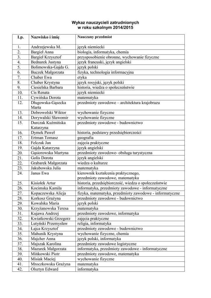 Wykaz nauczycieli zatrudnionych w roku szkolnym 2014/2015 Lp. Nazwisko i imię Nauczany przedmiot 1. język niemiecki biologia, informatyka, chemia przysposobienie obronne, wychowanie fizyczne język francuski, język angielski język polski fizyka, technologia informacyjna etyka język rosyjski, język polski historia, wiedza o społeczeństwie język niemiecki matematyka przedmioty zawodowe – architektura krajobrazu 16. 17. 18. 19. 20. 21. 22. 23. 24. Andrzejewska M. Bargieł Anna Bargieł Krzysztof Bednarek Justyna Bolimowska-Gajda G. Buczek Małgorzata Chaber Ewa Chaber Krystyna Ciesielska Barbara Cis Renata Cywińska Dorota Długowska-Gąsecka Marta Dobrowolski Wiktor Dorywalski Sławomir Durczak Kuźmińska Katarzyna Dymek Paweł Ertman Tomasz Felczak Jan Gajda Katarzyna Gąsiorowska Martyna Golis Dorota Grabarek Małgorzata Jakubowska Julia Janus Ewa 25. 26. 27. 28. 29. 30. 31. 32. 33. 34. 35. 36. 37. 38. 39. 40. 41. 42. Kisiołek Artur Kocimska Kamila Kopaczewska Alicja Korkosz Grażyna Kowalska Maria Krzyżanowska Teresa Kujawa Andrzej Kwiatkowski Grzegorz Lutyński Przemysław Łajca Krzysztof Mahunik Krystyna Majcher Anna Majszak Karolina Mazurek Małgorzata Mińkowski Piotr Misiak Maciej Mroczkowska Grażyna Olsztyn Edward 2. 3. 4. 5. 6. 7. 8. 9. 10. 11. 12. 13. 14. 15. wychowanie fizyczne wychowanie fizyczne przedmioty zawodowe - budownictwo historia, podstawy przedsiębiorczości geografia zajęcia praktyczne język angielski przedmioty zawodowe- obsługa turystyczna język angielski wiedza o kulturze matematyka kierownik kształcenia praktycznego, przedmioty zawodowe, matematyka historia, przedsiębiorczość, wiedza o społeczeństwie informatyka, przedmioty zawodowe - informatyczne fizyka, matematyka, przedmioty zawodowe - informatyczne przedmioty zawodowe - budownictwo język polski matematyka przedmioty zawodowe, informatyka zajęcia praktyczne religia, informatyka przedmioty zawodowe - budownictwo wychowanie fizyczne, chemia język polski, informatyka przedmioty zawodowe logistyczne informatyka, przedmioty zawodowe - informatyczne przedmioty zawodowe, matematyka wychowanie fizyczne matematyka informatyka Lp. Nazwisko i imię 43. 44. 45. 46. 47. 48. 49. 50. 51. 52. 53. 54. 55. 56. 57. 58. 59. 60. 61. 62. 63. 64. 65. 66. 67. Opala Bogdan Orzeszek Gabriela Ostrzyżek Katarzyna Pakulska Iwona Panek Krystyna Pawlak Alicja Pawłowska Justyna Piotrowski Krzysztof Pisarek Katarzyna Prokocki Krzysztof Radożycka Marianna Rymarz Krzysztof Seklecki Jakub Siepka Agnieszka Sobieraj Lucyna Sokołowski Sławomir Stachlewska Iwona Szczepańska Magdalena Świnoga Anna Wasilewska Monika Ks. Wieczorek Tomasz Wódka Maciej Woźnica Paulina Wrocławska Nell Zalewska Karolina zajęcia praktyczne język angielski matematyka wychowanie fizyczne język angielski język polski przedmioty zawodowe logistyczne zajęcia praktyczne język angielski przedmioty zawodowe język rosyjski, wychowanie do życia w rodzinie przedmioty zawodowe - informatyczne wychowanie fizyczne biologia, geografia historia, wiedza o społeczeństwie informatyka, fizyka religia język niemiecki wychowanie do życia w rodzinie język angielski religia przedmioty zawodowe mechaniczne wychowanie fizyczne religia przedmioty zawodowe – architektura krajobrazu