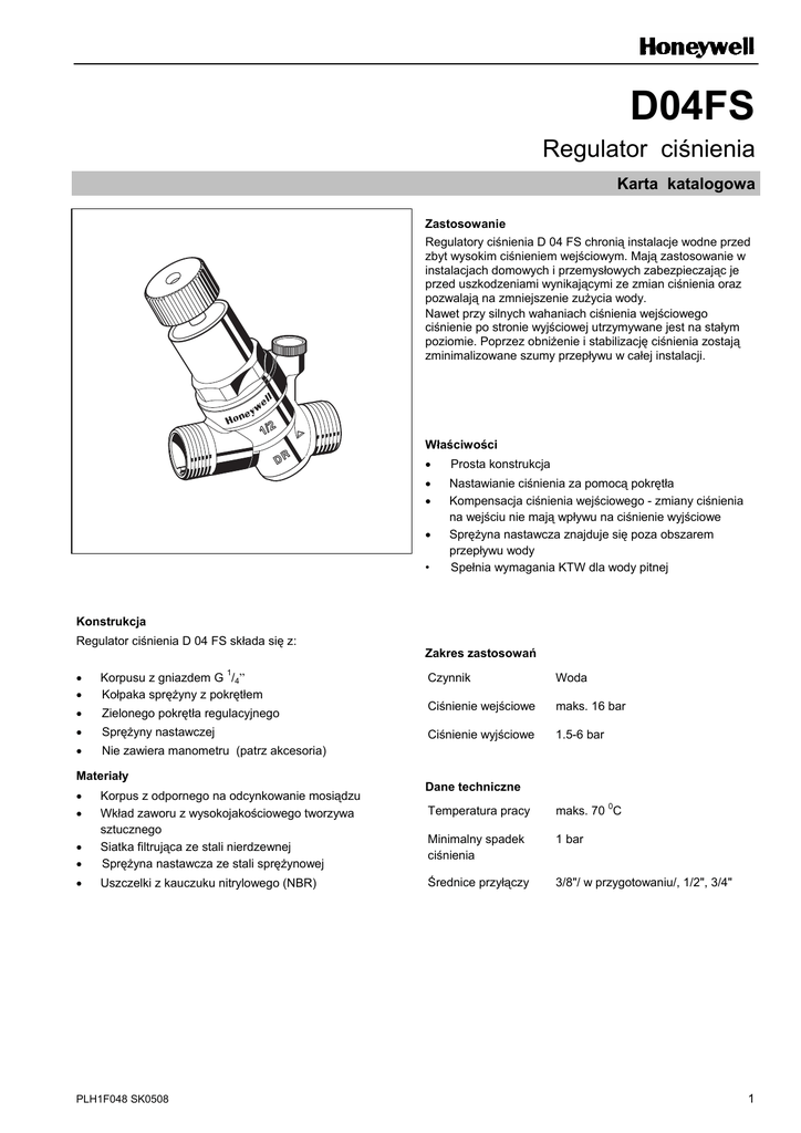 D04FS Regulator ciśnienia Karta katalogowa Zastosowanie Regulatory ciśnienia D 04 FS chronią instalacje wodne przed zbyt wysokim ciśnieniem wejściowym. Mają zastosowanie w instalacjach domowych i przemysłowych zabezpieczając je przed uszkodzeniami wynikającymi ze zmian ciśnienia oraz pozwalają na zmniejszenie zużycia wody. Nawet przy silnych wahaniach ciśnienia wejściowego ciśnienie po stronie wyjściowej utrzymywane jest na stałym poziomie. Poprzez obniżenie i stabilizację ciśnienia zostają zminimalizowane szumy przepływu w całej instalacji. Właściwości • Prosta konstrukcja • • Nastawianie ciśnienia za pomocą pokrętła Kompensacja ciśnienia wejściowego - zmiany ciśnienia na wejściu nie mają wpływu na ciśnienie wyjściowe Sprężyna nastawcza znajduje się poza obszarem przepływu wody Spełnia wymagania KTW dla wody pitnej • • Konstrukcja Regulator ciśnienia D 04 FS składa się z: 1 • • Korpusu z gniazdem G /4” Kołpaka sprężyny z pokrętłem • Zielonego pokrętła regulacyjnego • Sprężyny nastawczej • Nie zawiera manometru (patrz akcesoria) Materiały • • • • Korpus z odpornego na odcynkowanie mosiądzu Wkład zaworu z wysokojakościowego tworzywa sztucznego Siatka filtrująca ze stali nierdzewnej Sprężyna nastawcza ze stali sprężynowej • Uszczelki z kauczuku nitrylowego (NBR) PLH1F048 SK0508 Zakres zastosowań Czynnik Woda Ciśnienie wejściowe maks. 16 bar Ciśnienie wyjściowe 1.5-6 bar Dane techniczne Temperatura pracy maks. 70 0C Minimalny spadek ciśnienia 1 bar Średnice przyłączy 3/8"/ w przygotowaniu/, 1/2", 3/4" 1 Zasada działania Regulator ciśnienia działa na zasadzie równowagi sił działających na membranę: z jednej strony wynikającej z napięcia sprężyny, a z drugiej strony sił parcia od ciśnienia po redukcji. W przypadku występowania zmiennego ciśnienia wejściowego ruchomy wkład zaworu ustawia się w nowe położenie równowagi dla danej nastawy ciśnienia i ilości odbieranej wody (kompensacja ciśnienia wejściowego). W przypadku ustania poboru wody - zawór całkowicie się domyka. Oznaczenie D04FS-... A = Wykonanie standardowe Wielkość przyłączy Ri 3/8" (w przygotowaniu) Ra 3 Wielkość nominalna DN Waga Wymiary (mm) Wartość kvs /4 " 1/2" 3 3/4" /4 " 1" 10 15 20 kg 0.28 0.29 0.33 L 84 84 88 h 82.7 82.7 82.7 H 106 106 106 2.7 2.9 m3/h Akcesoria M38K Manometr Obudowa 50 mm, przyłącze dolne gwintowane G1/4". Zakresy: 0 - 4, 0 - 10, 0 - 16 or 0 - 25 bar. M38K Honeywell Sp. z o.o. ul. Domaniewska 39 B 02-672 Warszawa tel. (22) 606 09 00; fax (22) 606 09 01 Przy zamówieniu należy podać zakres Honeywell Sp. z o.o. Biuro regionalne ul. Piecewska 27 80-288 Gdańsk tel./fax (58) 345 77 72. Honeywell Sp. z o.o. Biuro regionalne ul. Staszica 2/3 60-527 Poznań tel./fax (61) 843 55 89 Honeywell Sp. z o.o. Biuro regionalne ul. Kosmonautów 2 47-220 Kędzierzyn Kożle tel./fax (77) 483 32 94 http://www.honeywell.com.pl/automatyka_domow 2 PLH1F048 SK0508