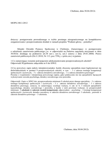 Chełmno, dnia 30.04.2012r. MOPS.340.3.2012 dotyczy: postępowania prowadzonego w trybie przetargu nieograniczonego na kompleksowe zorganizowanie i przeprowadzenie działań w ramach projektu "Podnieś głowę – potrafisz". Miejski Ośrodek Pomocy Społecznej w Chełmnie, Zamawiający w postępowaniu o udzielenie zamówienia publcznego j.w. w odpowiedzi na Państwa zapytania otrzymane w dniu 30.04.br. działając na podstawie art.38 ust.1, ust.1a, ust.2 ustawy z dnia 29.01.2004r. Prawo zamówień publicznych (Dz.U.2010, Nr 113, poz.759t.j. z późn.zm.) wyjaśnia: 1.Co zamawiający rozumie pod pojęciem udokumentowanie przeprowadzonych szkoleń? Odpowiedź:Wypełnienie załącznika nr 8 do SIWZ. 2.Czy powyższy zapis należy interpterowaćjako: każdy złoszony specjalista musi legitymować się doświadczeniem w postaci 9 przeprowadzonych szkoleń, w tym – 3 z zakresu treningu kompetencji społecznych i życiowych, - 3 z zakresu doradztwa zawodowego, - 3 z zakresu doradztwa prawnego? Prosimy o wyjaśnienie i interpretację powyższego zapisu, gdyż praktycznie nie ma specjalistów łączących wykonywanie zawodu psychologa, doradcy zawodowego oraz prawnika. Odpowiedź: Zapis w SIWZ dot. przeprowadzenia minimum 9 szkoleń przez danego specjalistę – 3 z zakresu treningu kompetencji społecznych i życiowych, - 3 z zakresu doradztwa zawodowego, - 3 z zakresu doradztwa prawnego, oznacza, że zamawiający oczekuje wykazu, w zał. nr 8, 3 różnych specjalistów tj.pyschologa, doradcy zawodowego i prawnika, a każdy z nich powinien wykazać, że przeprowadził minimum 3 szkolenie w zakresie swoich kompetencji, odpowiednio – psycholog – 3 treningi kompetencji społecznych i życiowych, doradca zawodowy w zakresie doradztwa zawodowego- 3 szkolenia , prawnik w zakresie doradztwa prawnego – 3 szkolenia. Chełmno, dnia 30.04.2012r. MOPS.340.2.2012 dotyczy: postępowania prowadzonego w trybie przetargu nieograniczonego na kompleksowe zorganizowanie i przeprowadzenie działań w ramach projektu "Podnieś głowę – potrafisz". Miejski Ośrodek Pomocy Społecznej w Chełmnie, Zamawiający w postępowaniu o udzielenie zamówienia publcznego j.w. w odpowiedzi na Państwa zapytania otrzymane w dniu 27.04.br. działając na podstawie art.38 ust.1, ust.1a, ust.2 ustawy z dnia 29.01.2004r. Prawo zamówień publicznych (Dz.U.2010, Nr 113, poz.759t.j. z późn.zm.) wyjaśnia: 1.w punkcie 3 SIWZ czytamy:"Wykonawca zobowązany jest wykazać doświadczenie zawodowe osób realizujących zamówienie poprzez udokumentowanie minimum 9 szkoleń przez danego specjalistę:-3 z zakresu treningu kompetencji społecznych i życiowych, - 3 z zakresu doradztwa zawodowego, - 3 z zakresu doradztwa prawnego. Nie wskazuje tu Pani, kto miałby prowadzić trening kompetencji społecznych i życiowych. Natomiast w wyajśnieniu do SIWZ, które ukazało się 24.04.br. wskazane jest, aby trening kompetencji społecznych i życiowych prowadzony był przez psychologa. Proszę o odpowiedź na pytanie przez jakiego specjalistę ma być przeprowadzony trening kompetencji społecznych i życiowych? Odpowiedź: Trening kompetecji społecznych i życiowych winien być prowadzony przez psychologa. 2.W ramach Programu Aktywności Loalnej wymieniony jest również Trening kompetecji społecznych i życiowych w ilości 15h (punkt 5 SIWZ). Proszę o odpowiedź na pytanie: Przez jakiego specjalistę ma być przeprowadzony trening kompetecji społecznych i życiowych? Odpowiedź: Trening kompetecji społecznych i życiowych w ramach Programu Aktywności Lokalnej winien być prowadzony przez psychologa.